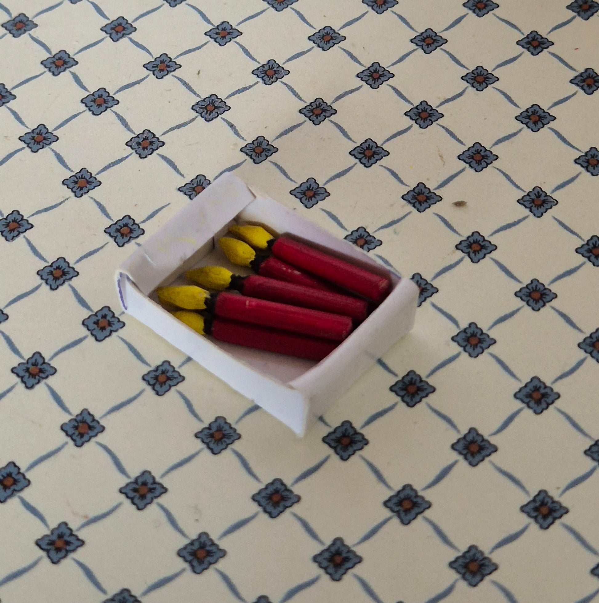 Åben æske med lys. De er hjemmelavet af træ. De er ca 1,5 cm lange.