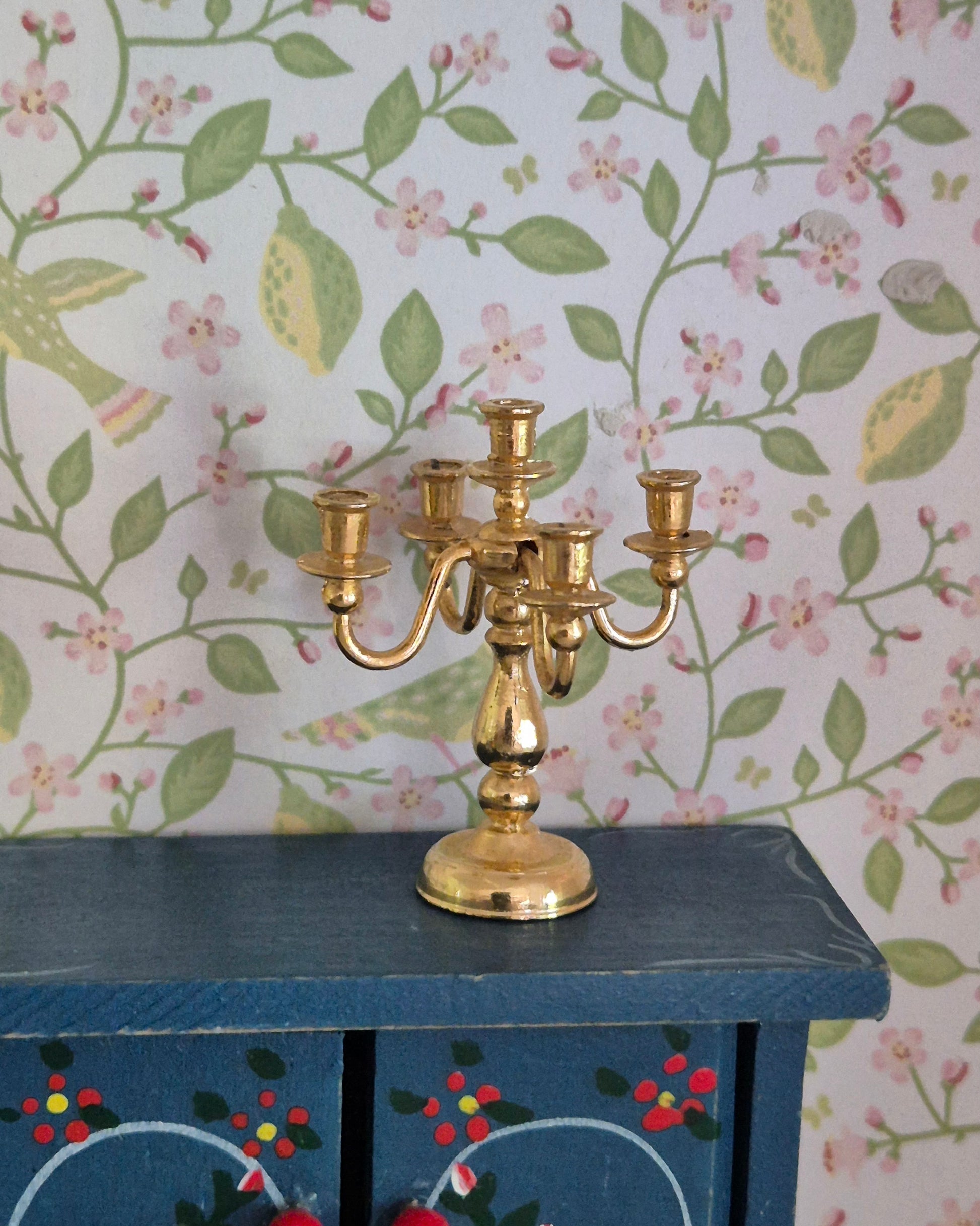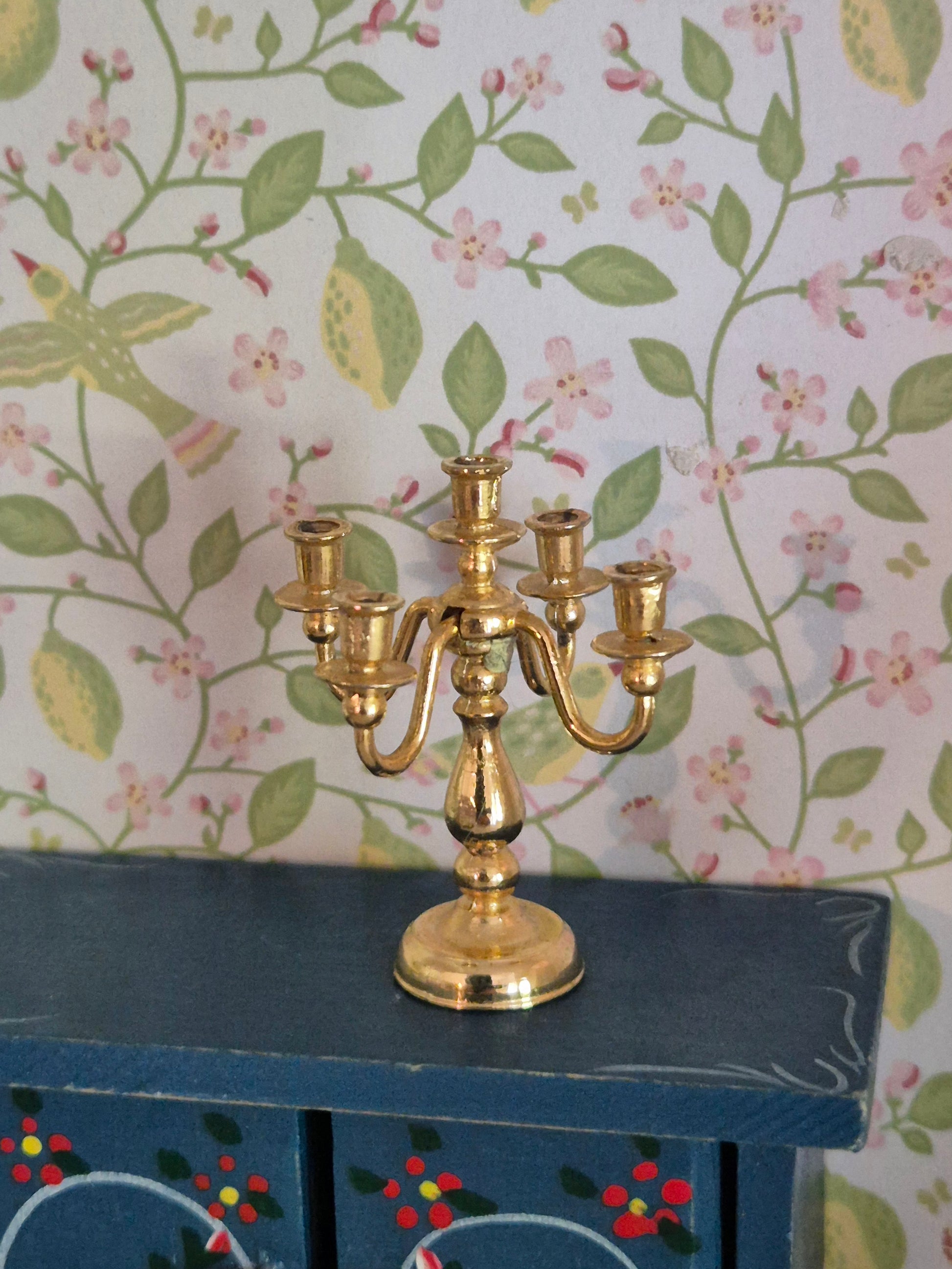 Pæn lysestage i gyldent metal. God fin stand. Passer til 1:12 og evt som gulvstage til 1:16.