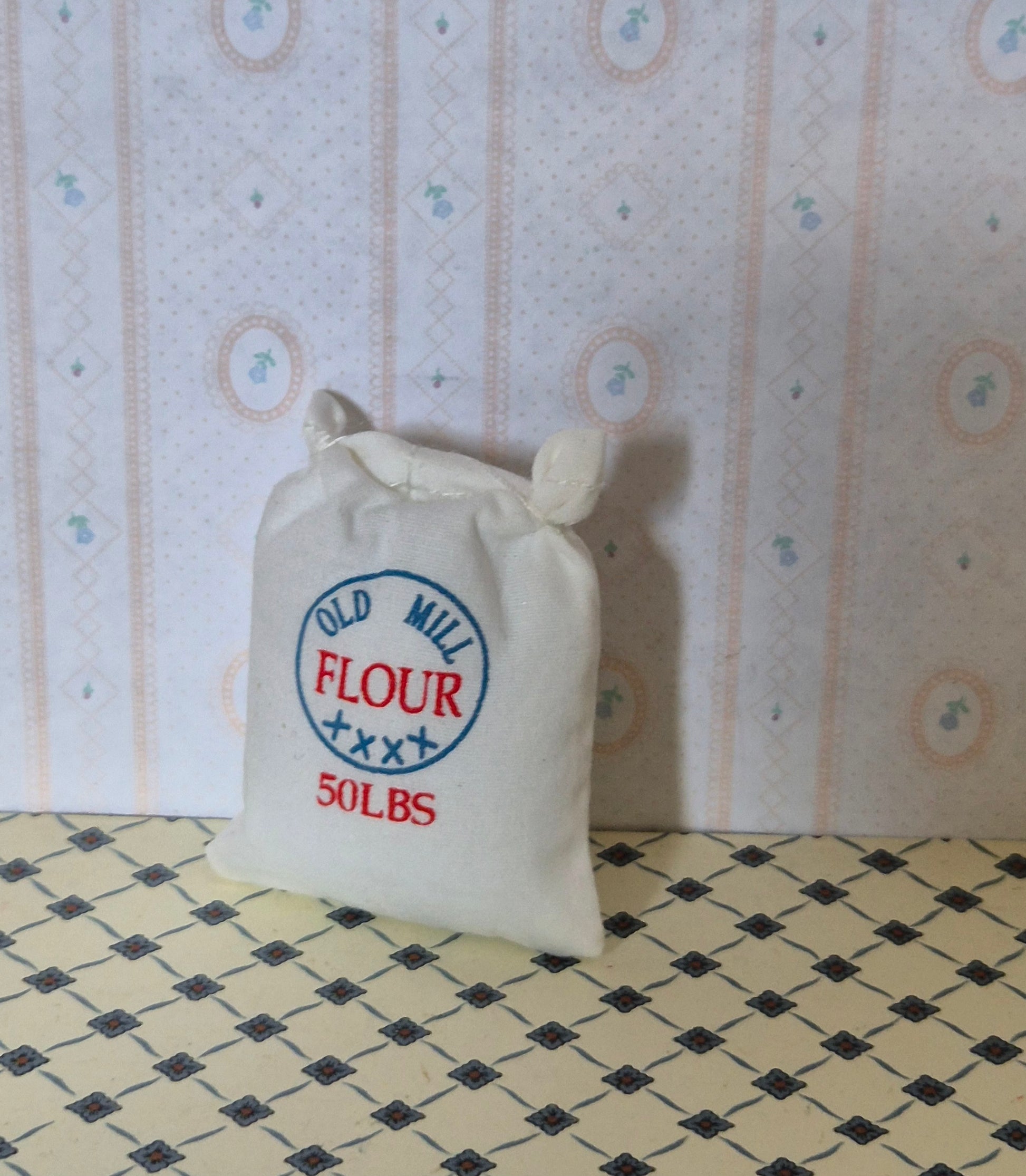 Pæn sæk med mel. Den er ca 6,3 cm høj.
