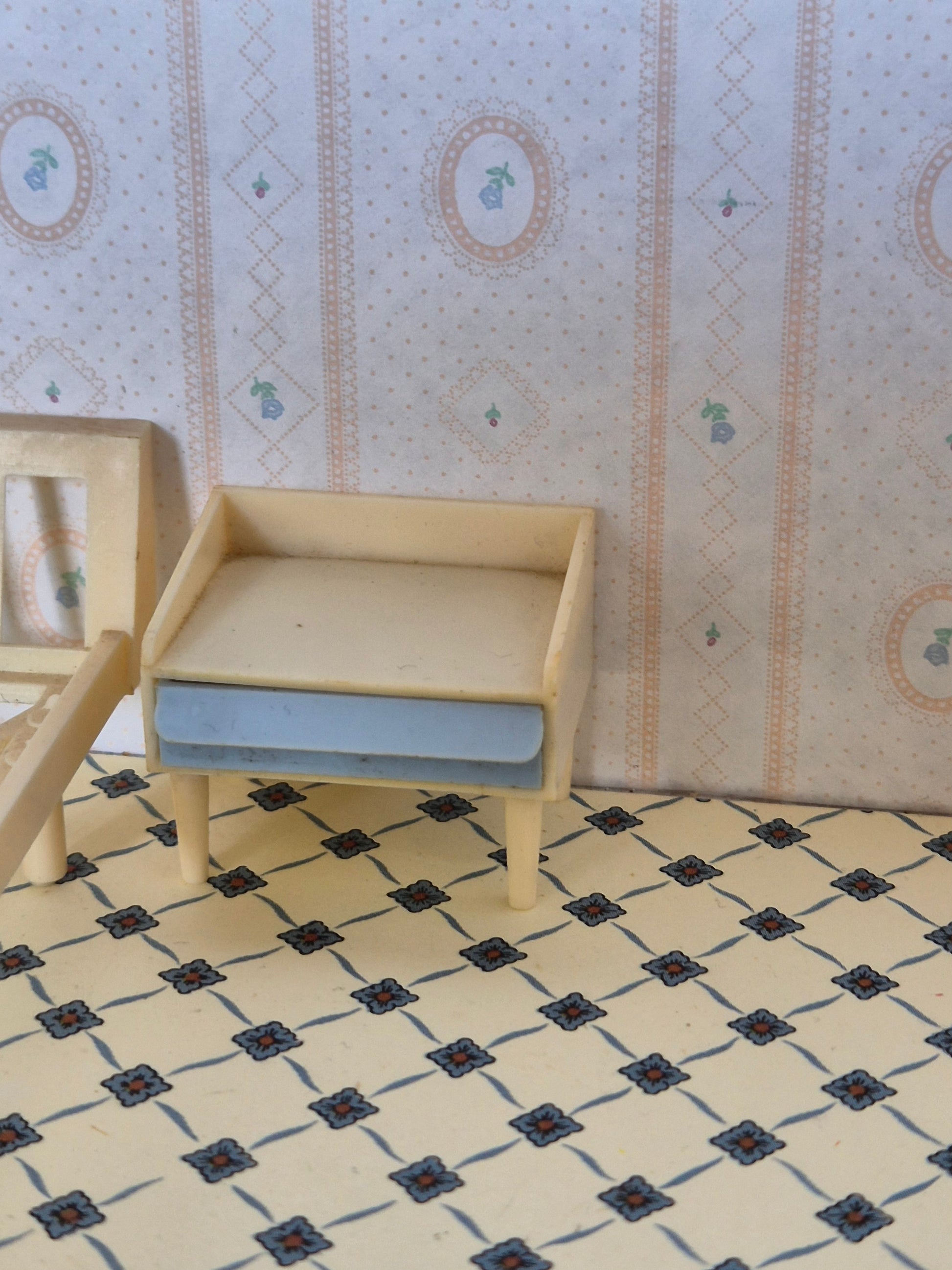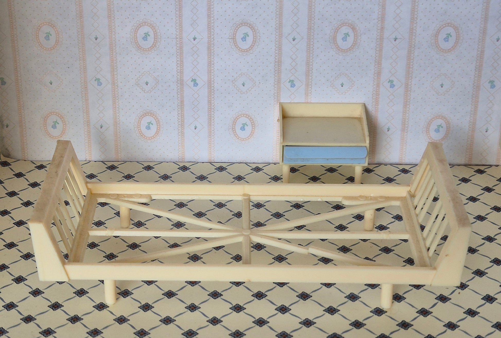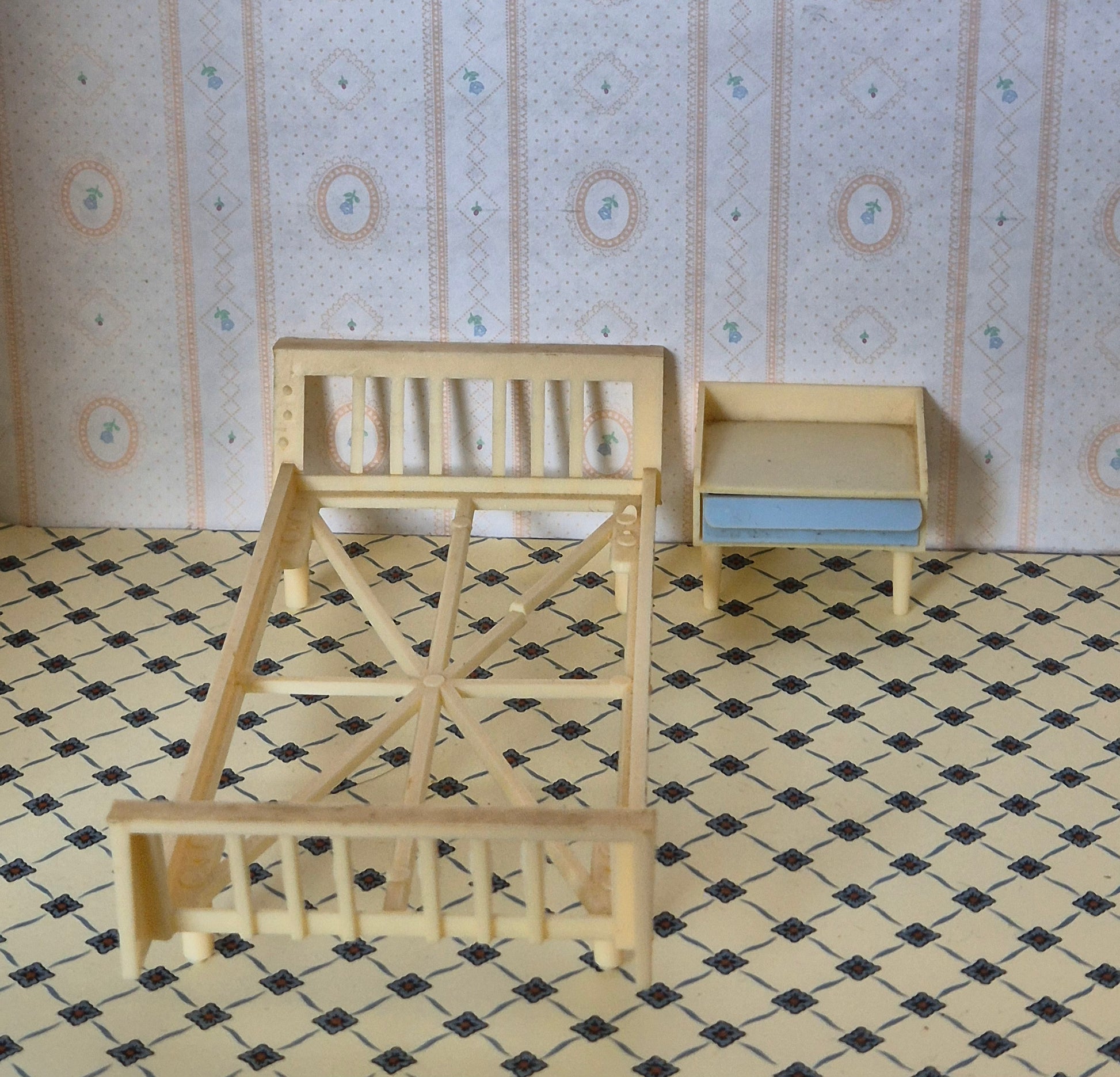 Vintage 1:16 Modella seng og natbord sæt. Mangler sengelinned. Det er plast med patina