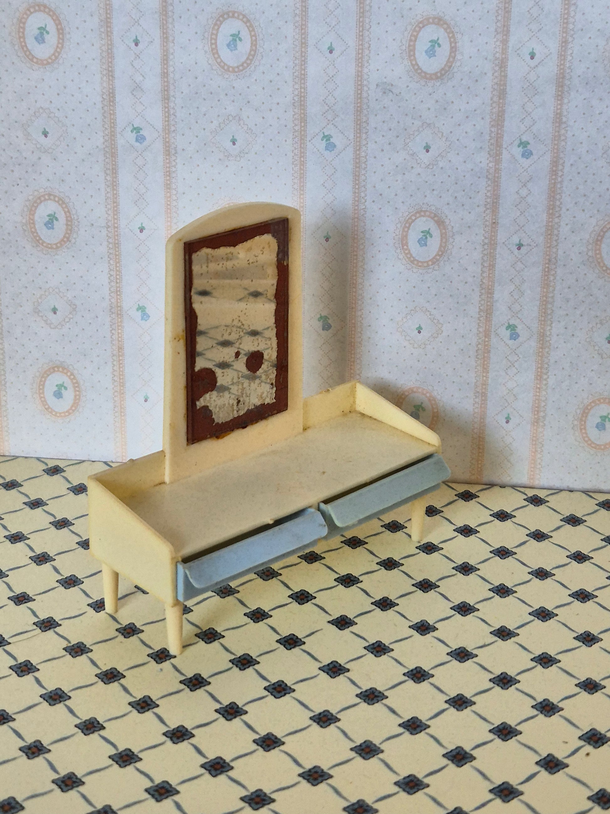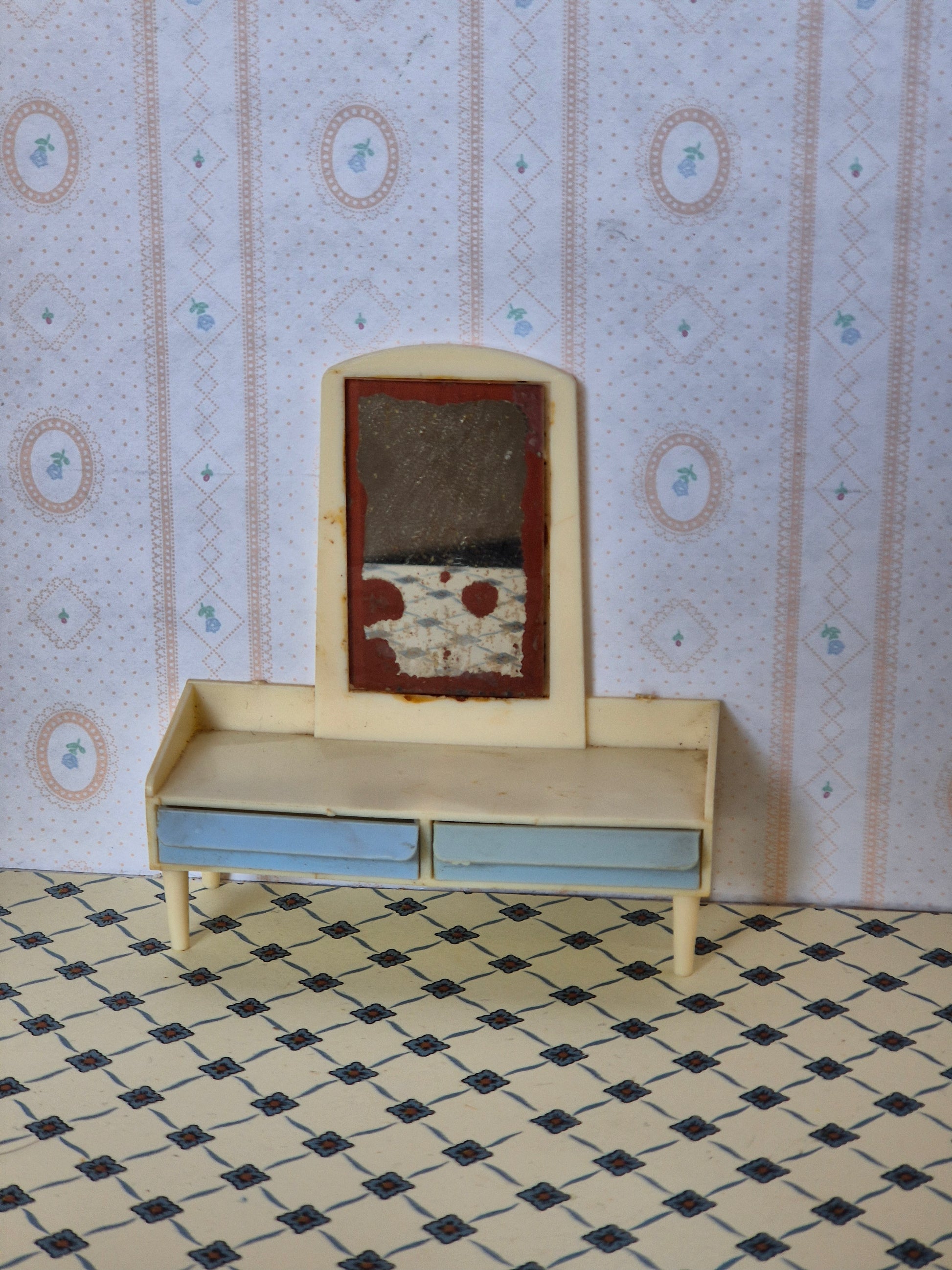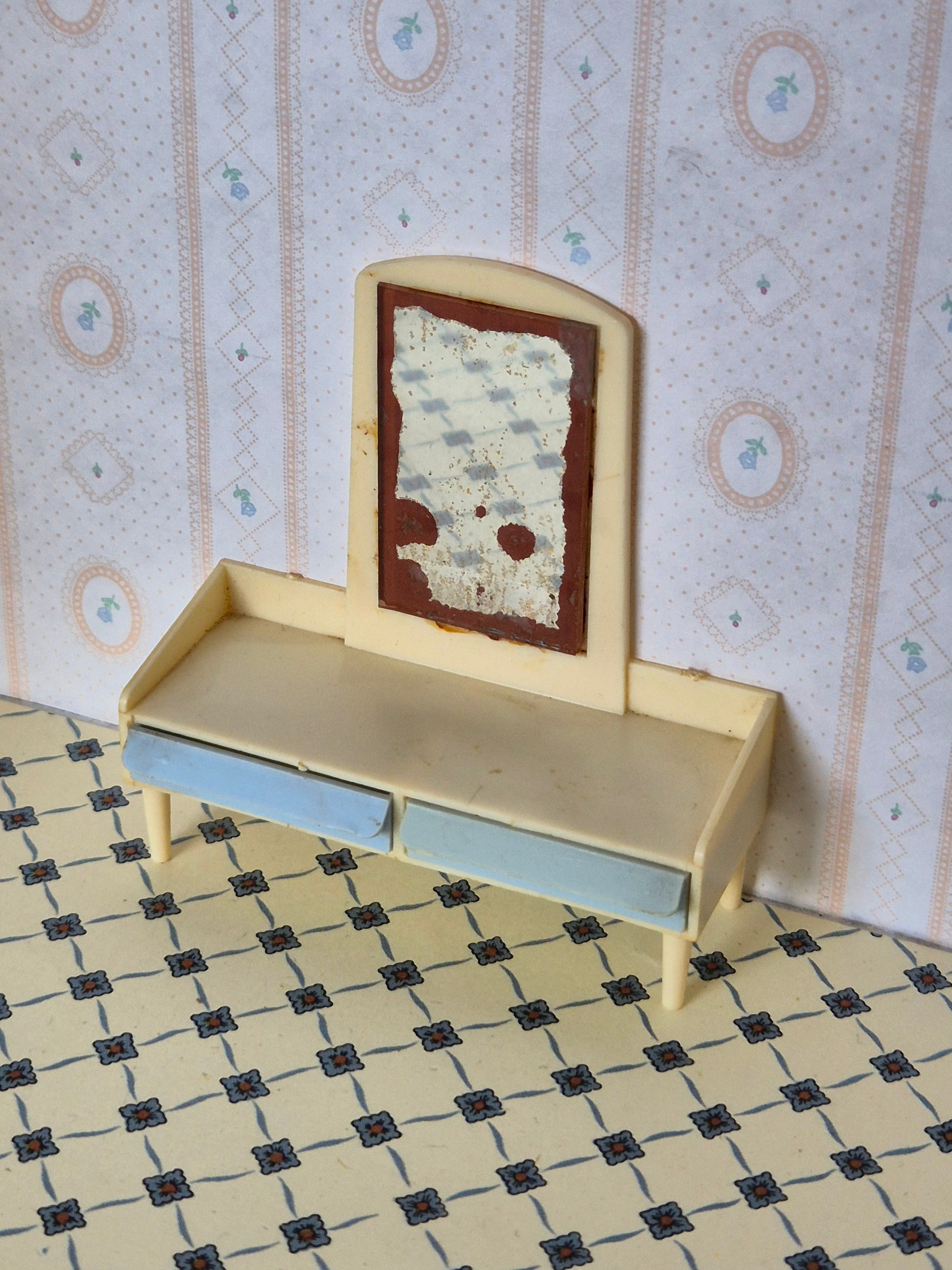 Vintage 1:18 Modella sminkebord med meget patina, især på spejlet.
