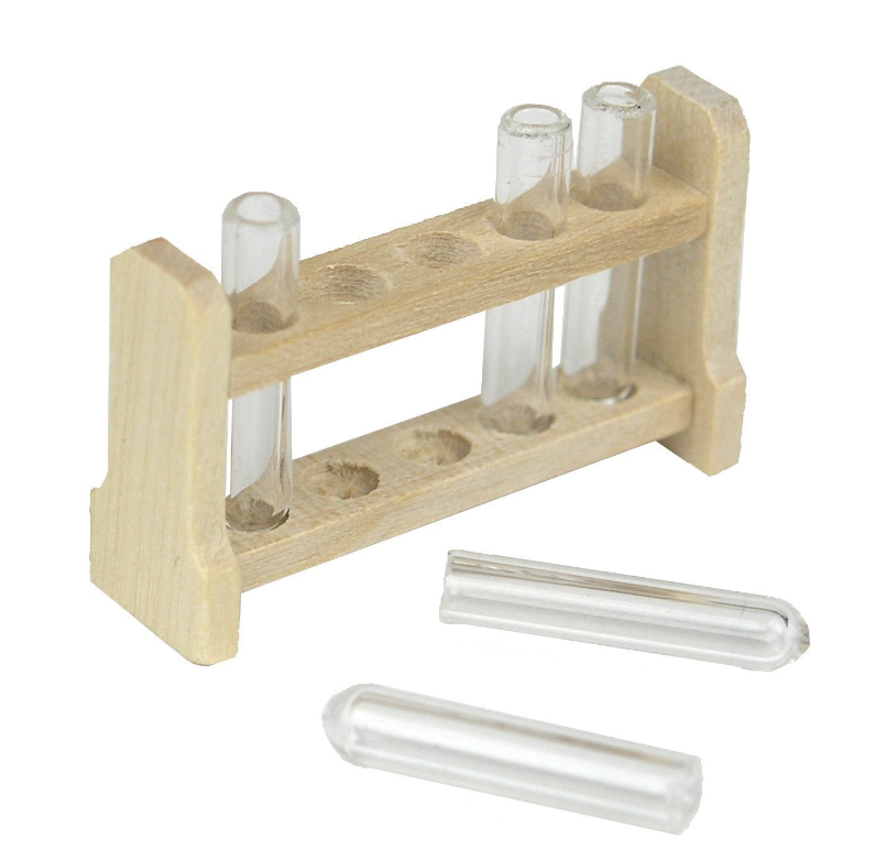 Very nice wooden holder with 4 glass test tubes. It is a nice accessory for the laboratory or the mad scientist, hospital or similar.
