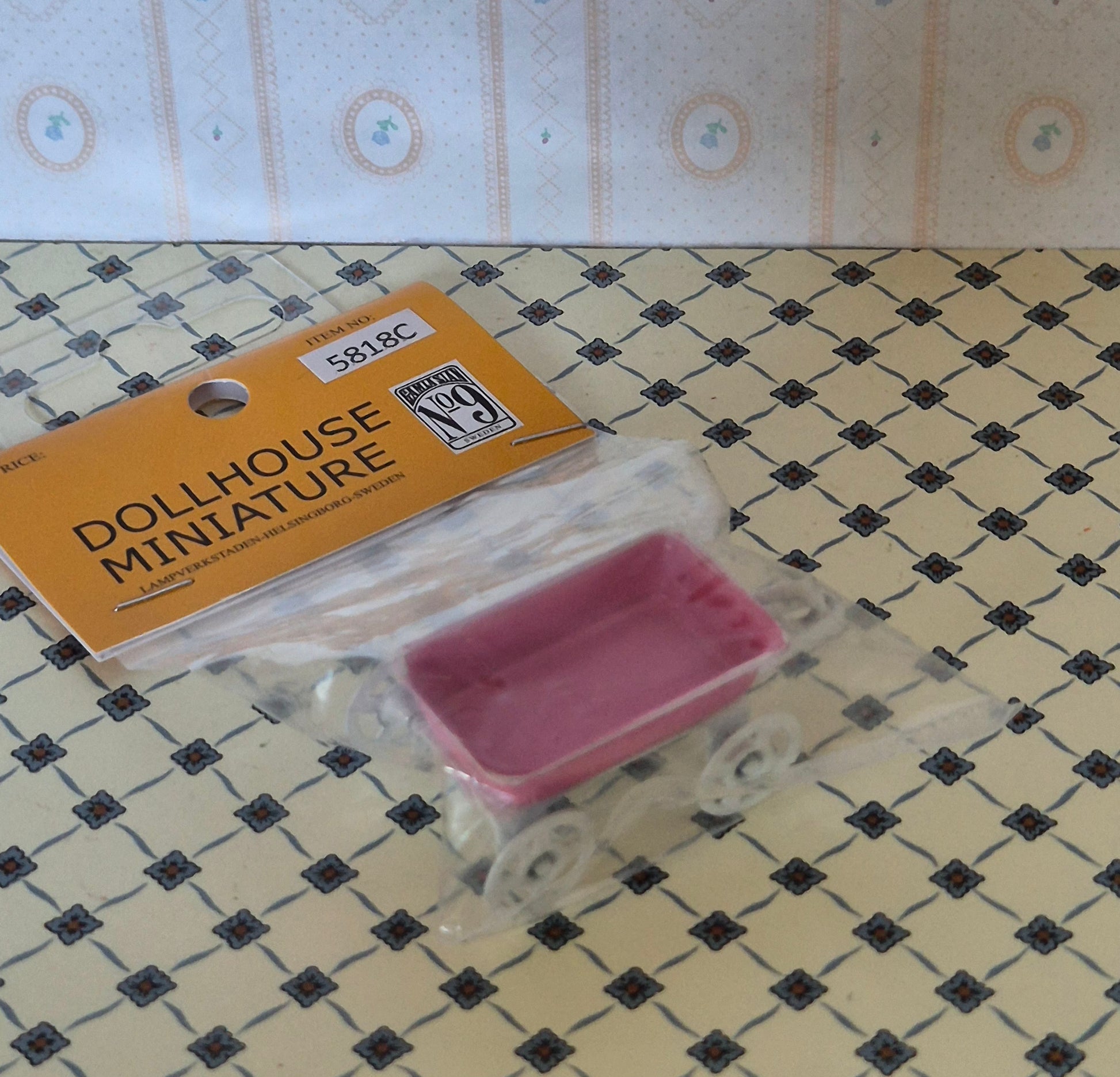 Pæn ny lyserød trækvogn. Den er af metal.