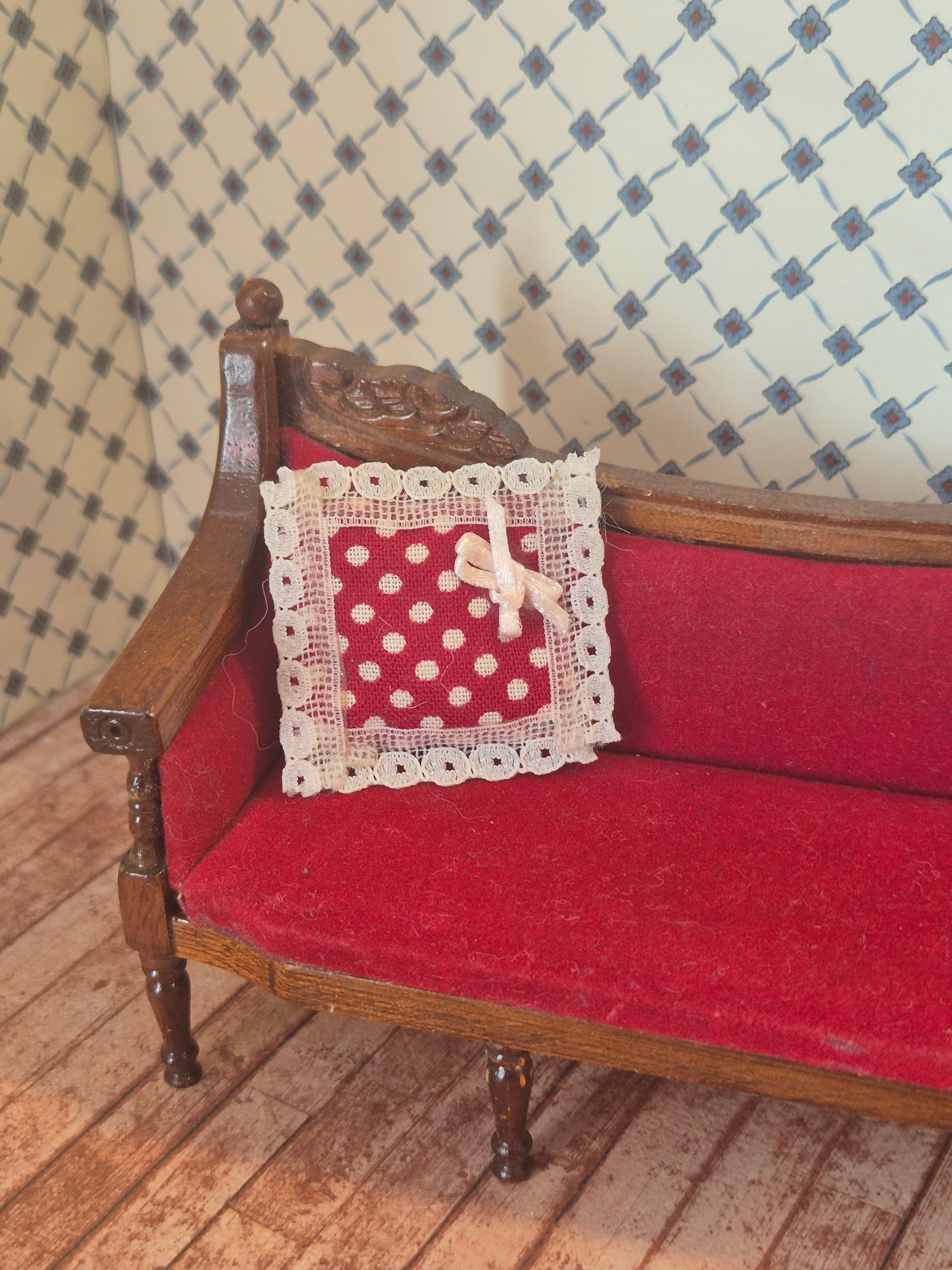Pæn rød pyntepude med blonder, hvide prikker og sløjfe.