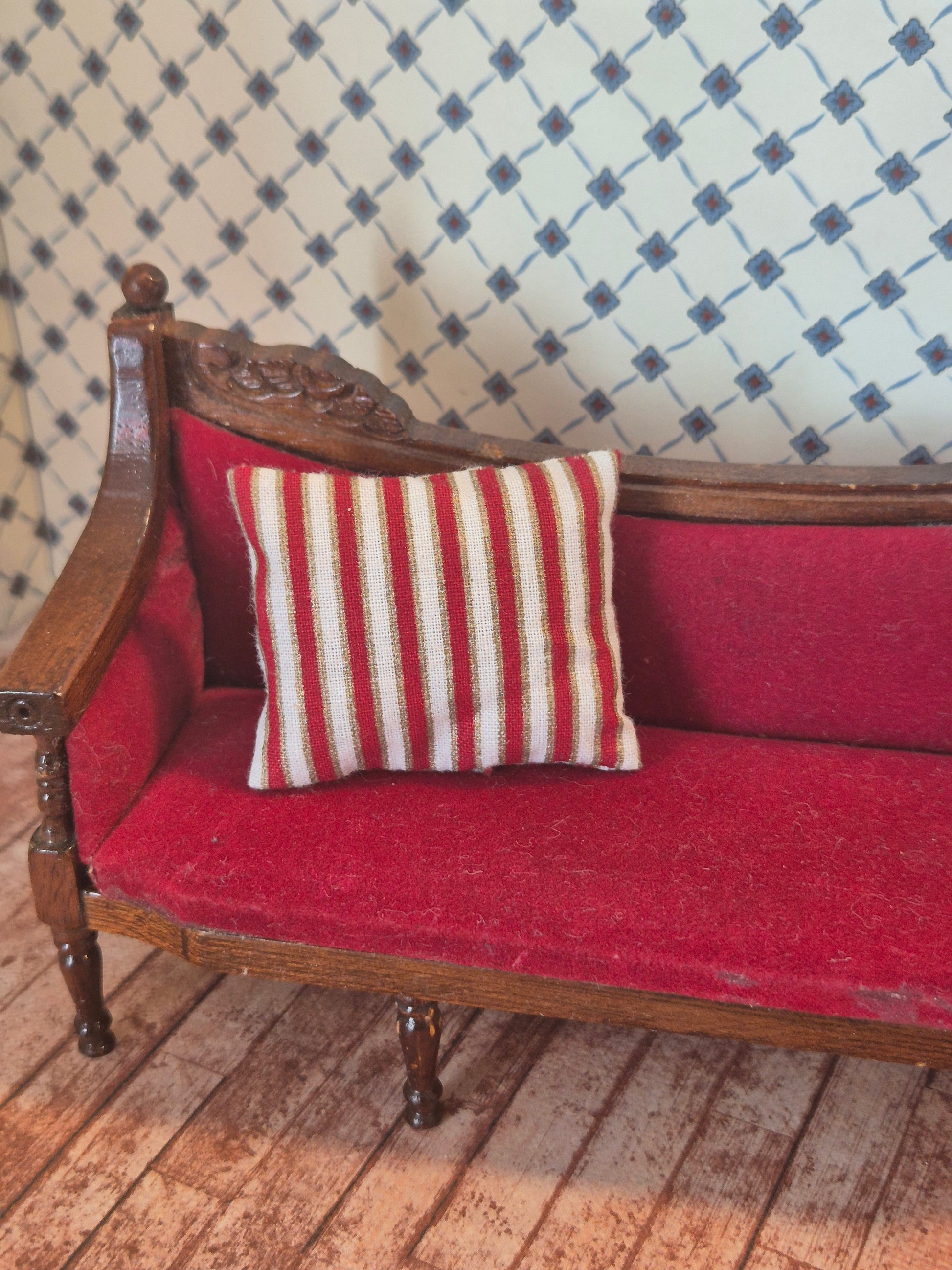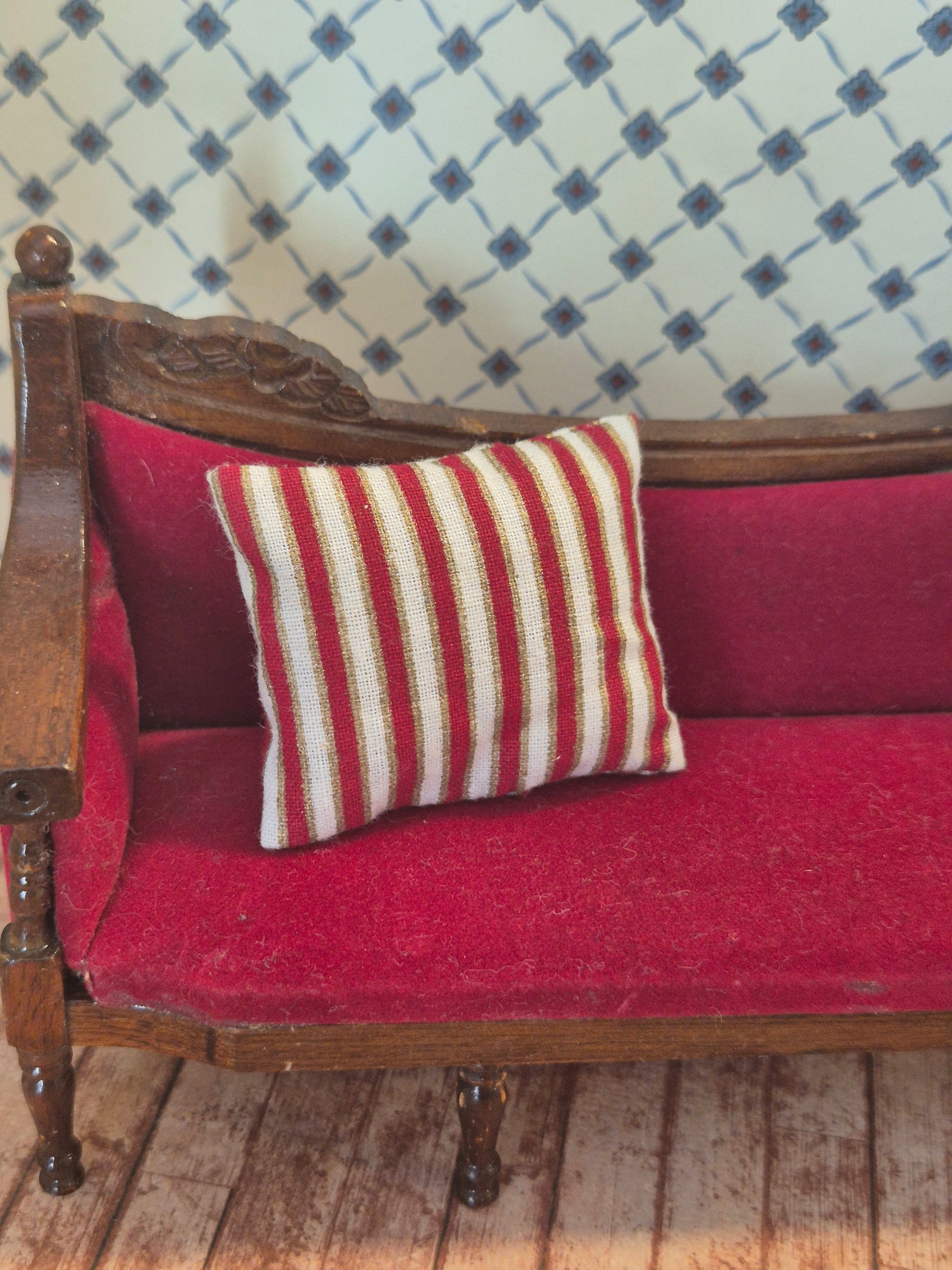 Pæn pude i rød, gyldne og hvide striber.
