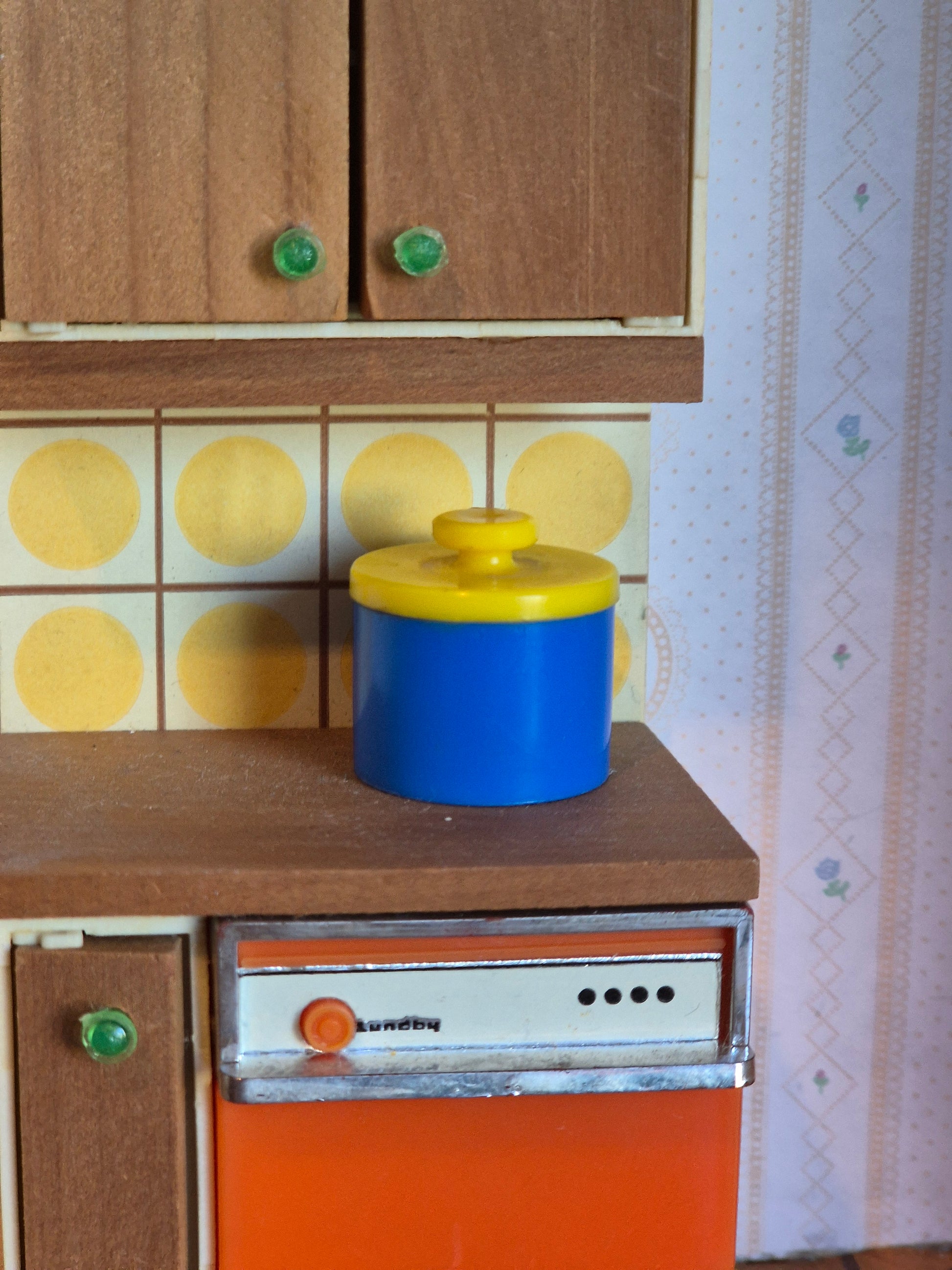 Pæn retro bøtte i blå med gult låg. Opbevaringbøtte i plast. Passer til 1:16 - 1:12. Køkkenudstyr.