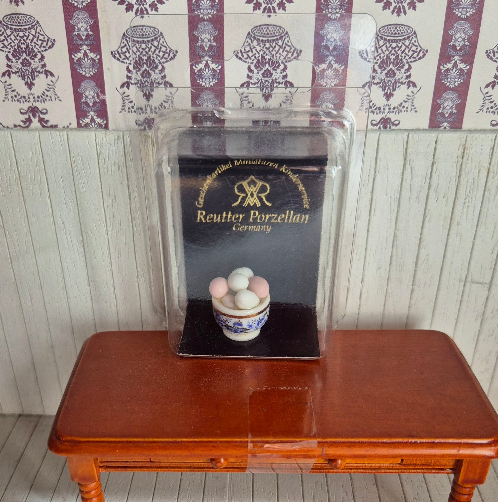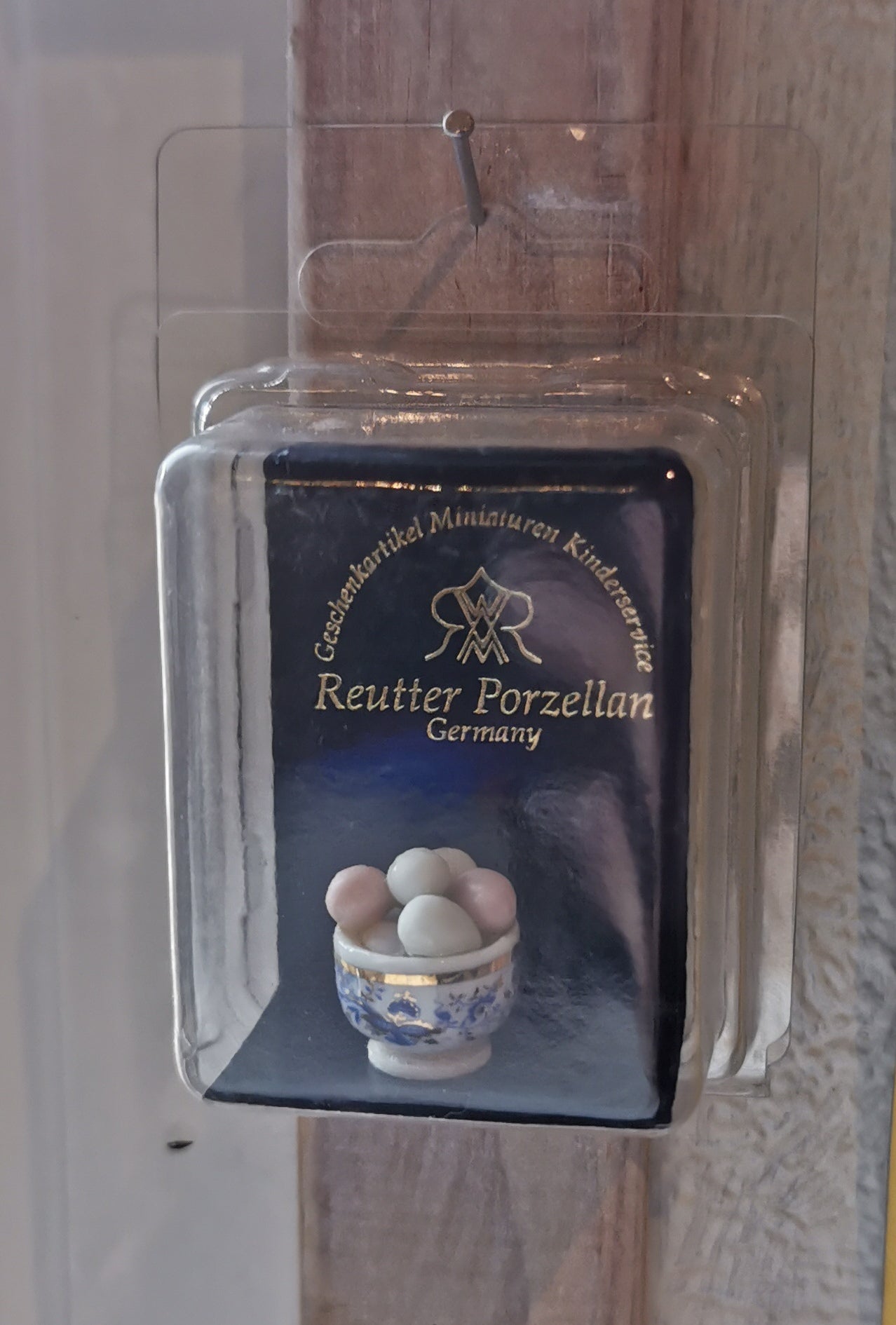 Reutter Porzellan small box with bowl of eggs. It is a blue onion gold bowl.