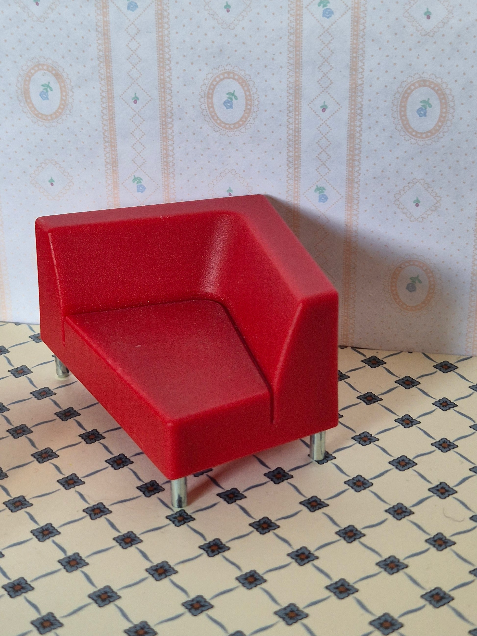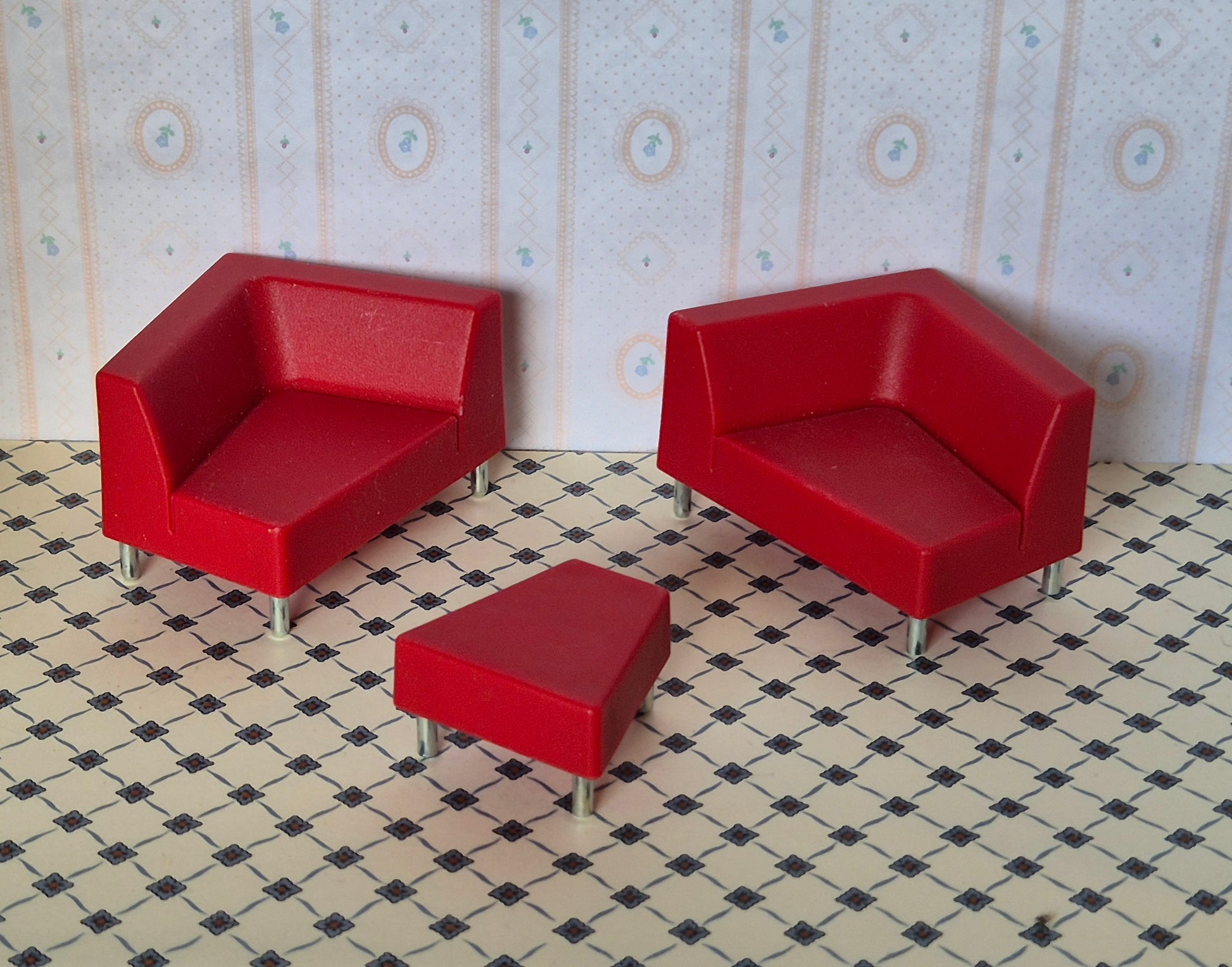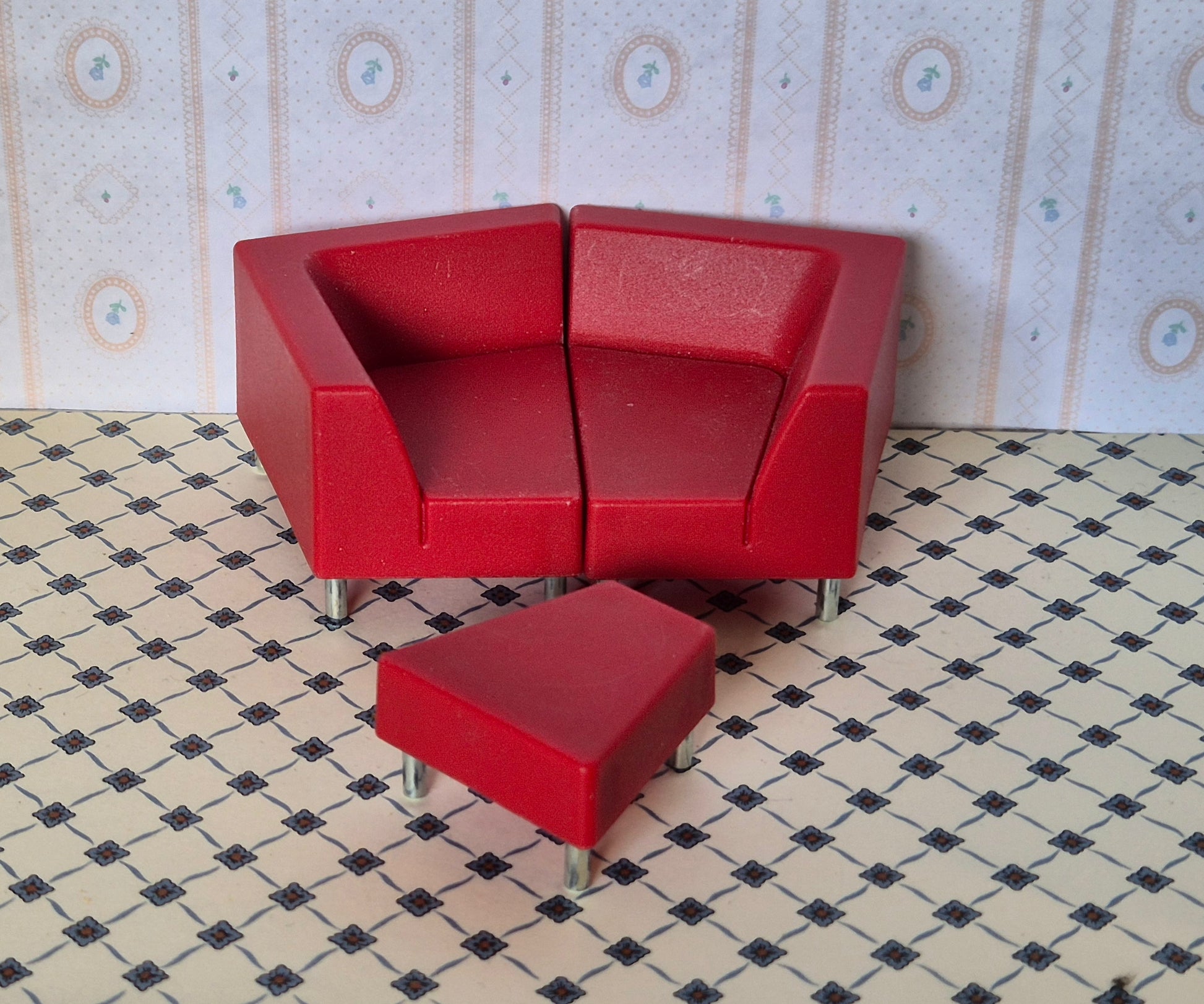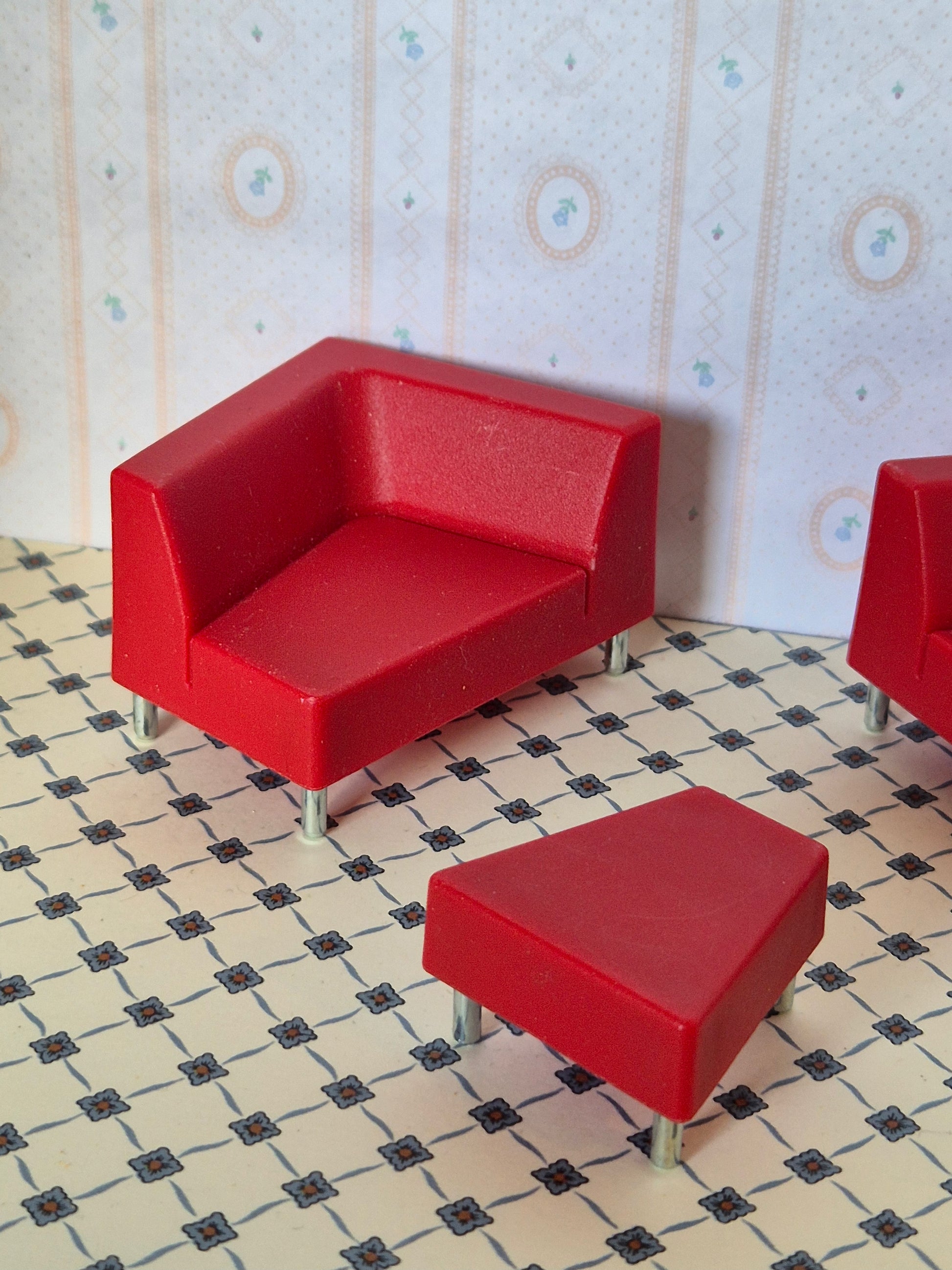 Sæt af røde plast dukkehusmøbler, enkelt stole, der kan sættes sammen til større lænestol eller sofa-lignende møbel.