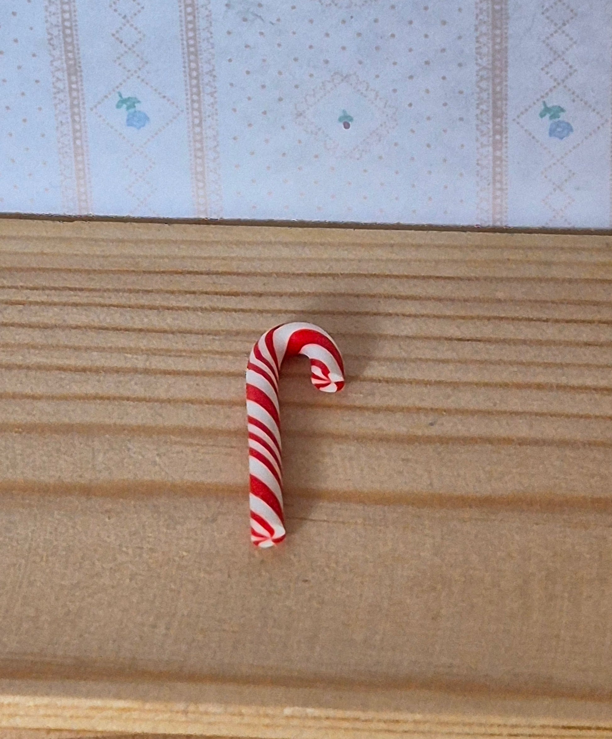 Slikstok i rød og hvid. Den er ca 2,7 cm.