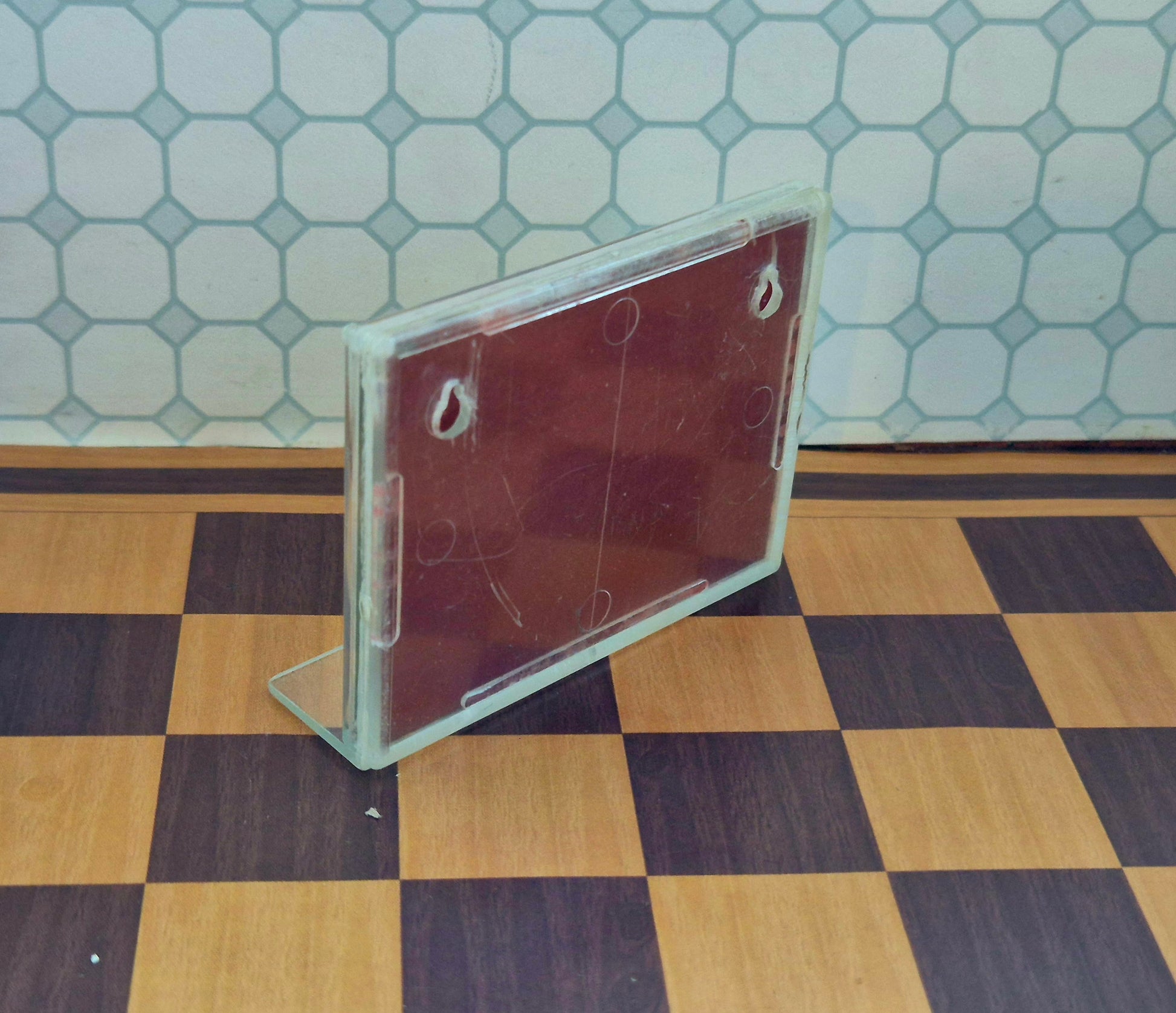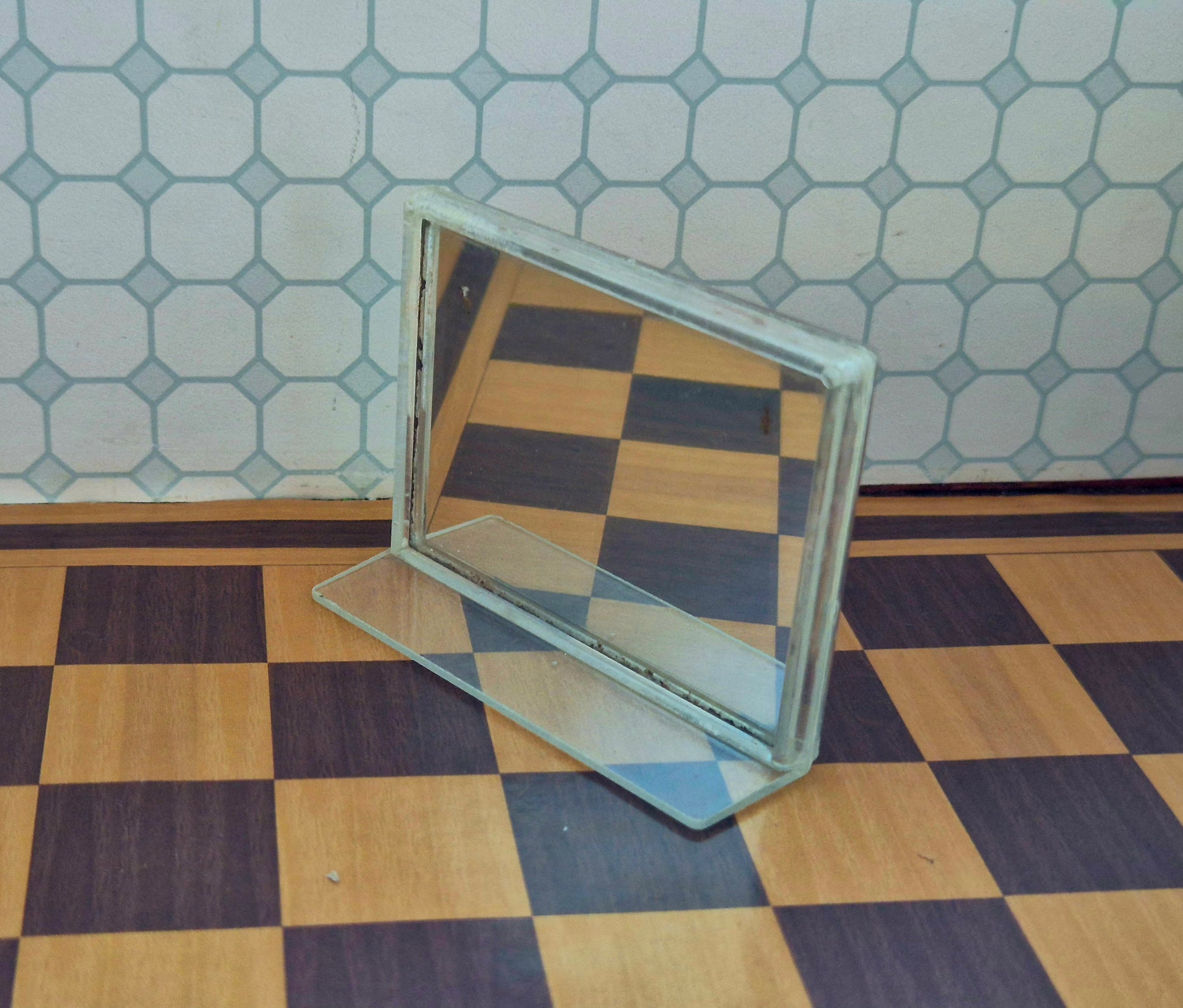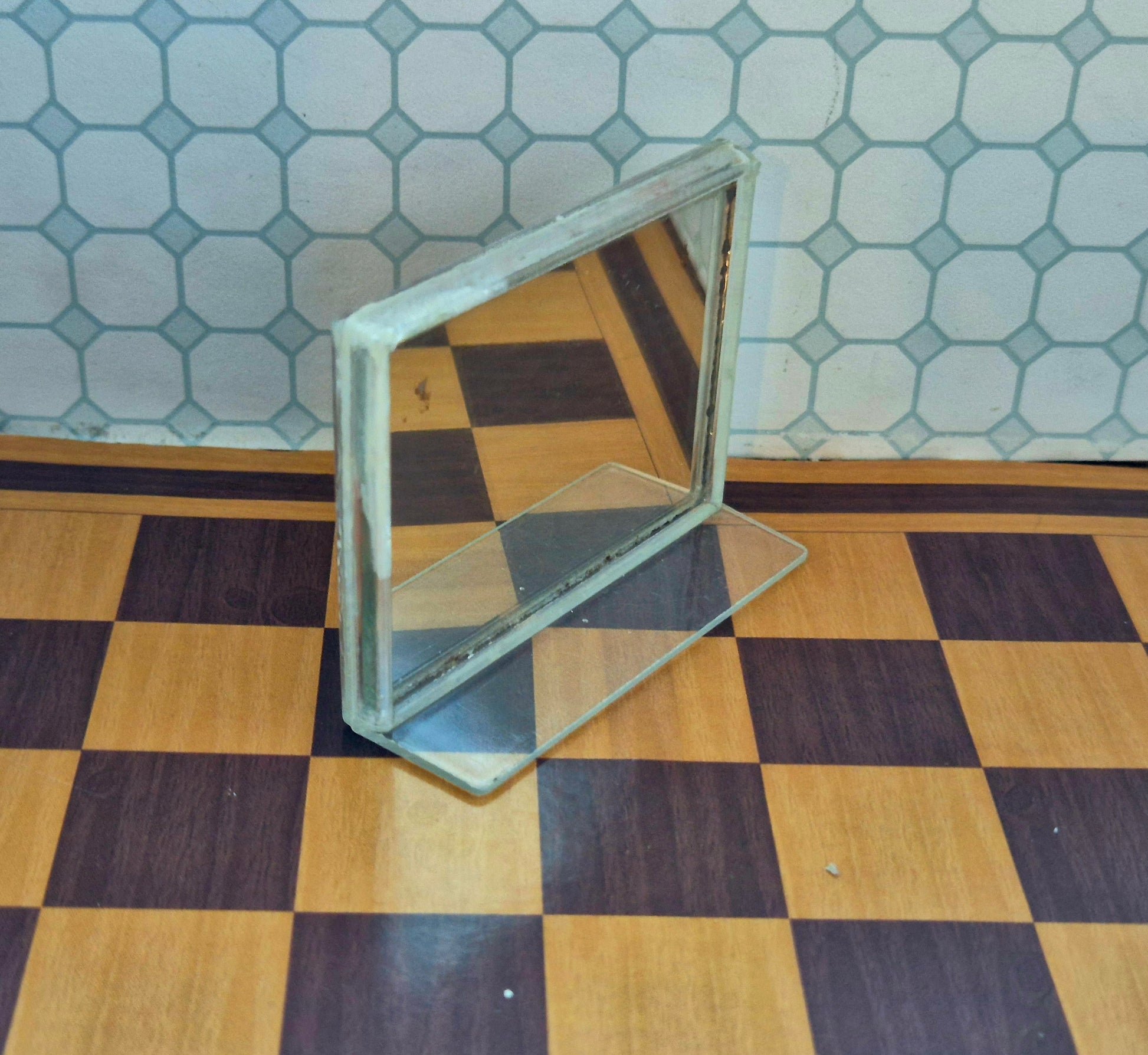 Pænt vintage spejl med hylde, væg ophæng, af plastik. Udmærket stand med patina.