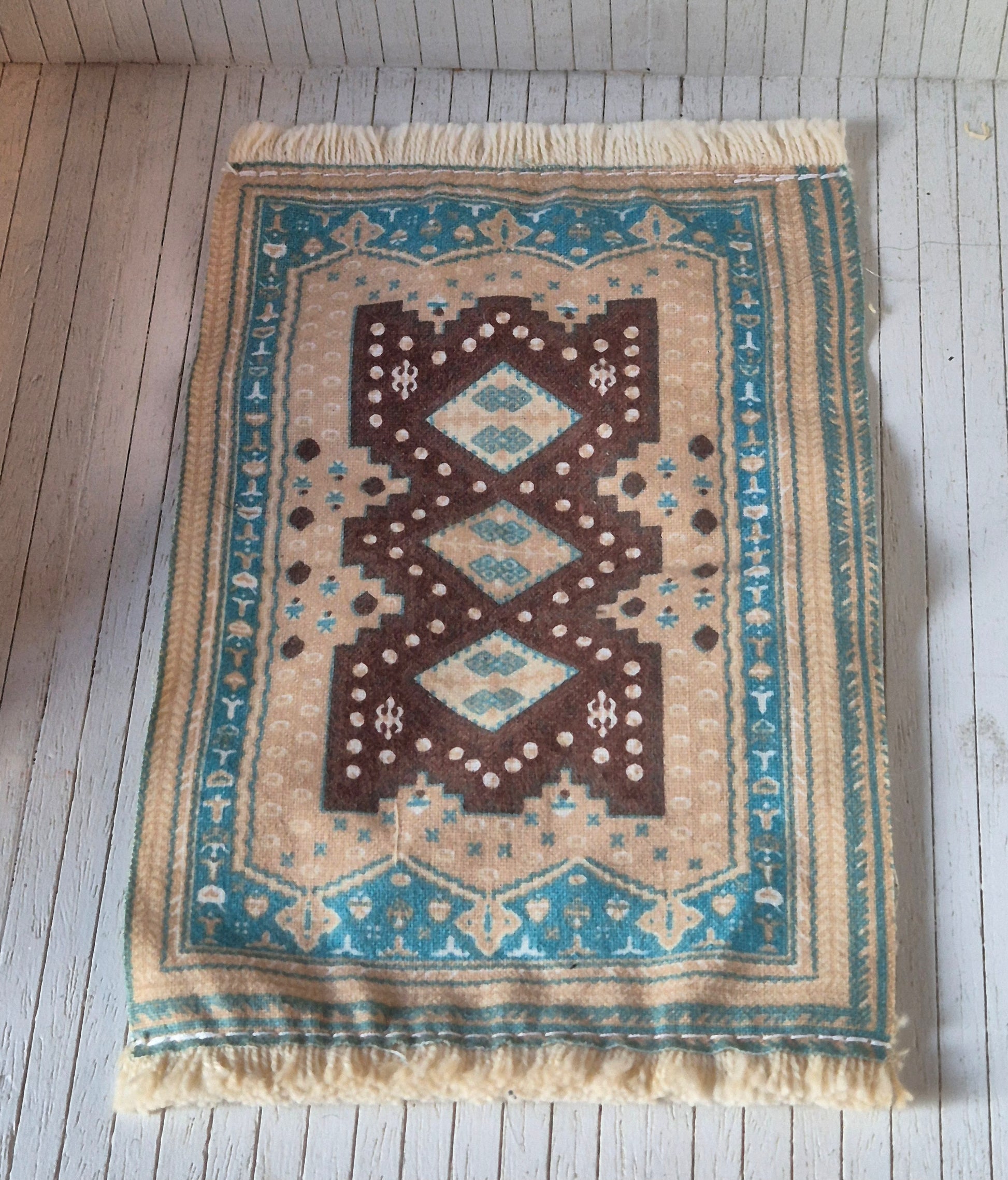 Lyseblå og brunt tæppe med mønster. Det er ældre, men i OK stand.