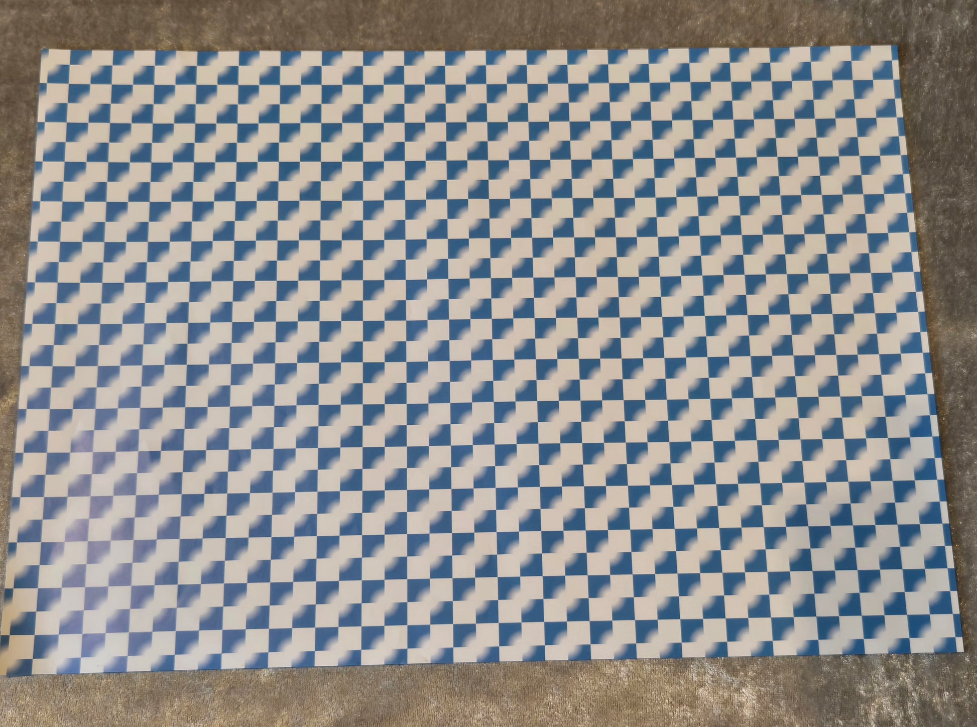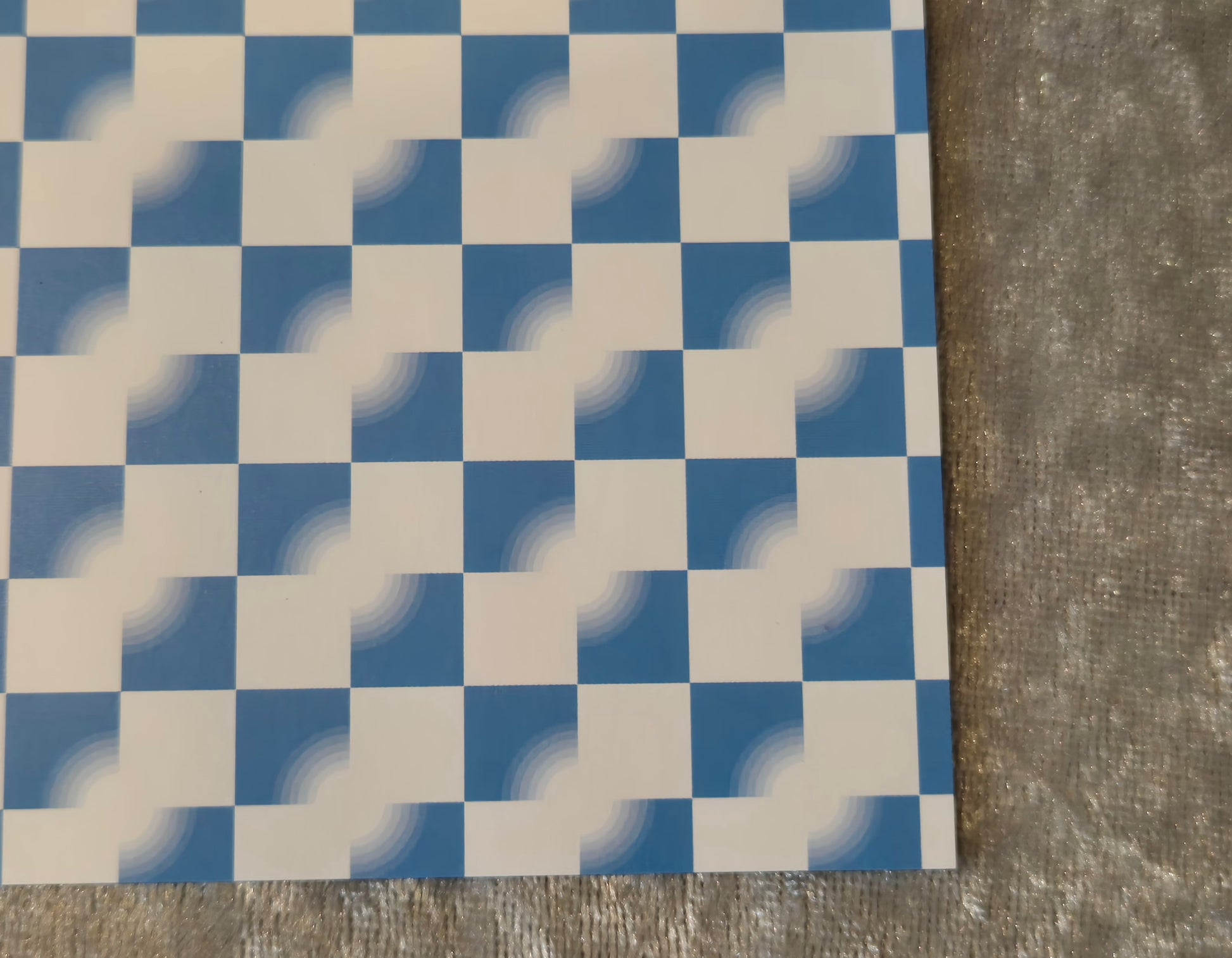 Ark tapet til dukkehuset, ternet i hvid og blå. Det har en glat overflade.