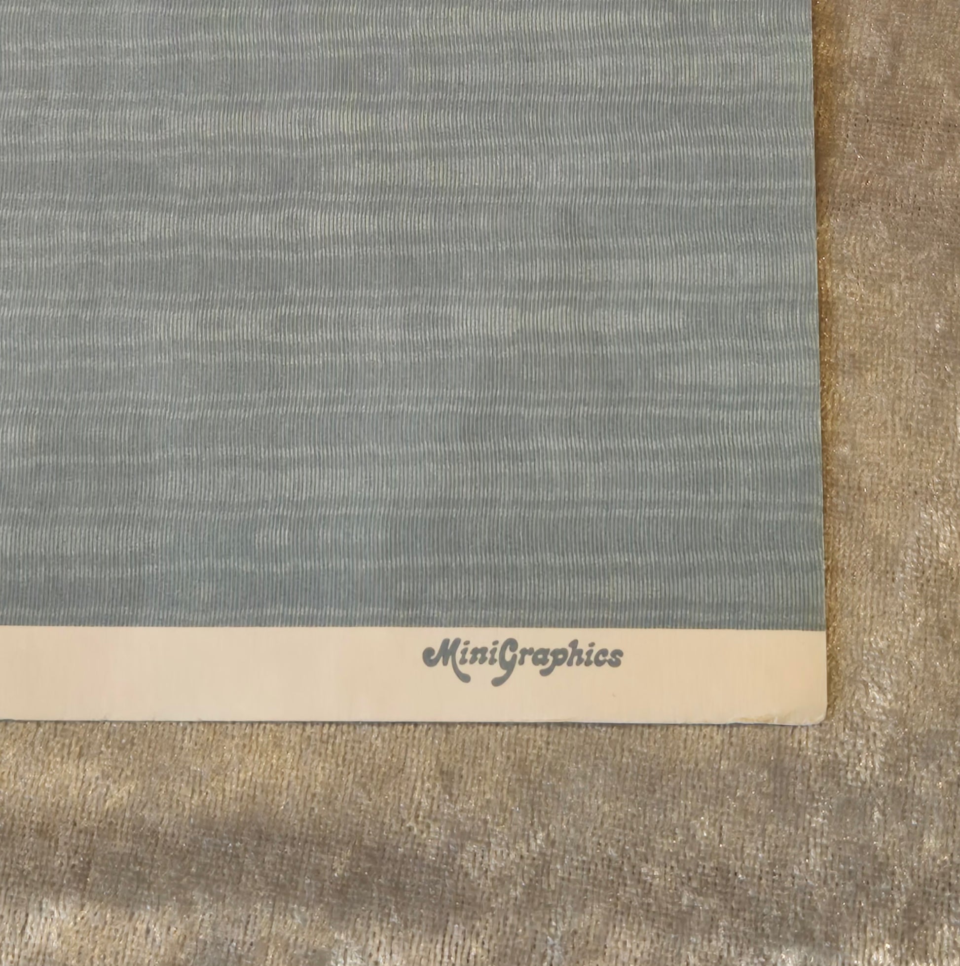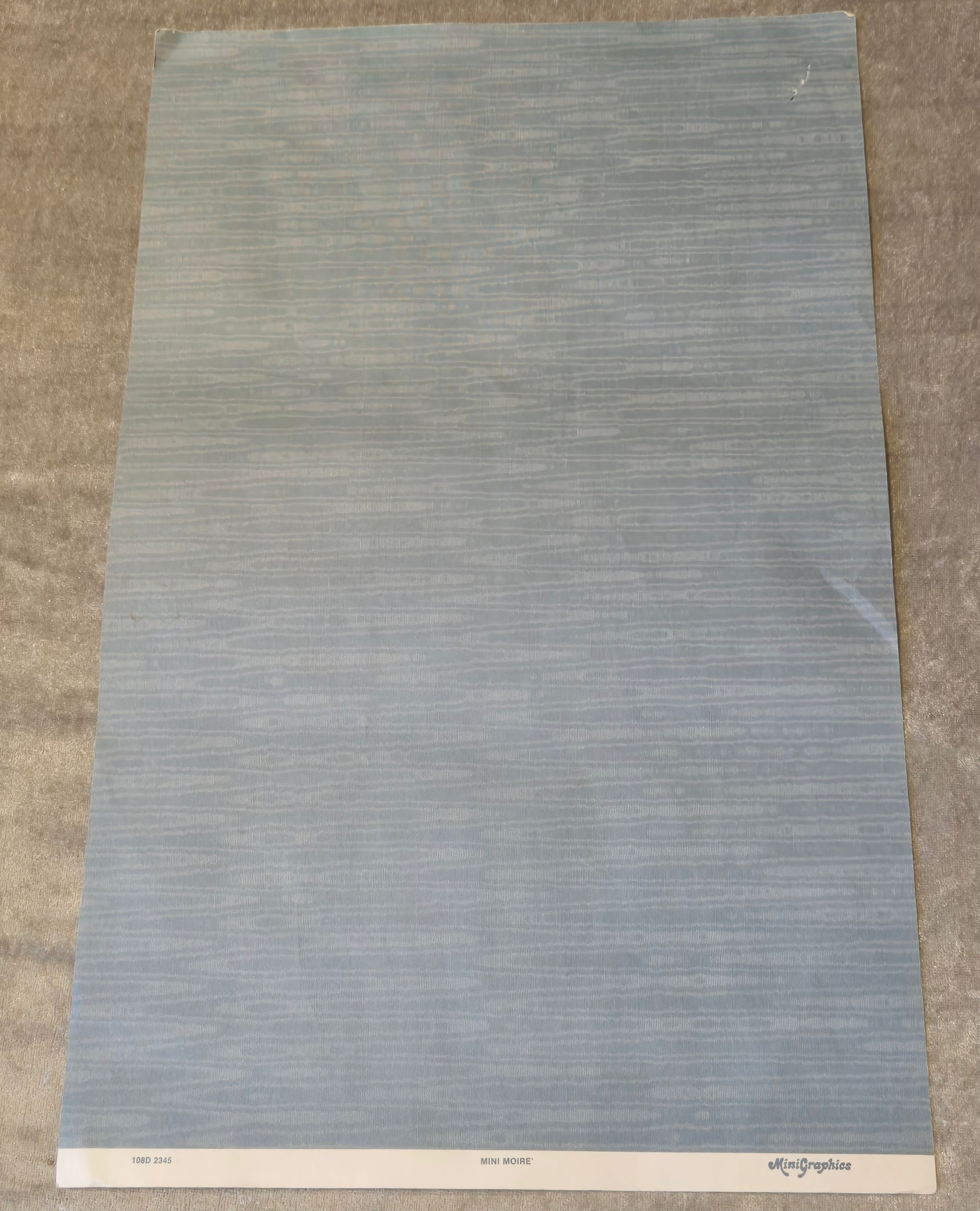 Ark tapet til dukkehuset. Blåligt tapet med træåre-print.