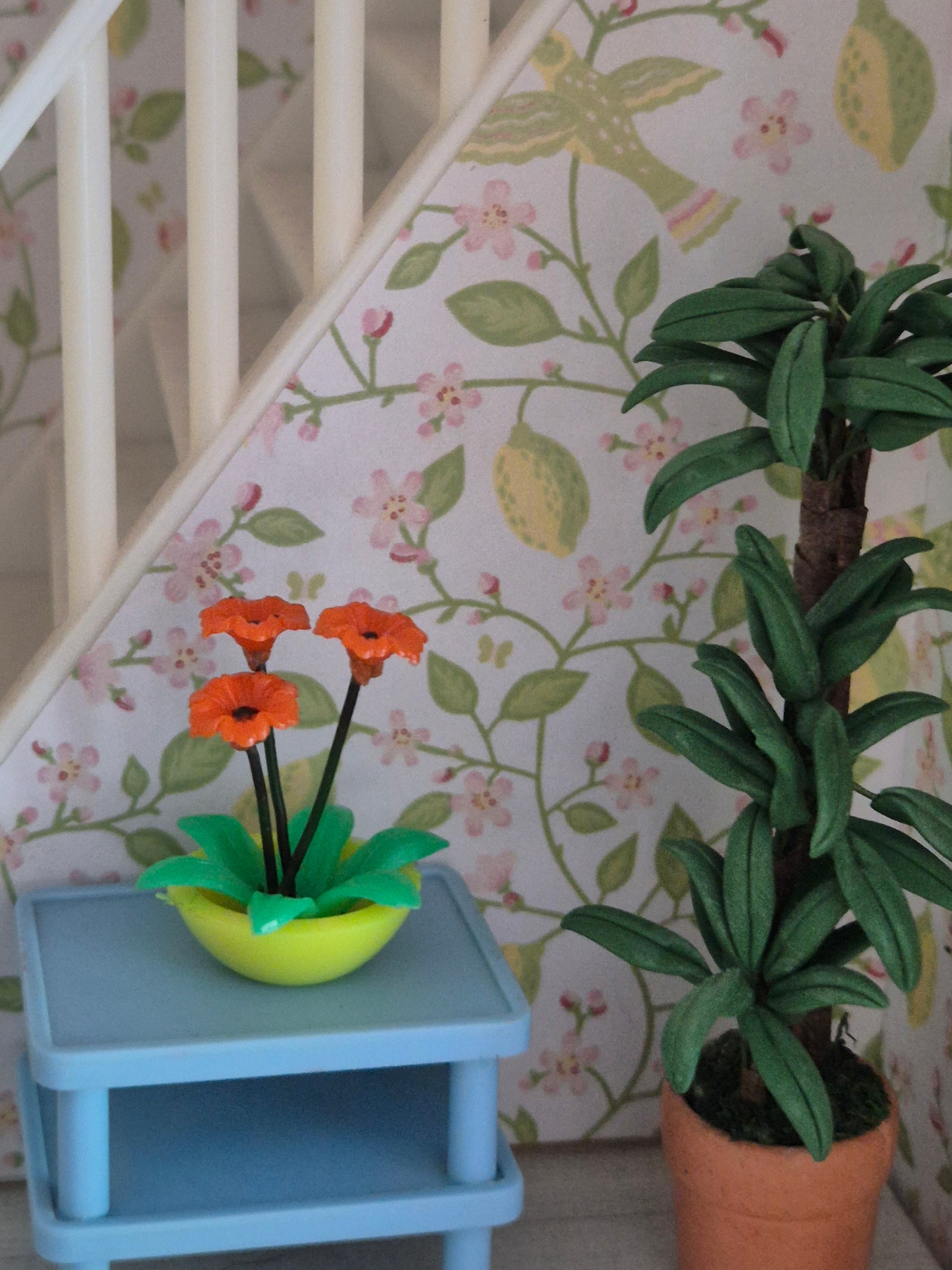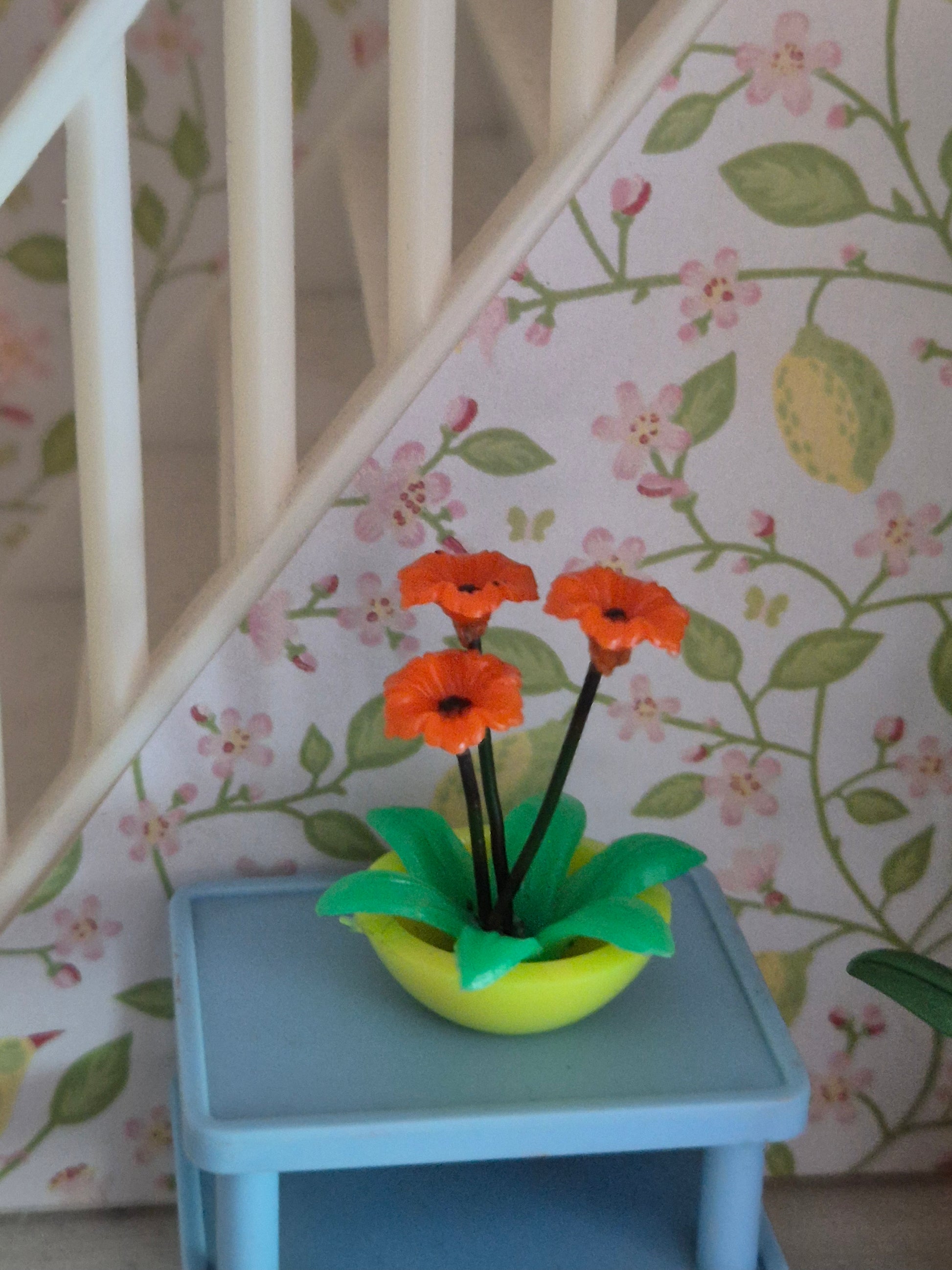 Smuk og speciel blomst, vintage og fin. Den er af plast og ståltråd. Passer til 1:12 - 1:16.