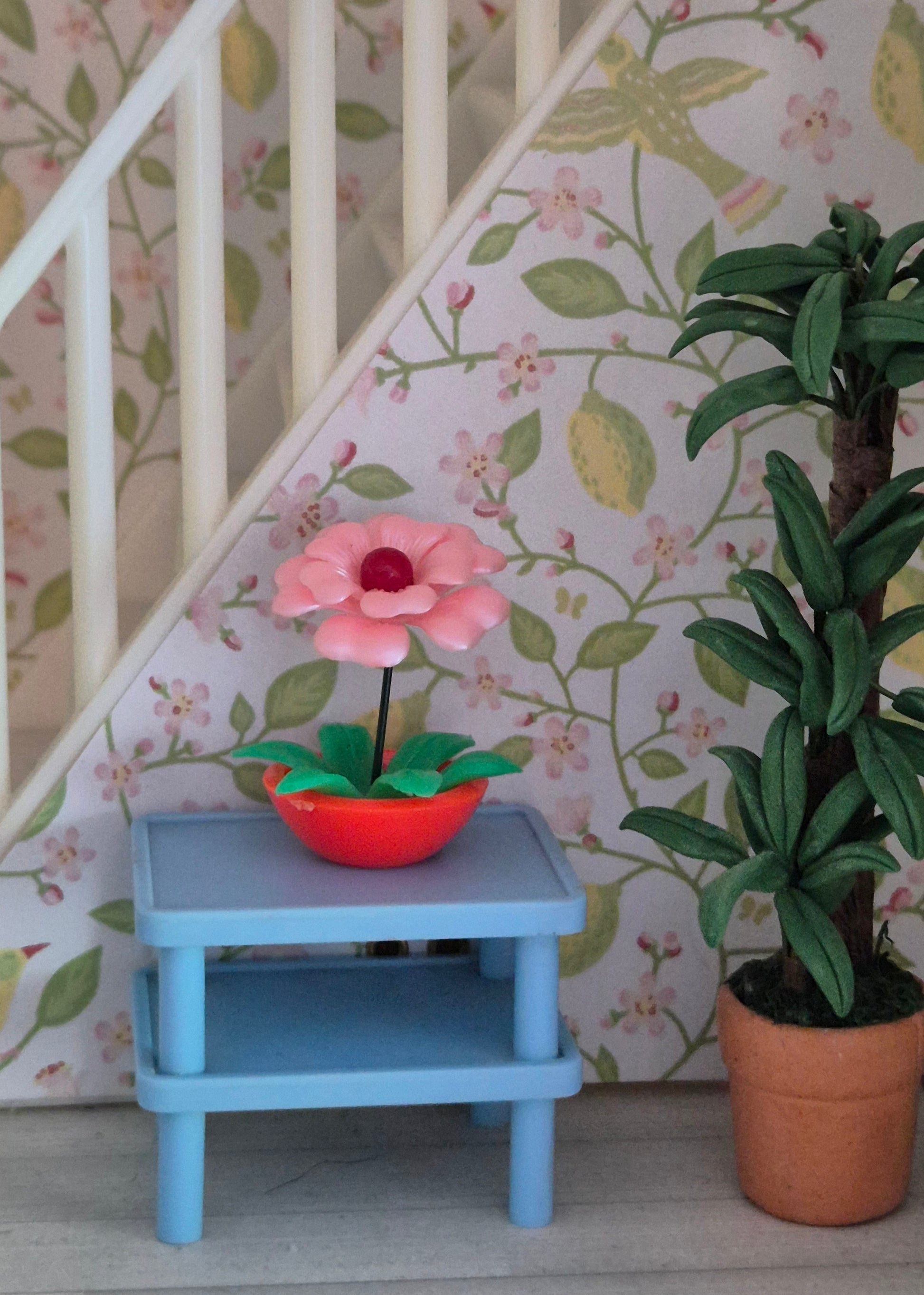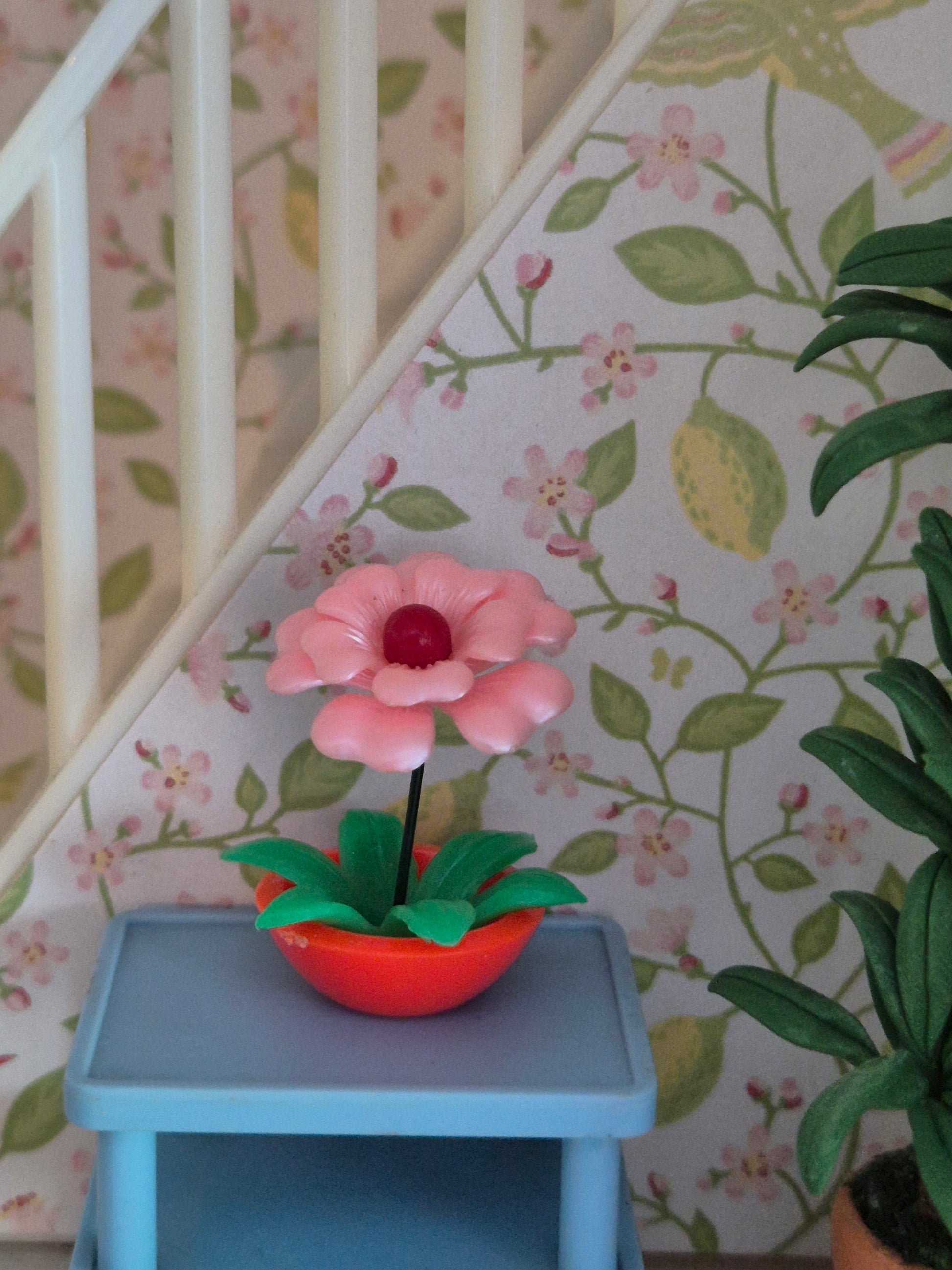 Fin og pæn vintage blomst af plast og ståltråd. Den passer til 1:16 - 1:12. Speciel og smuk.