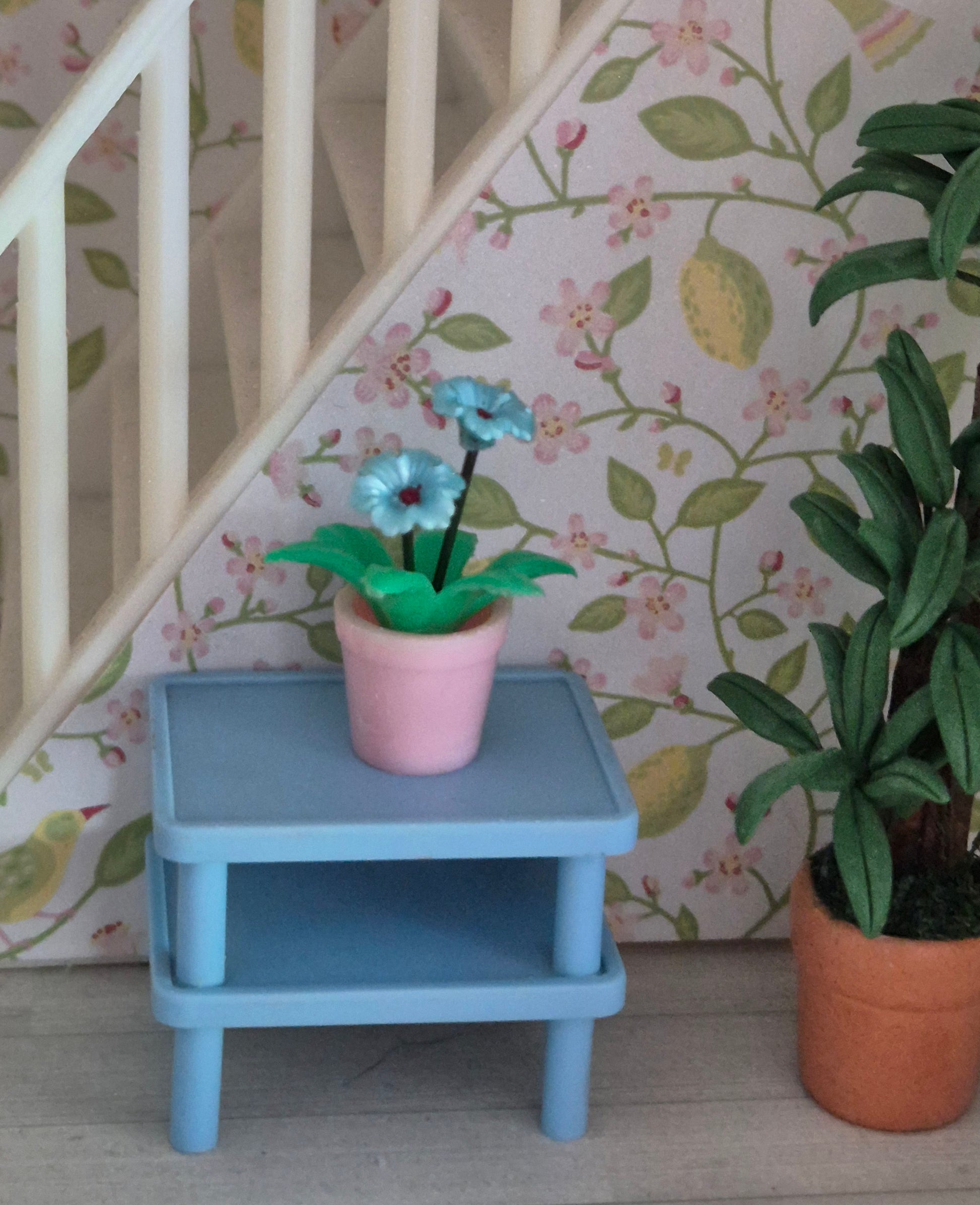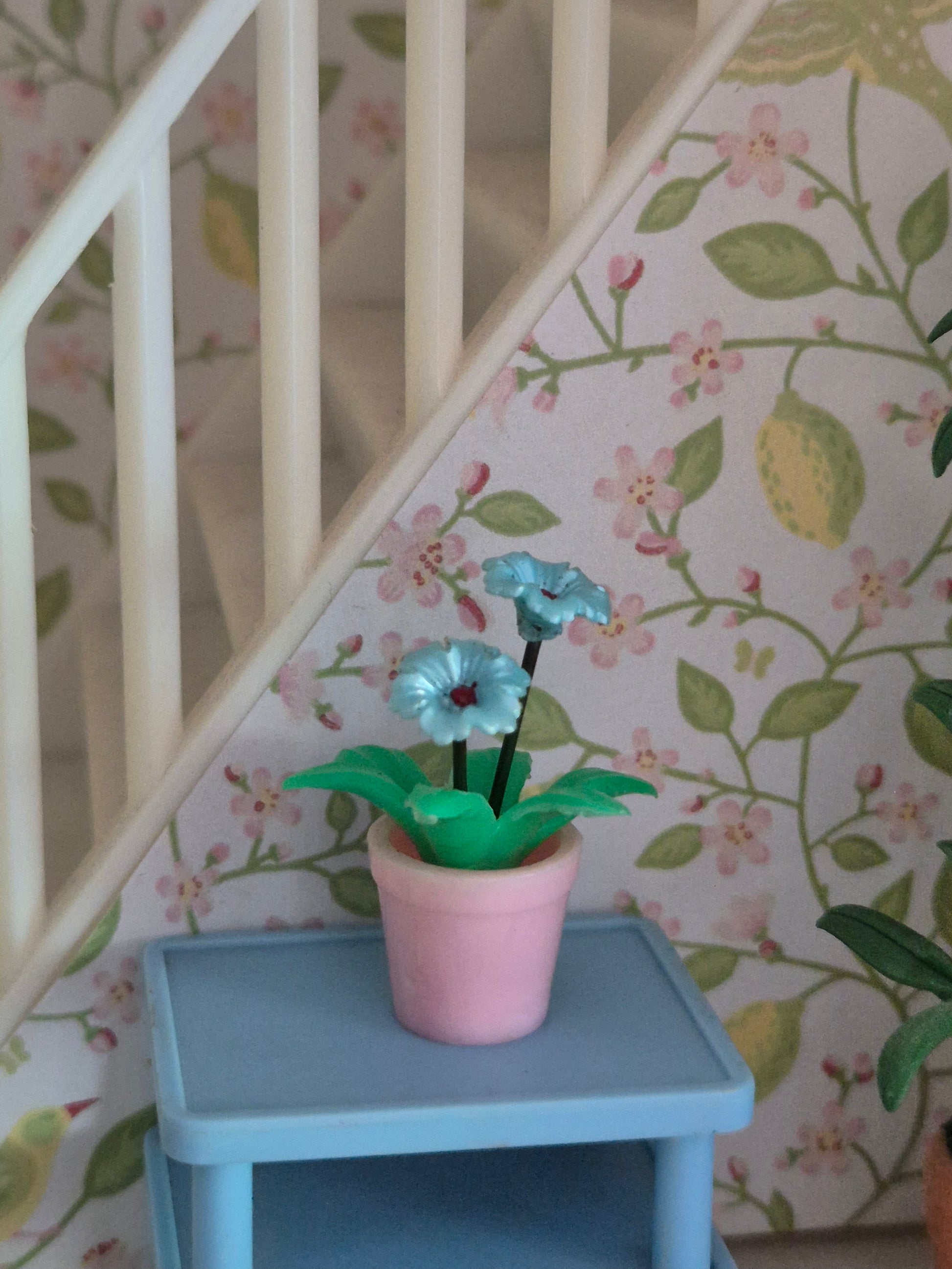 Smuk og speciel blå vintage blomst i lyserød potteskjuler. Den er af plast og ståltråd.
