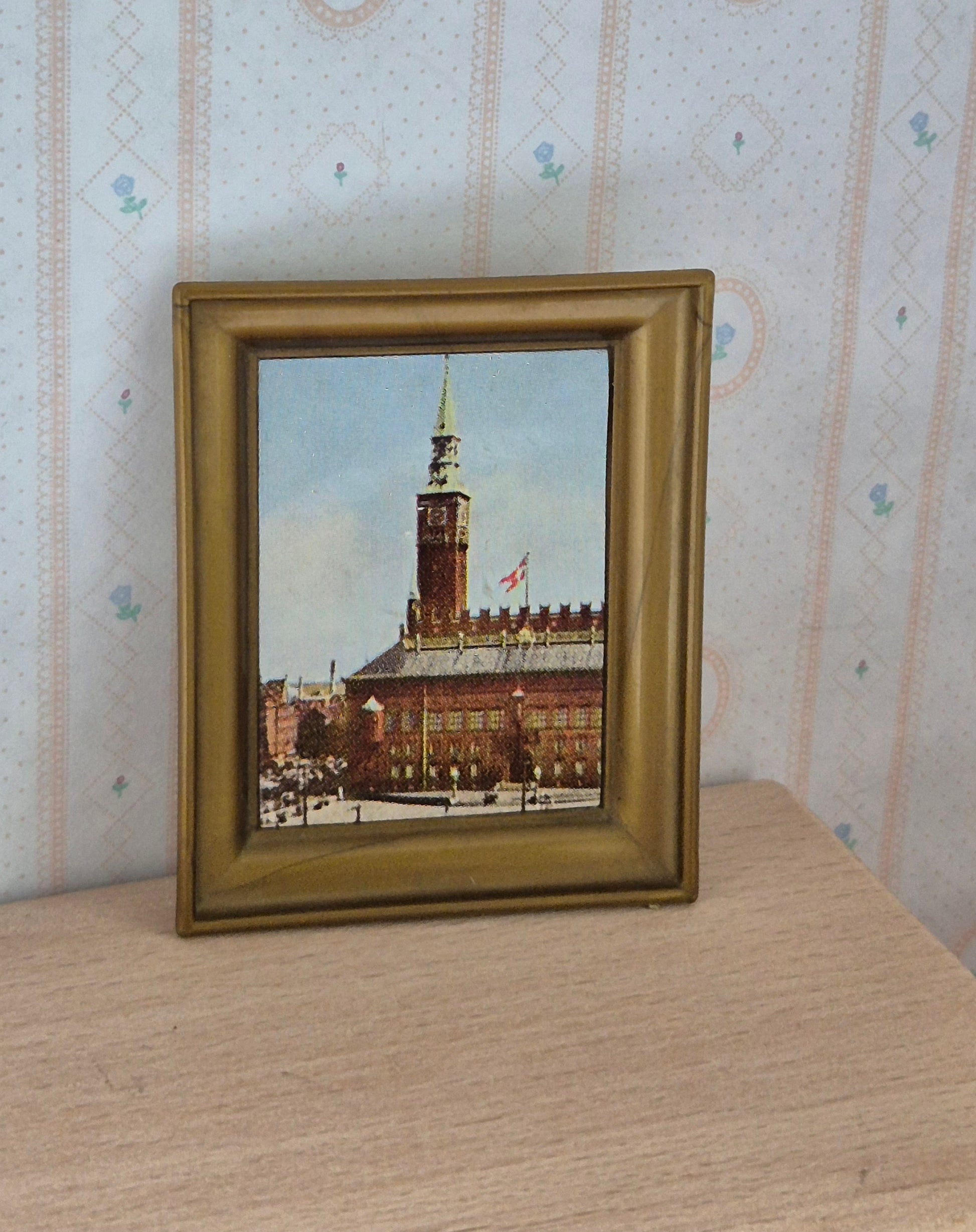 Smukt vintage maleri til 1:16 - 1:12. Det er i god stand med patina, dansk design. De er eftragtede. Motivet er et dansk bygningsværk, bemærk Dannebrog (det danske flag)