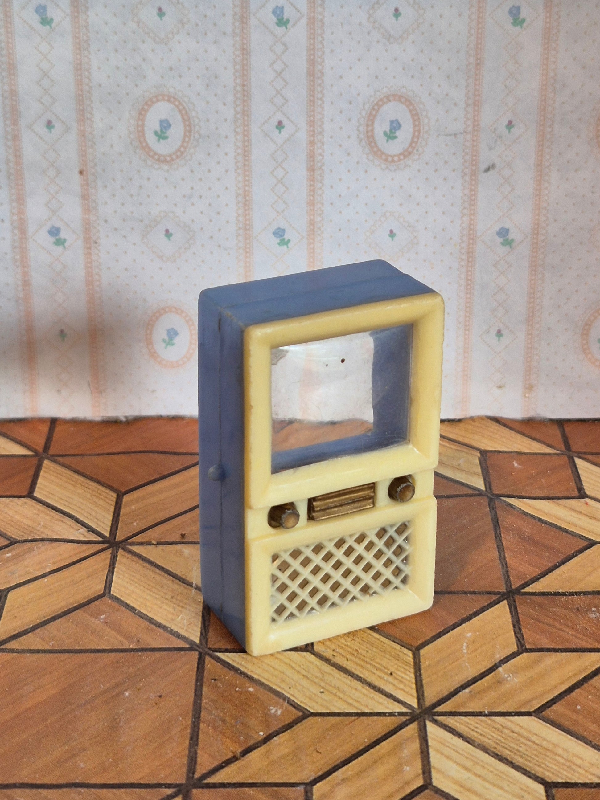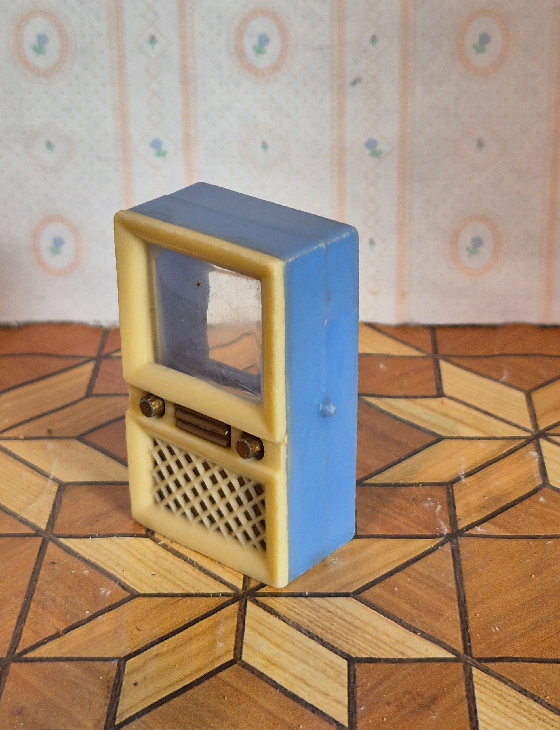 Vintage TV af plast 1:16 - 1:12. Det er med brugsspor og patina. Skærmbilledet og bagvæg mangler.