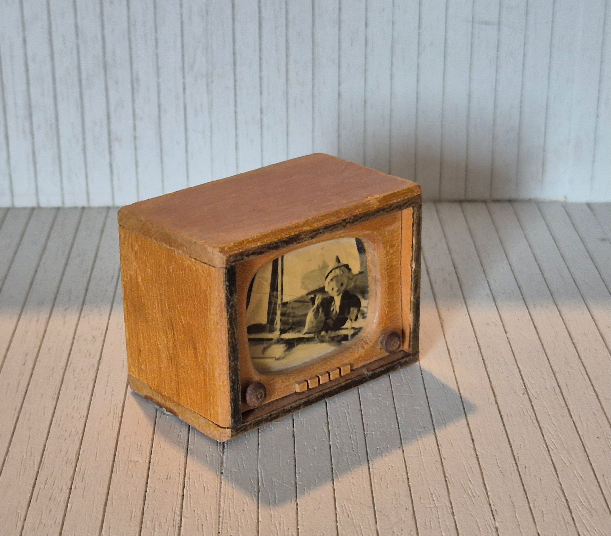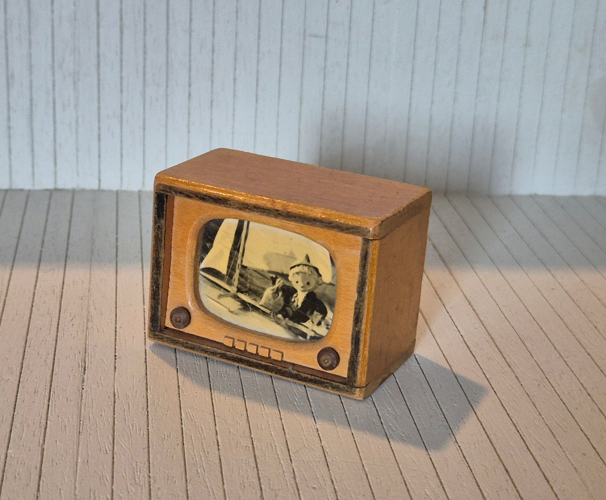 Pænt unikt og vintage TV i lyst træ med patina og brugsspor, brugsslid og mangler. TVet er fra før 1960erne. Det mangler ben.
