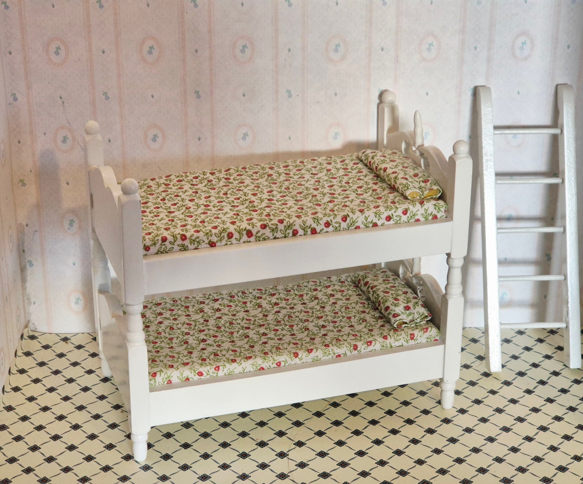 Pæn hvid 1:12 køjeseng med stige til jul børneværelse. God stand med lidt brugsspor. Fin og god køjeseng
