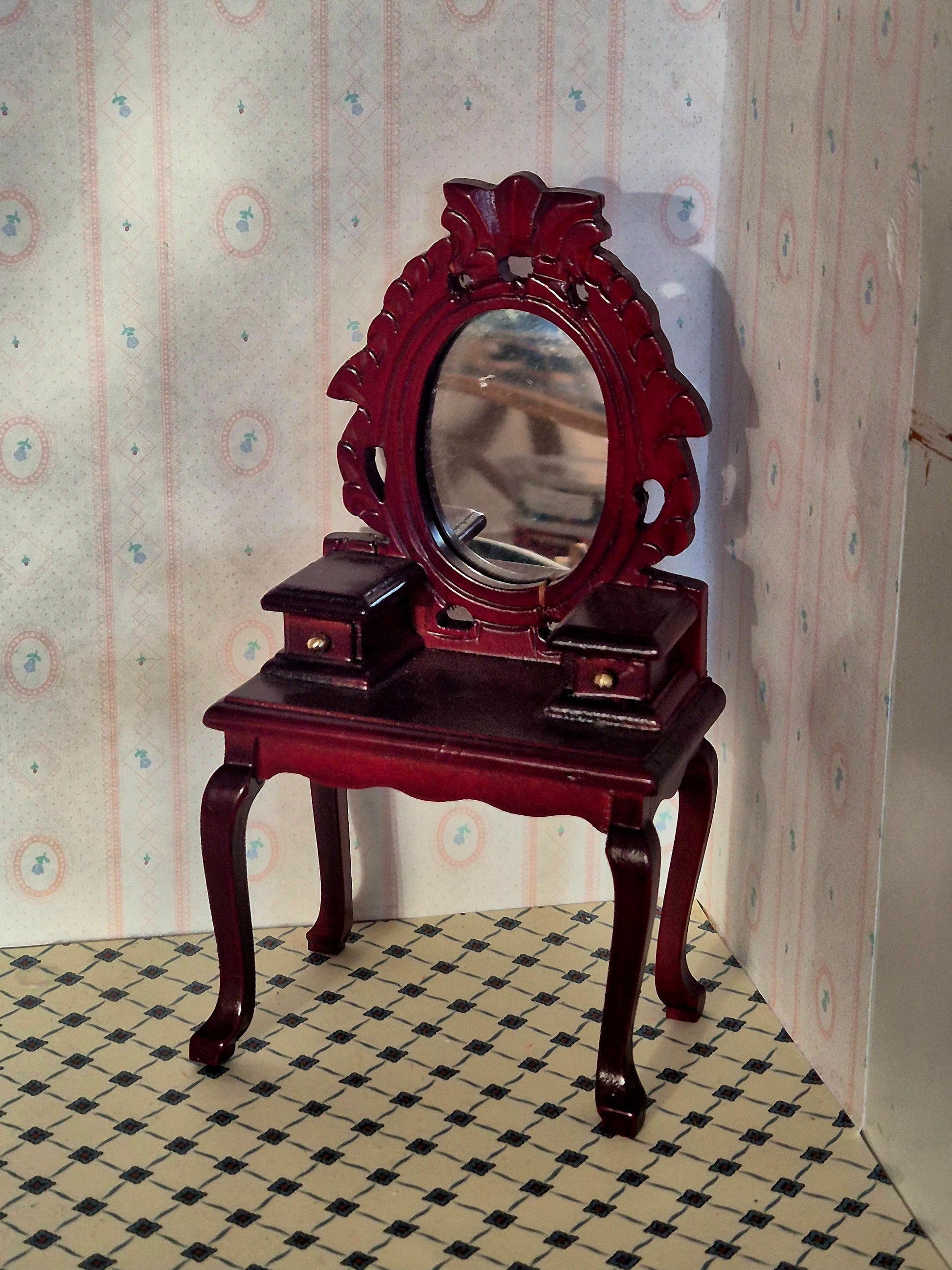 Pænt 1:12 sminkebord af træ i rødbrun nuance. Der er lidt patina og brugsspor.