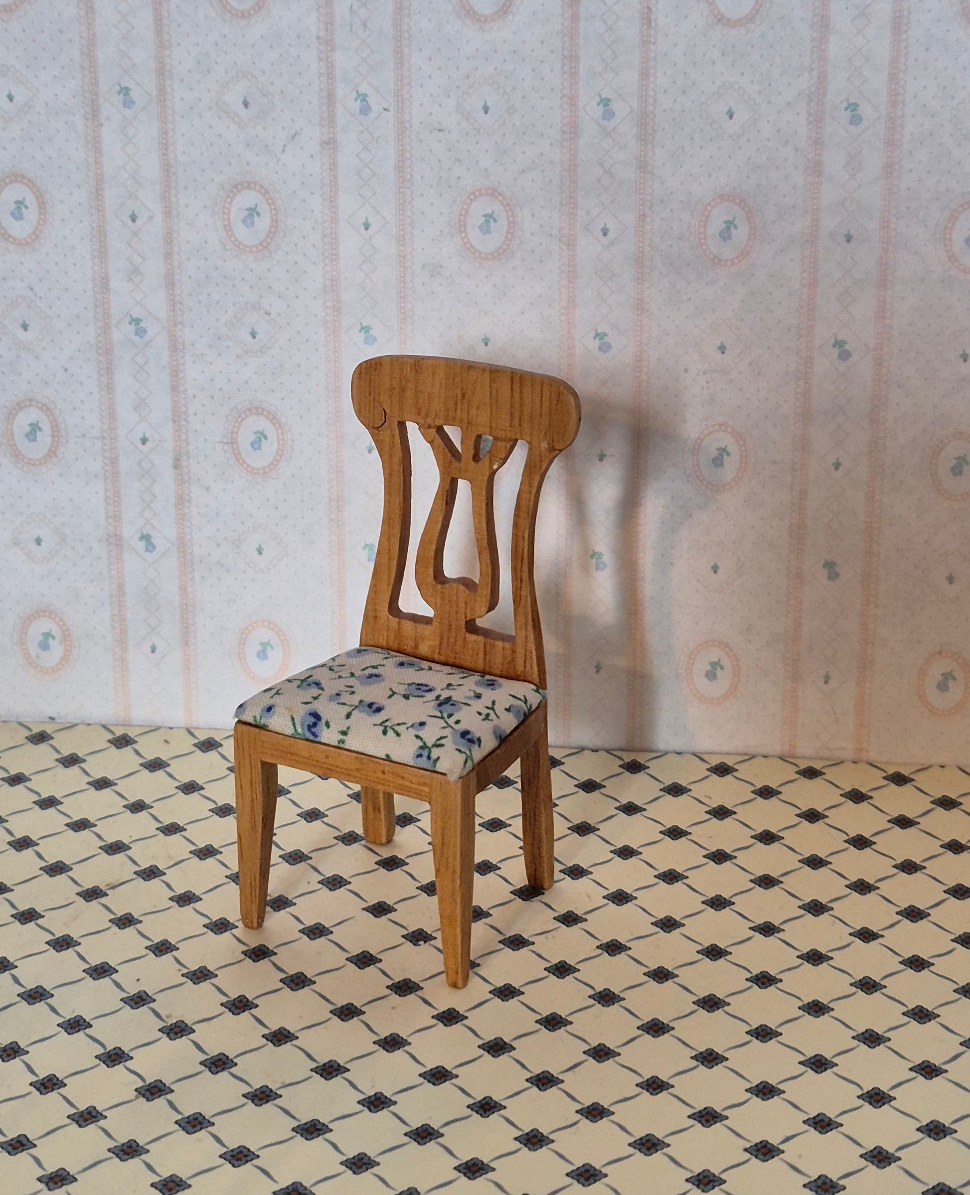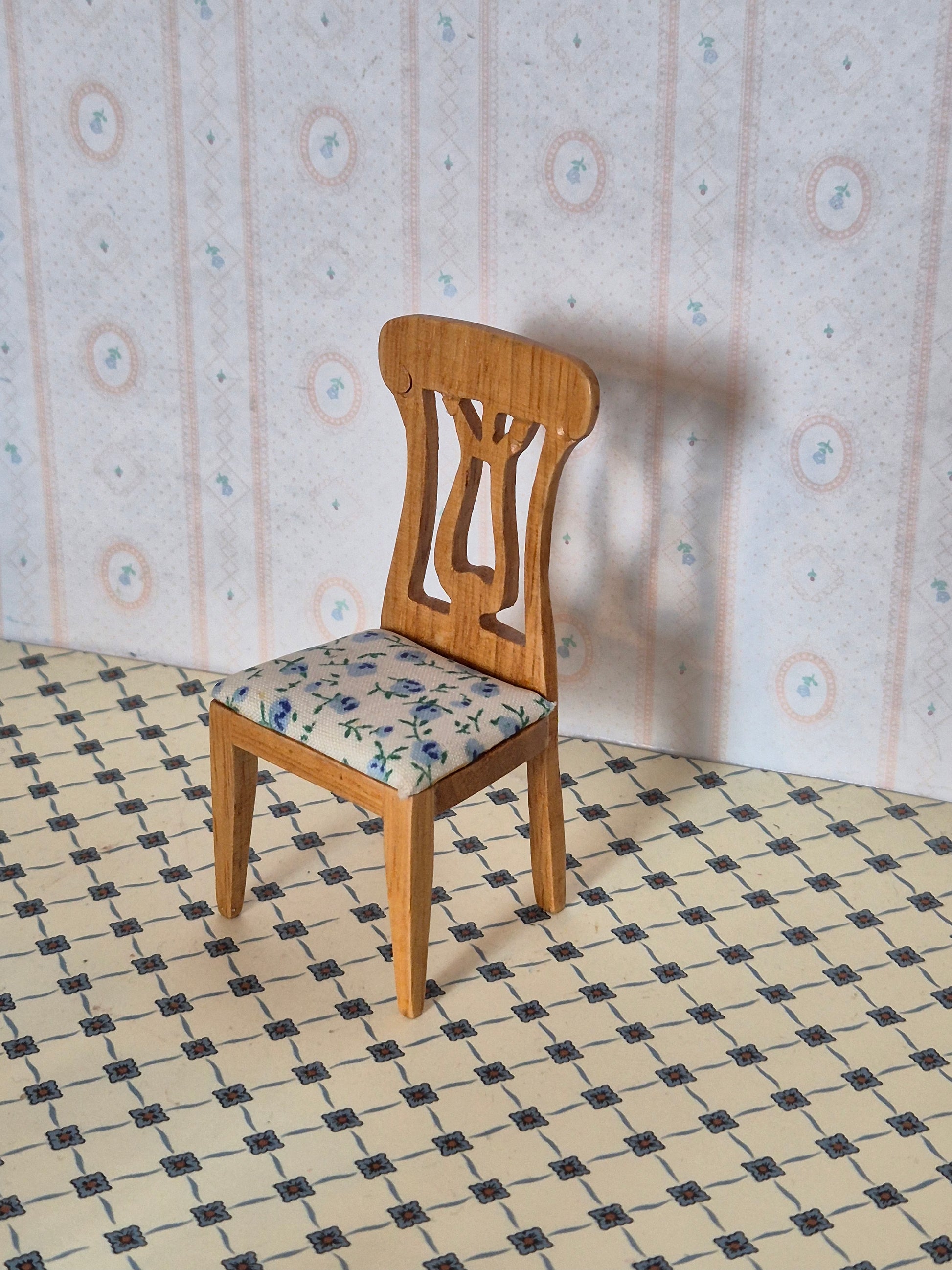 Pæn og fin 1:12 stol i lyst træ med mønstret sæde. Rigtig god stand.