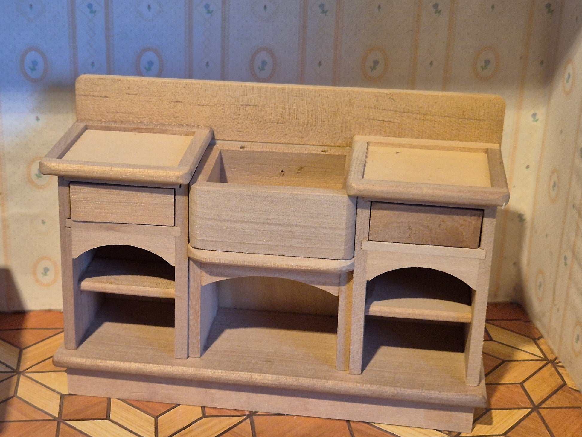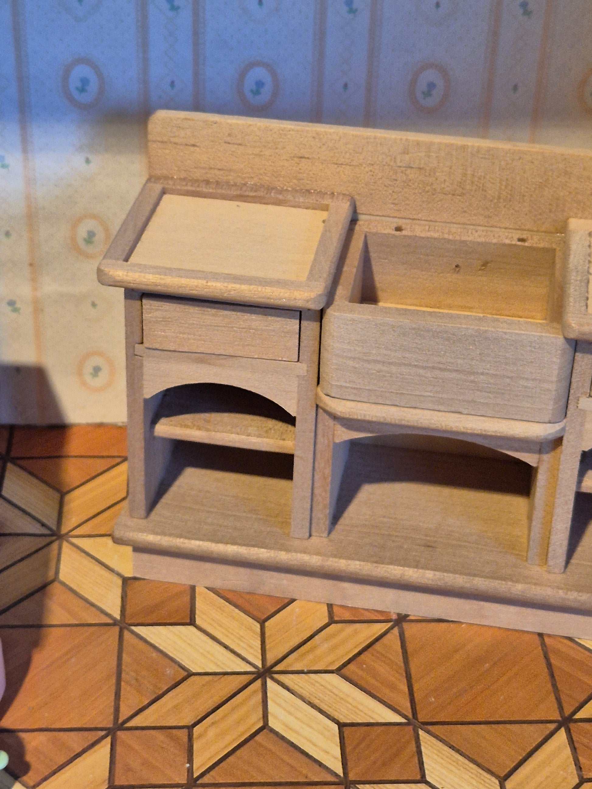 1:12 Fint møbel med vask i ubehandlet træ. Klar til at gøres personligt - sæt dit eget præg på det.