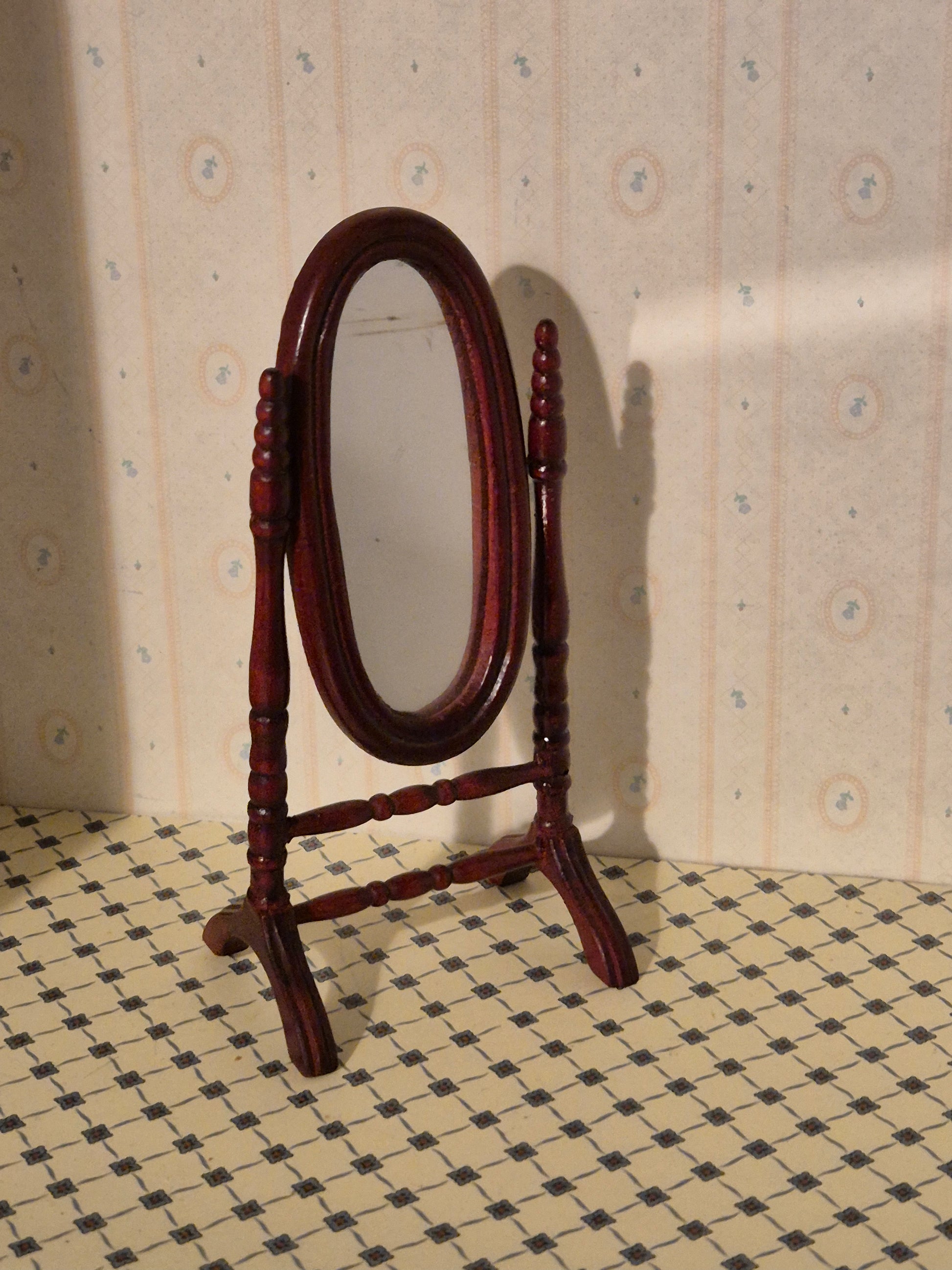 1:12 vippespejl med træramme og ovalt spejl. Det er lidt skævt og vipper lidt til den ene side.