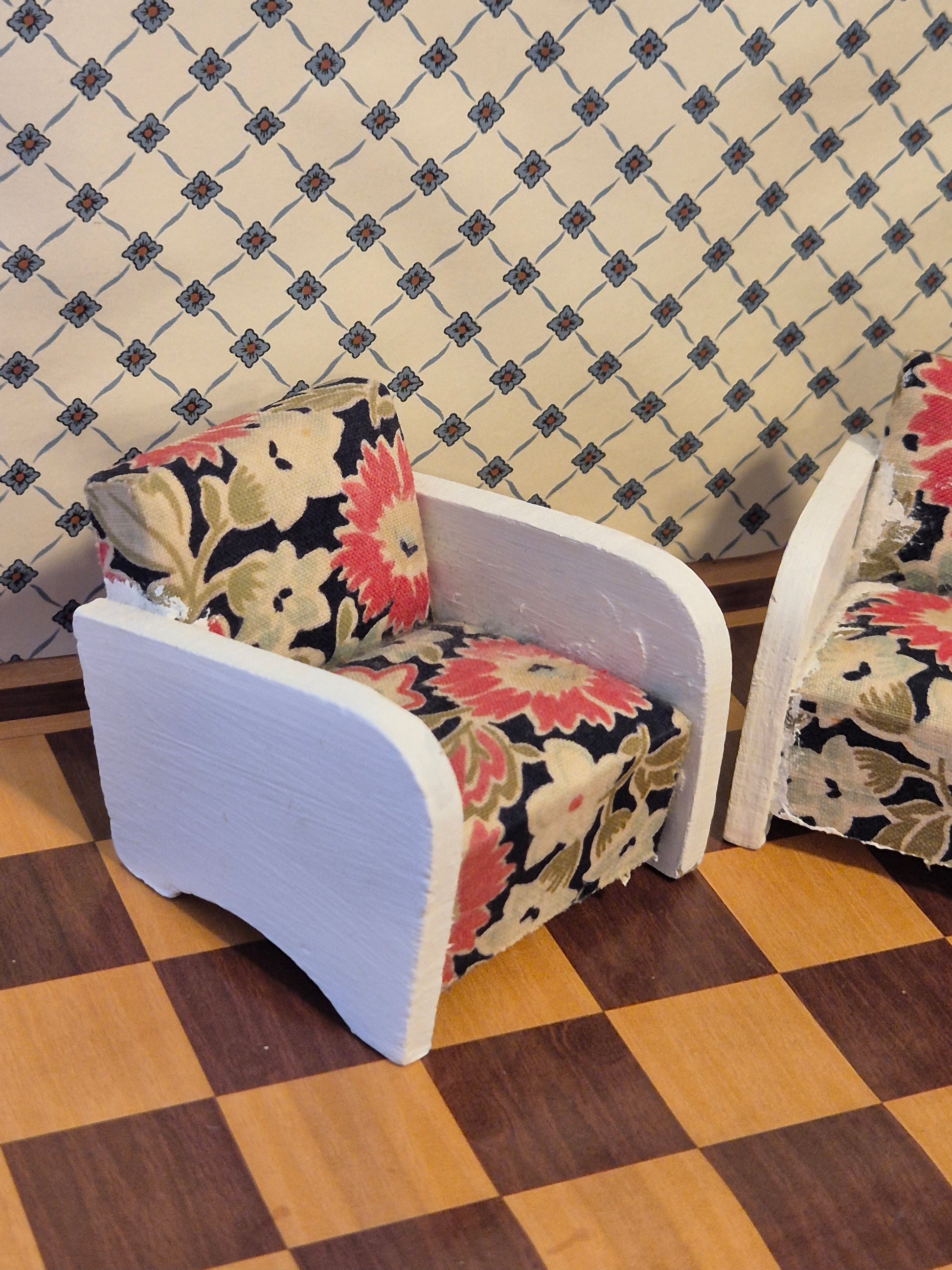Pænt sæt 1:16 vintage dukkehusmøbler i hvid træ, sofa og lænestol med blomstermotiv. Udmærket stand med brugsspor og patina.