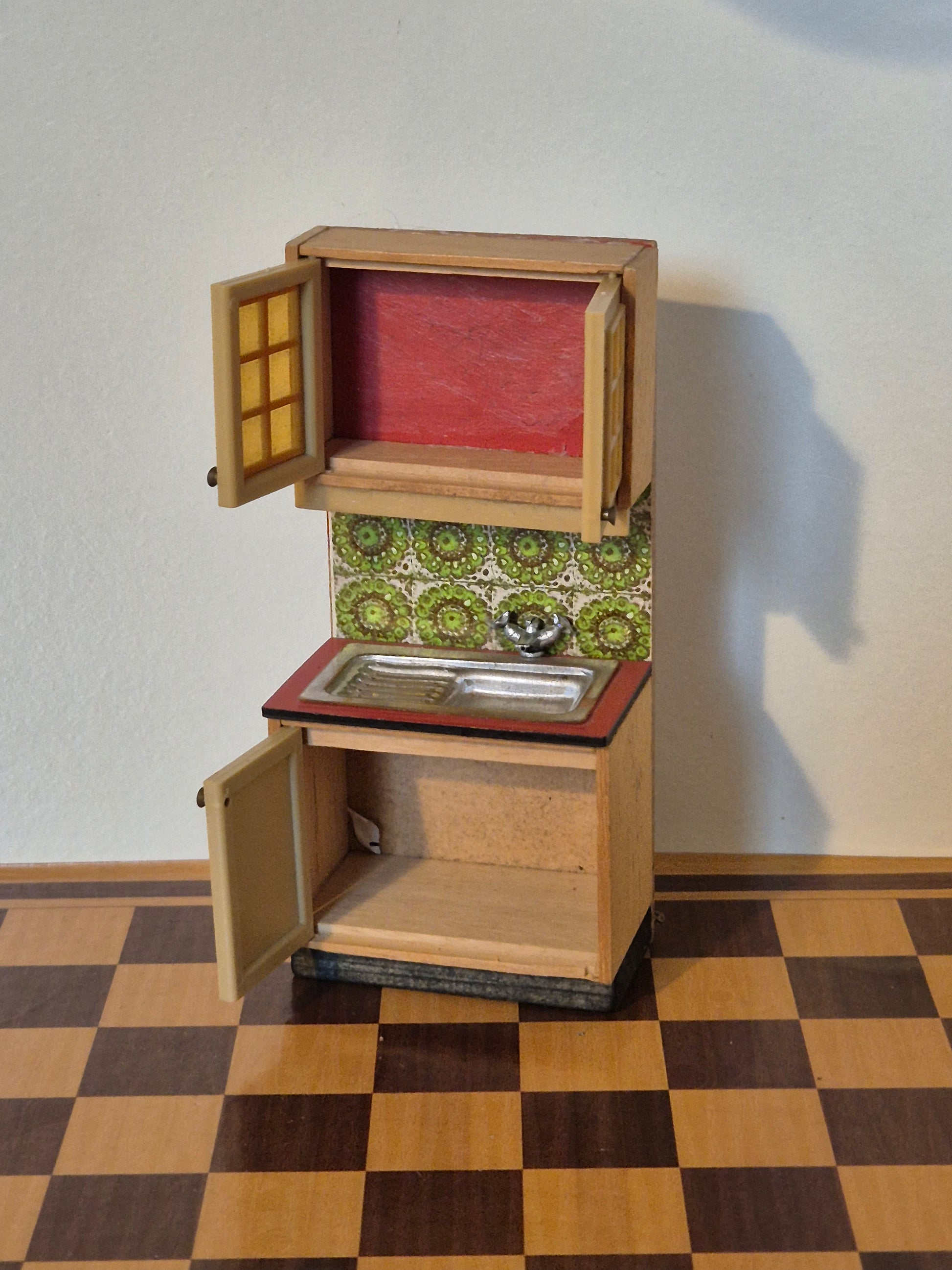 Vintage Lisa af Danmark køkkenvask til dukkehuset der mangler en låge. Det er i den grønne køkken-serie. Der må forventes patina og brugsspor