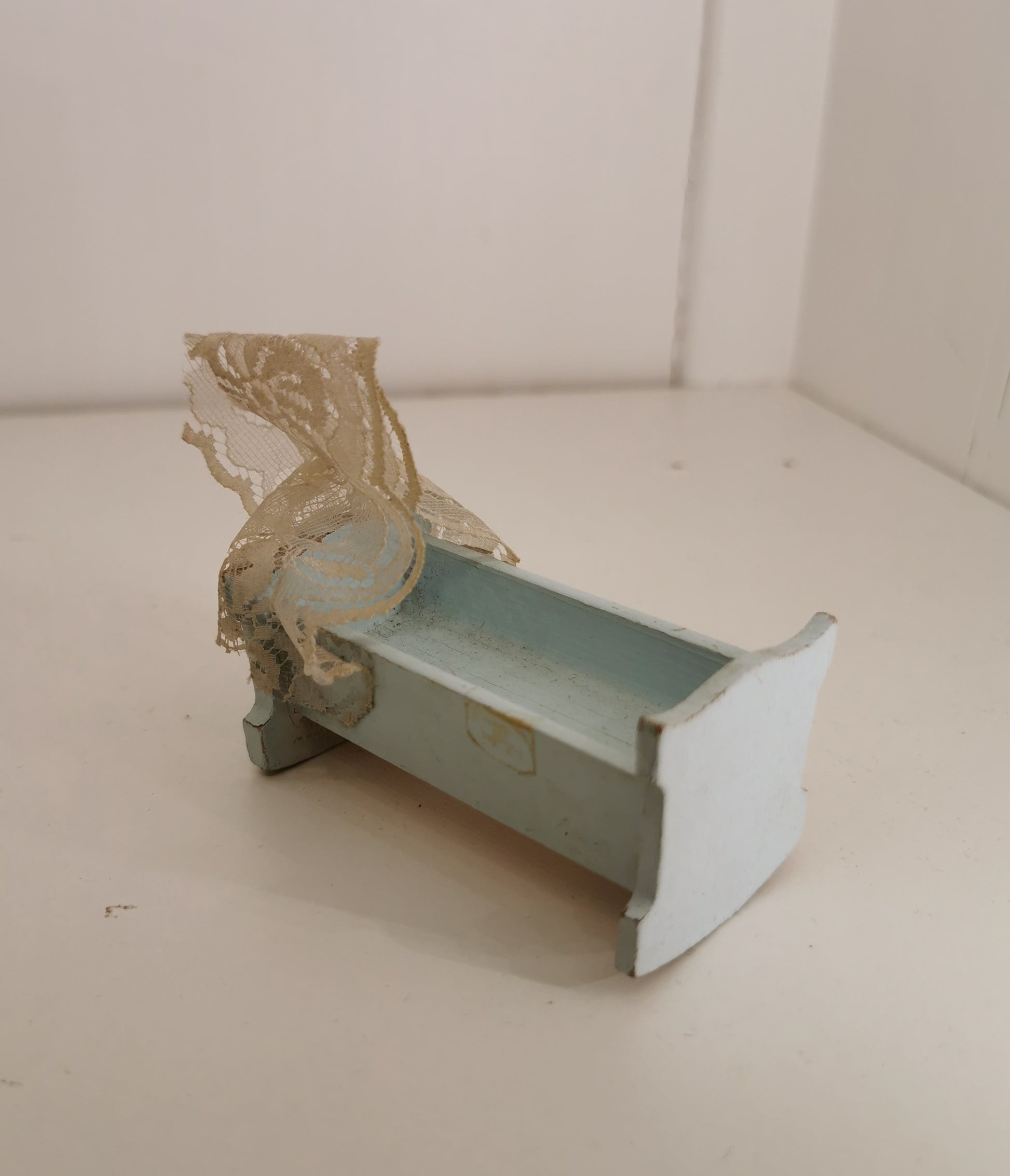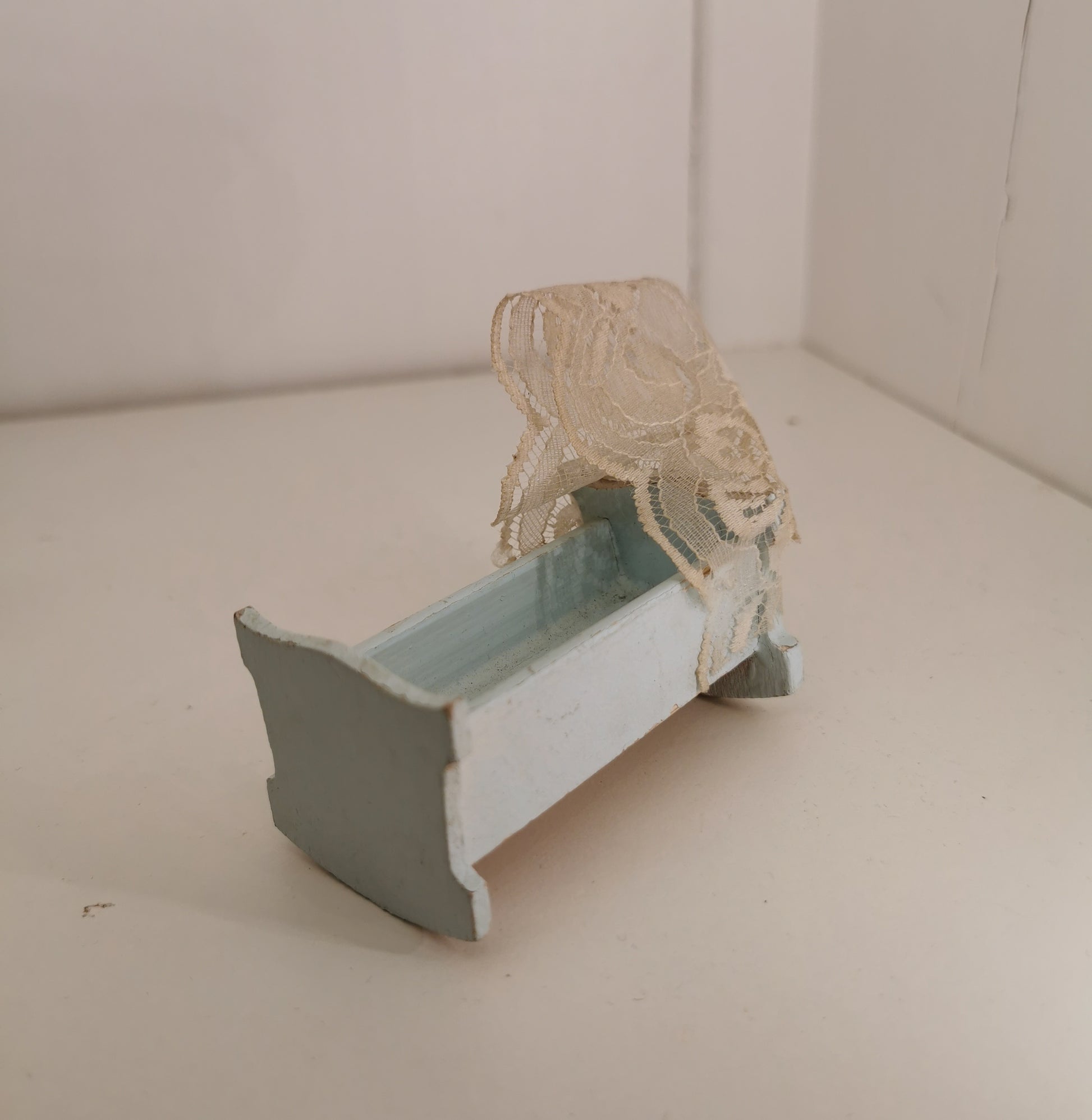 Den er brugt og en anelse slidt, og med mangler fx metalstativet til blondehimlen.