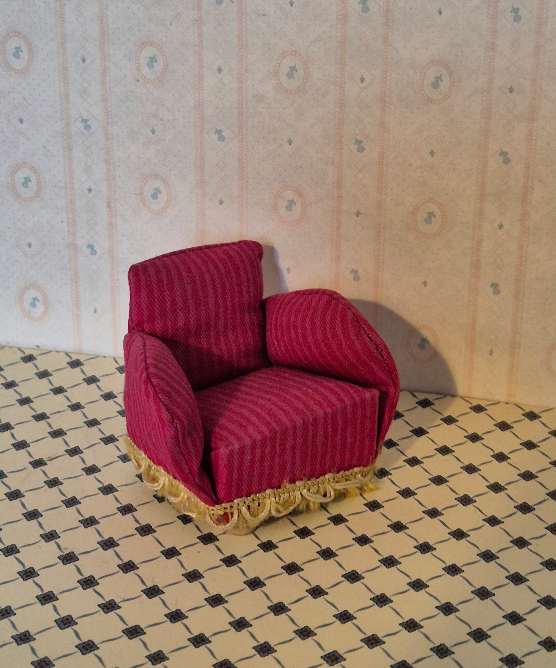Pæn Lundby/Lerro lænestol i 1:16. Den er mørk lyserød med striber fra 1960erne. Udmærket stand.