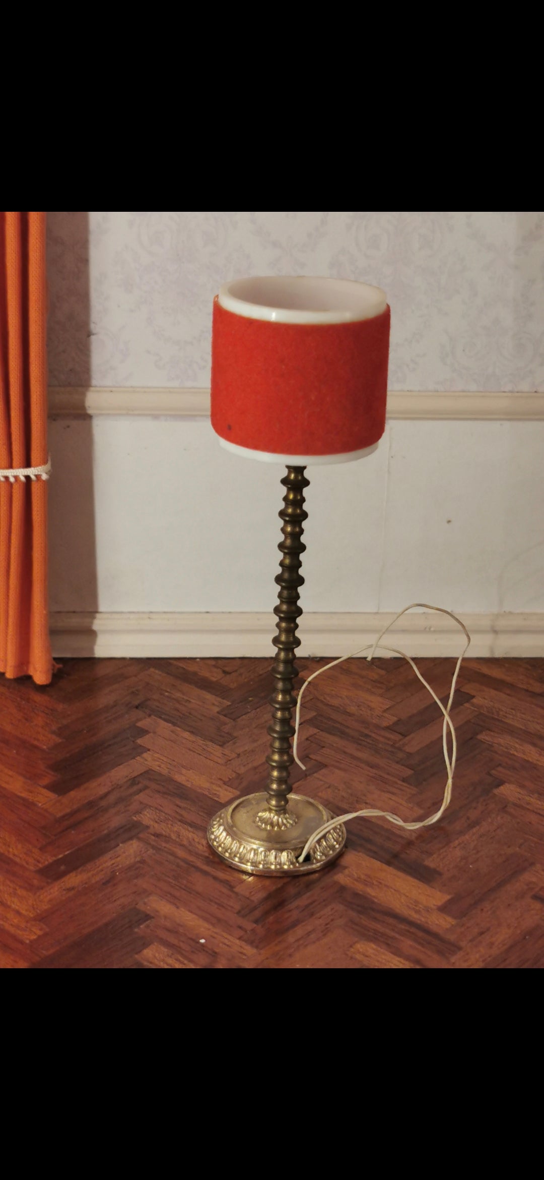 Flot og pæn ældre dukkehus lampe, standerlampe af metal og skærm af plads med rødt stof/filt.