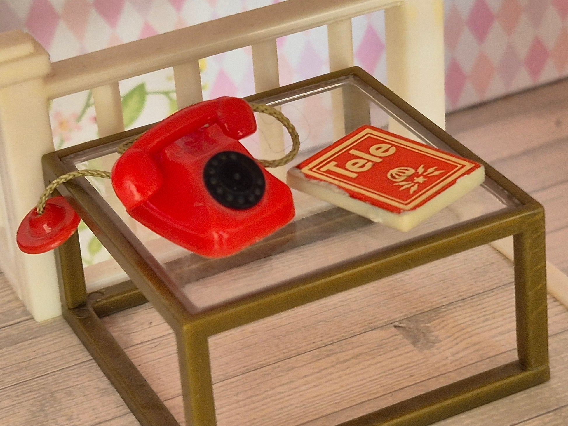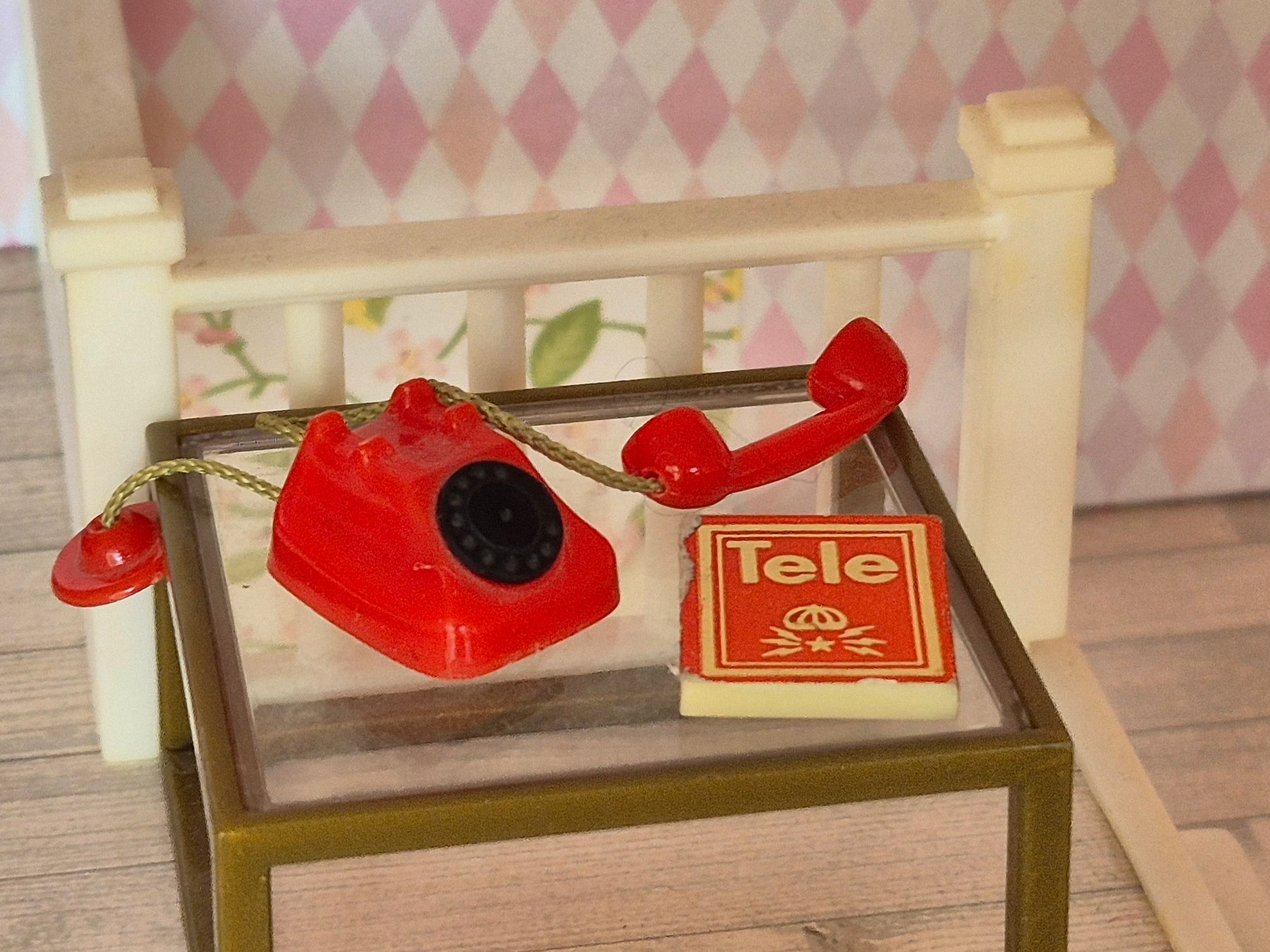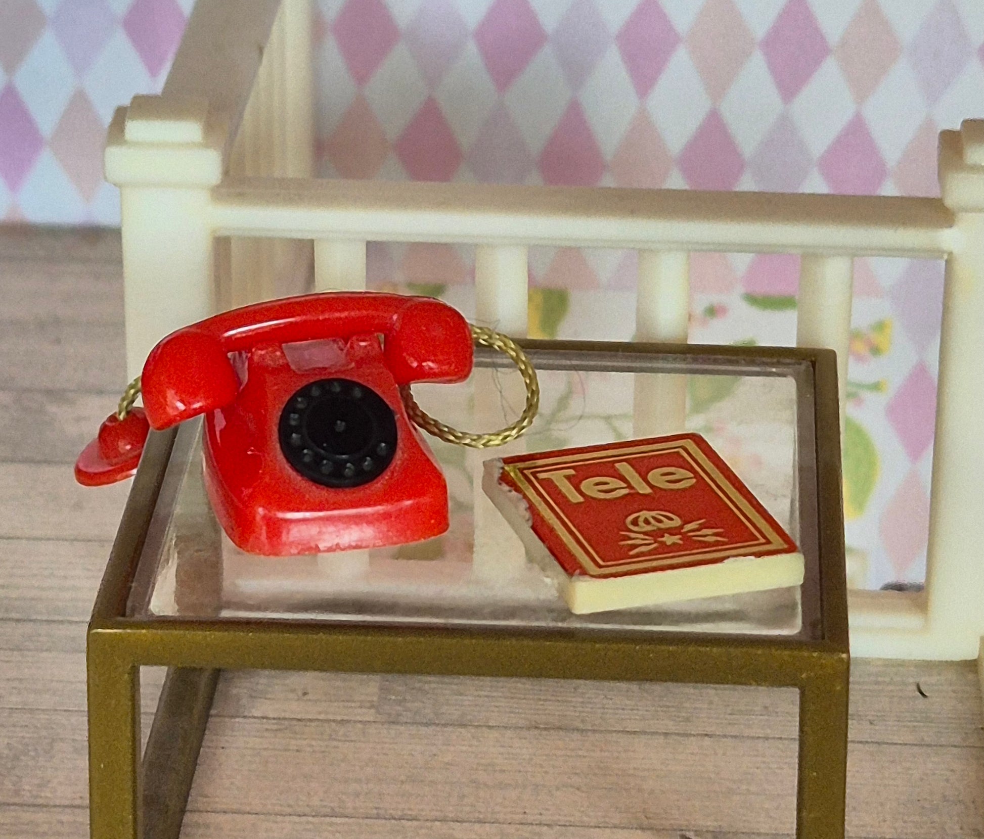 Fin rød vintage Lundby telefon og vintage telefonbog med patina. Rigtig fint sæt