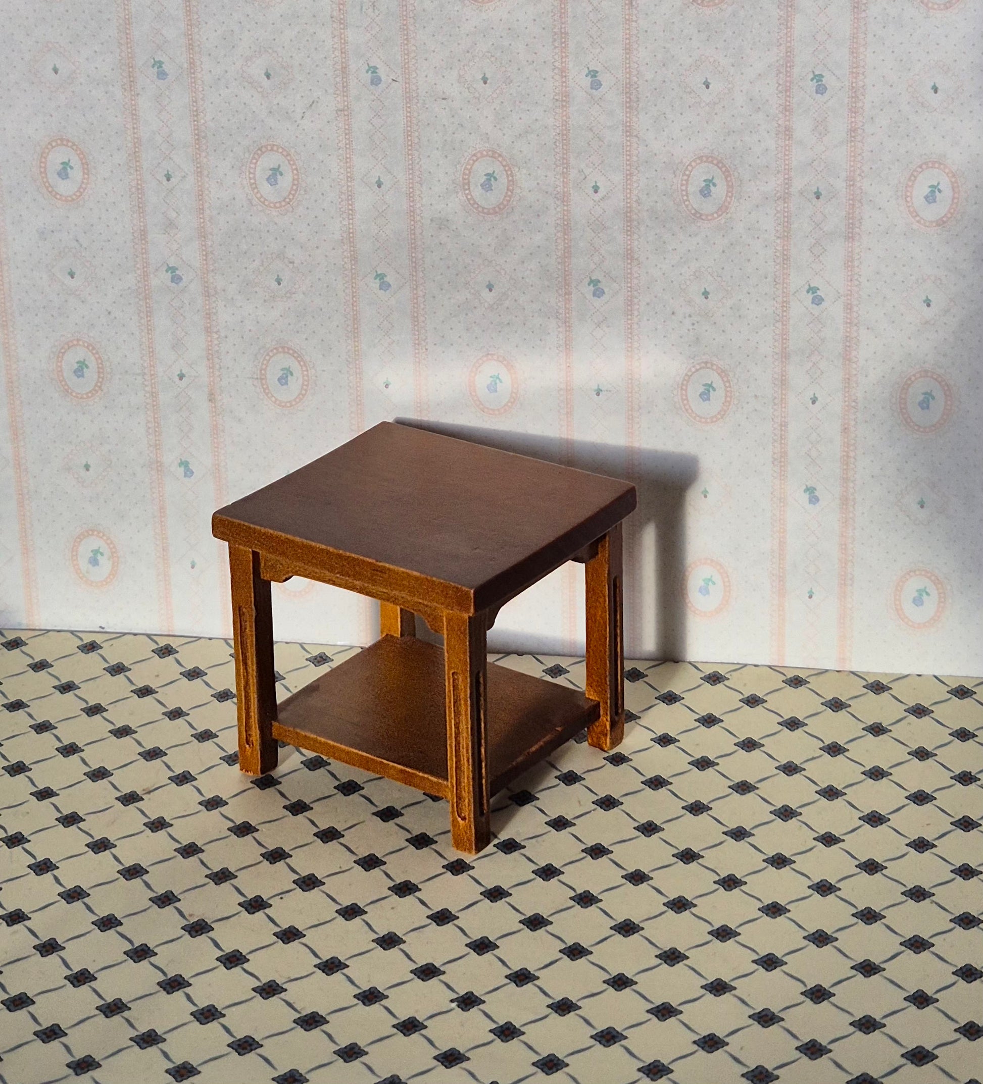 1:12 sidebord eller sofabord i lys hasselbrun nuance. Udmærket stand. Ca 5,5 x 5,5 cm.