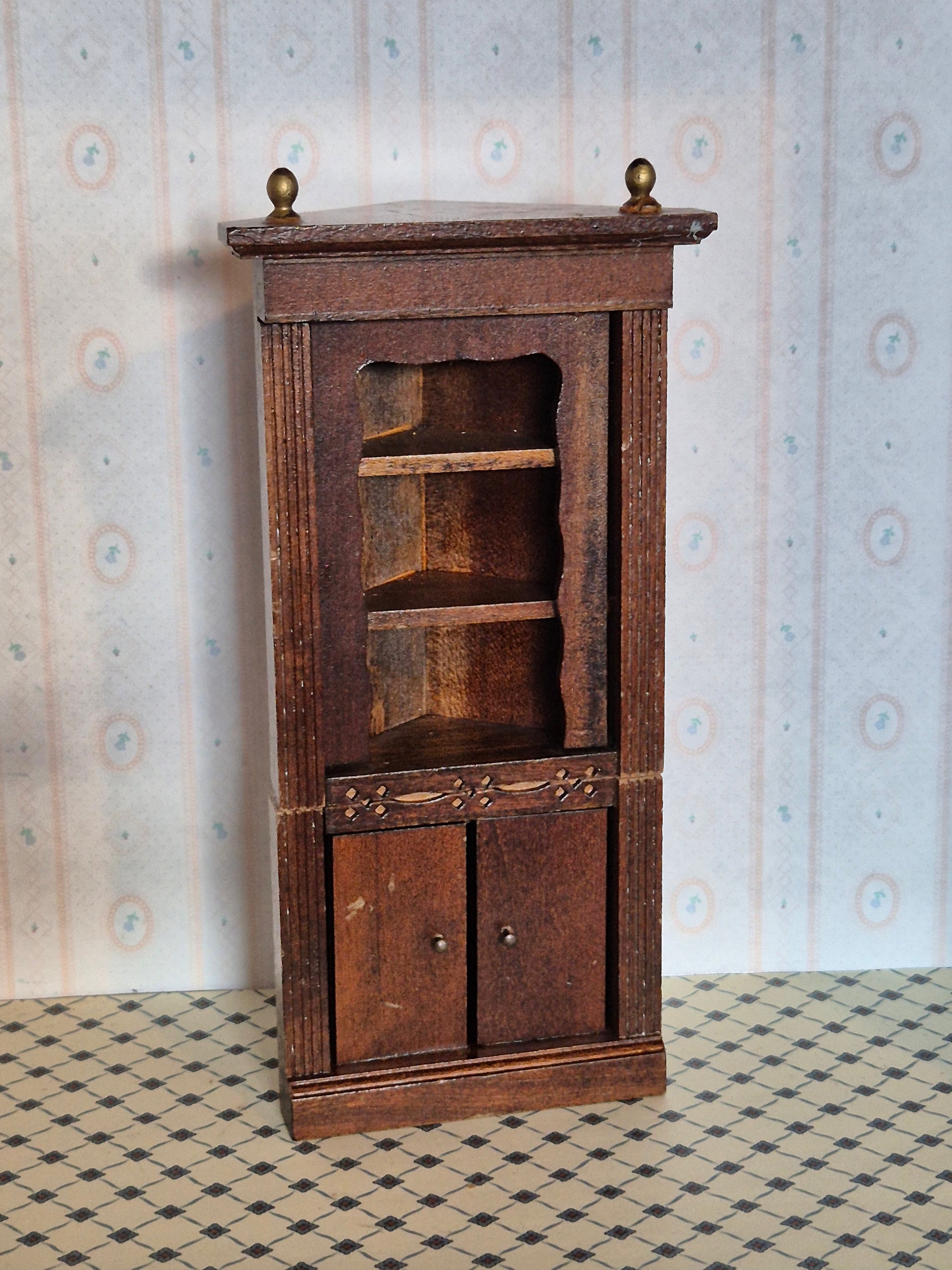 Smukt vintage 1:12 hjørneskab i mørkebrunt træ. Det har fine detaljer og udskæringer.
