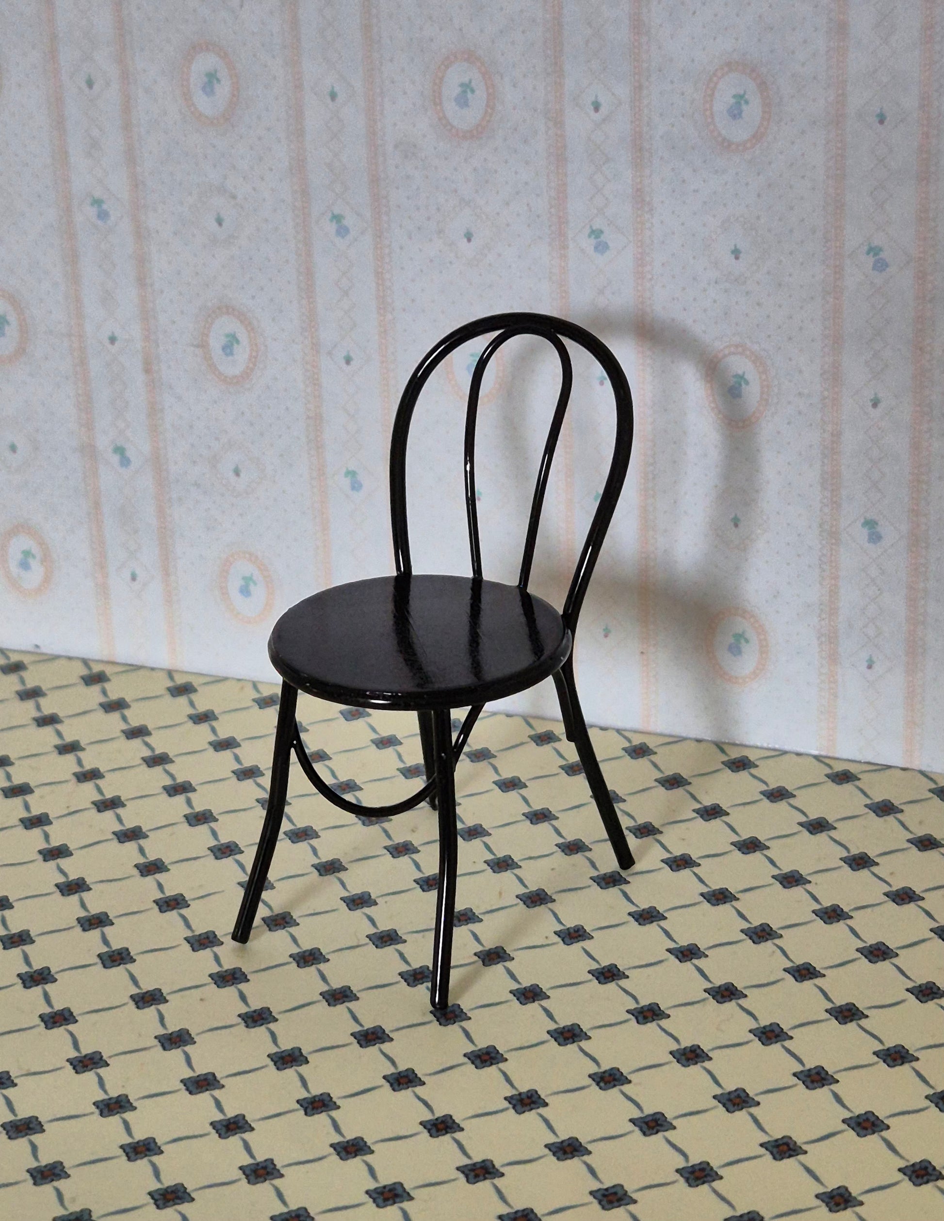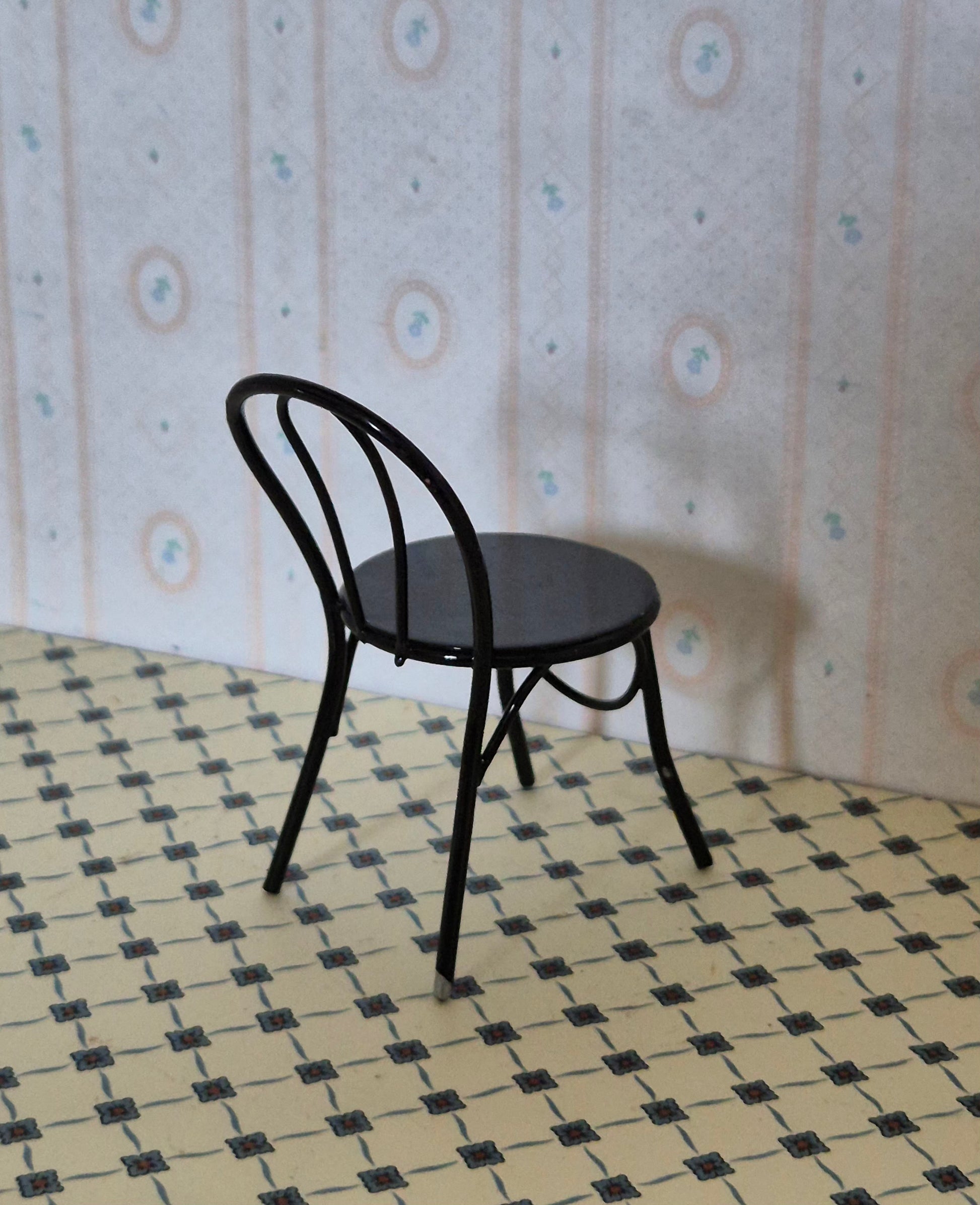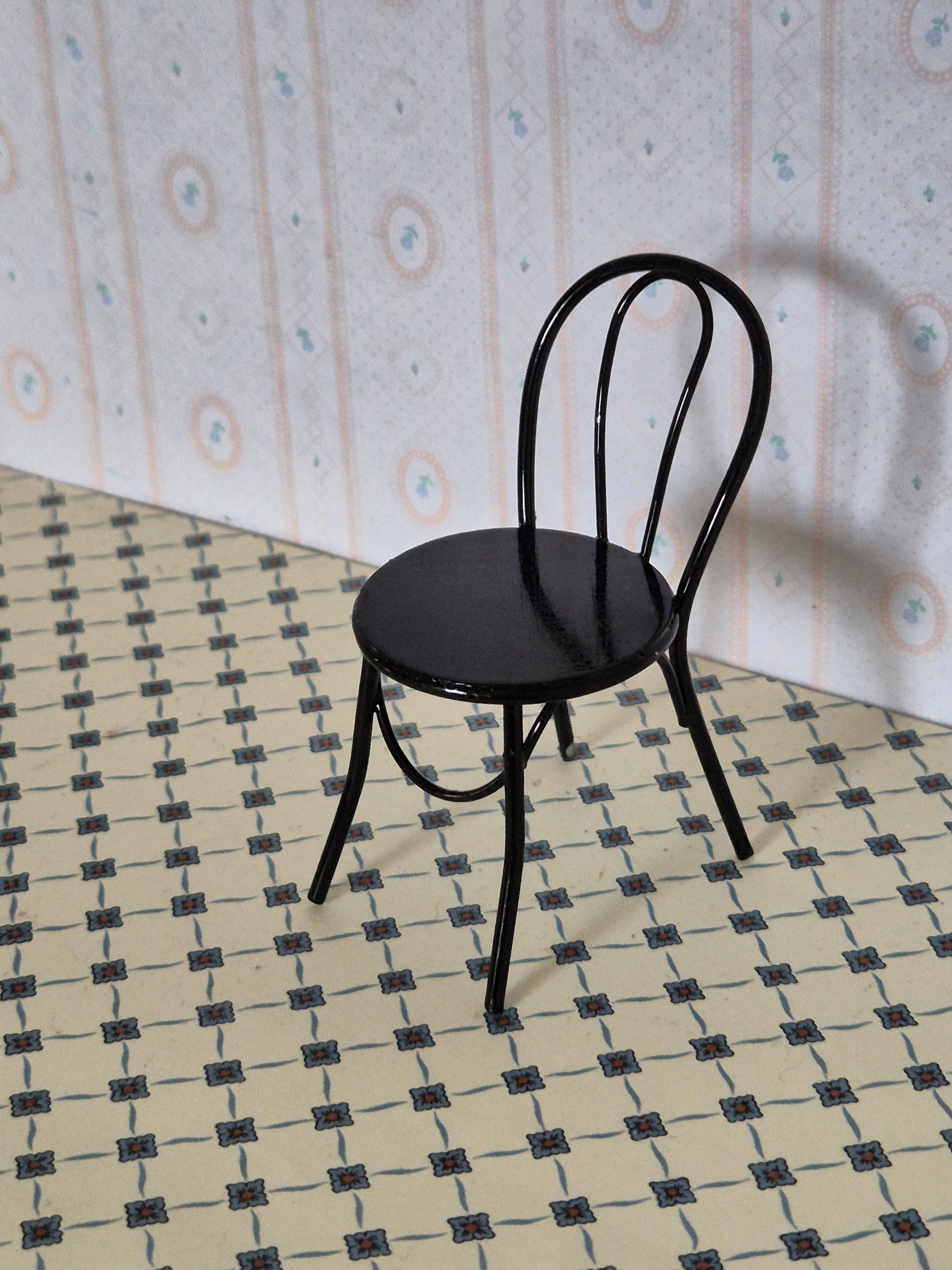 Pæn sort metal stol til dukkehuset. Udmærket og god stand.