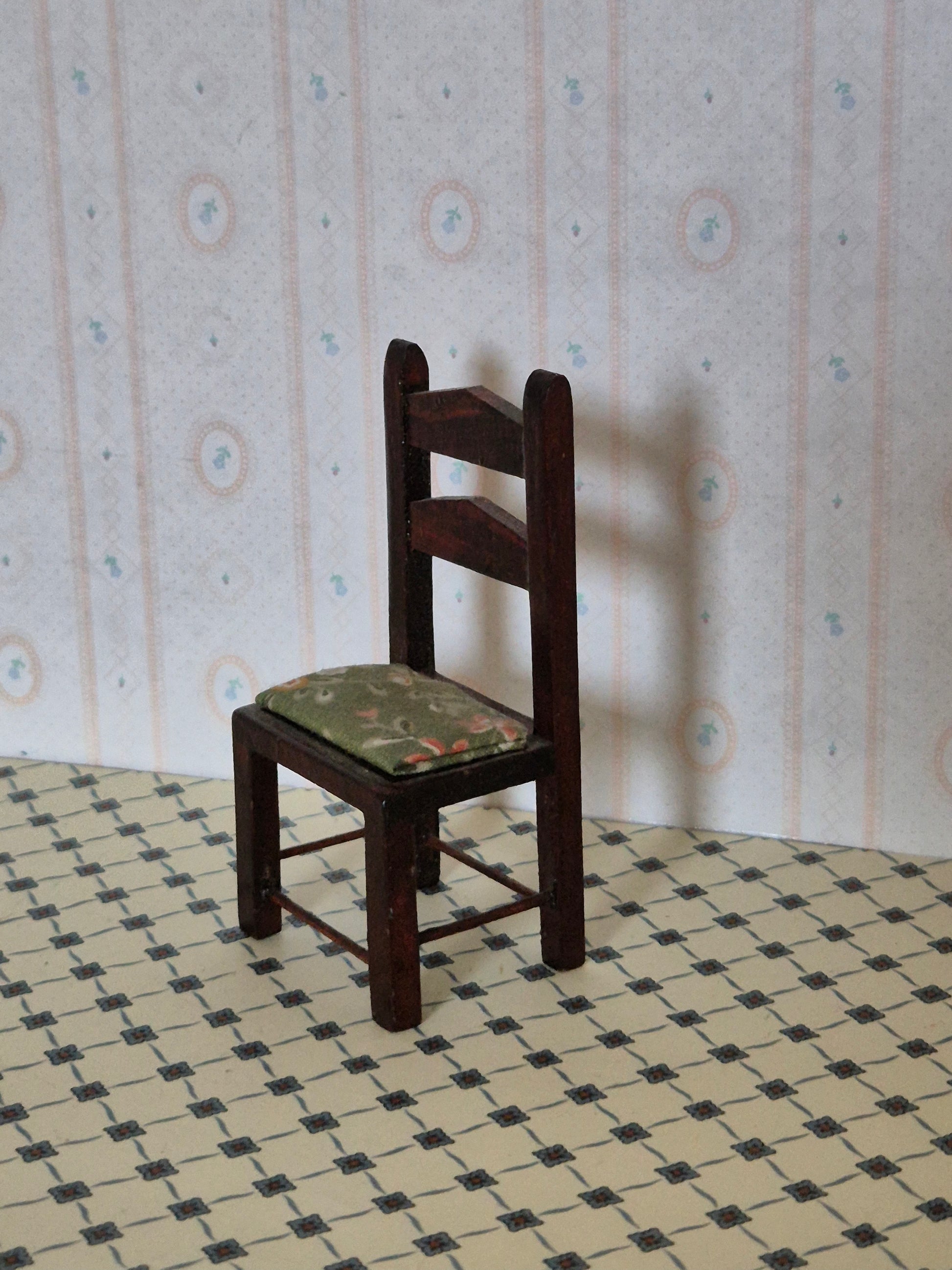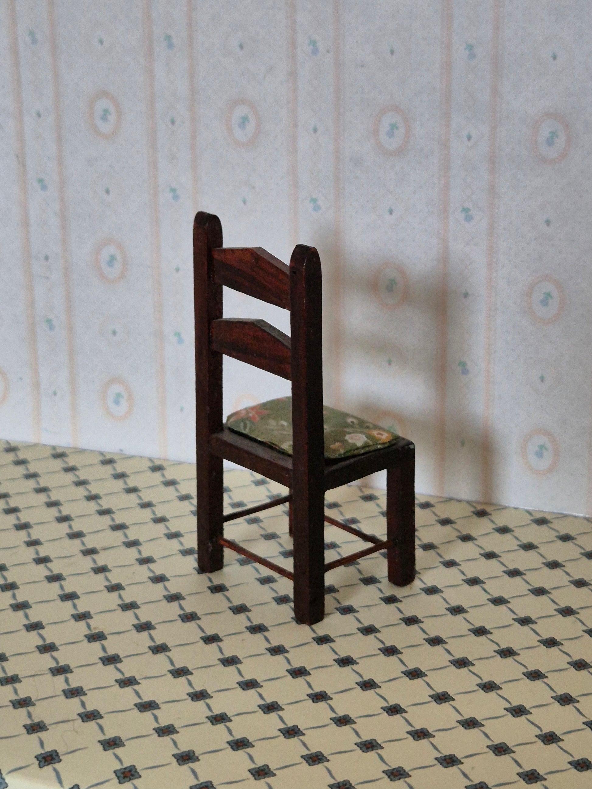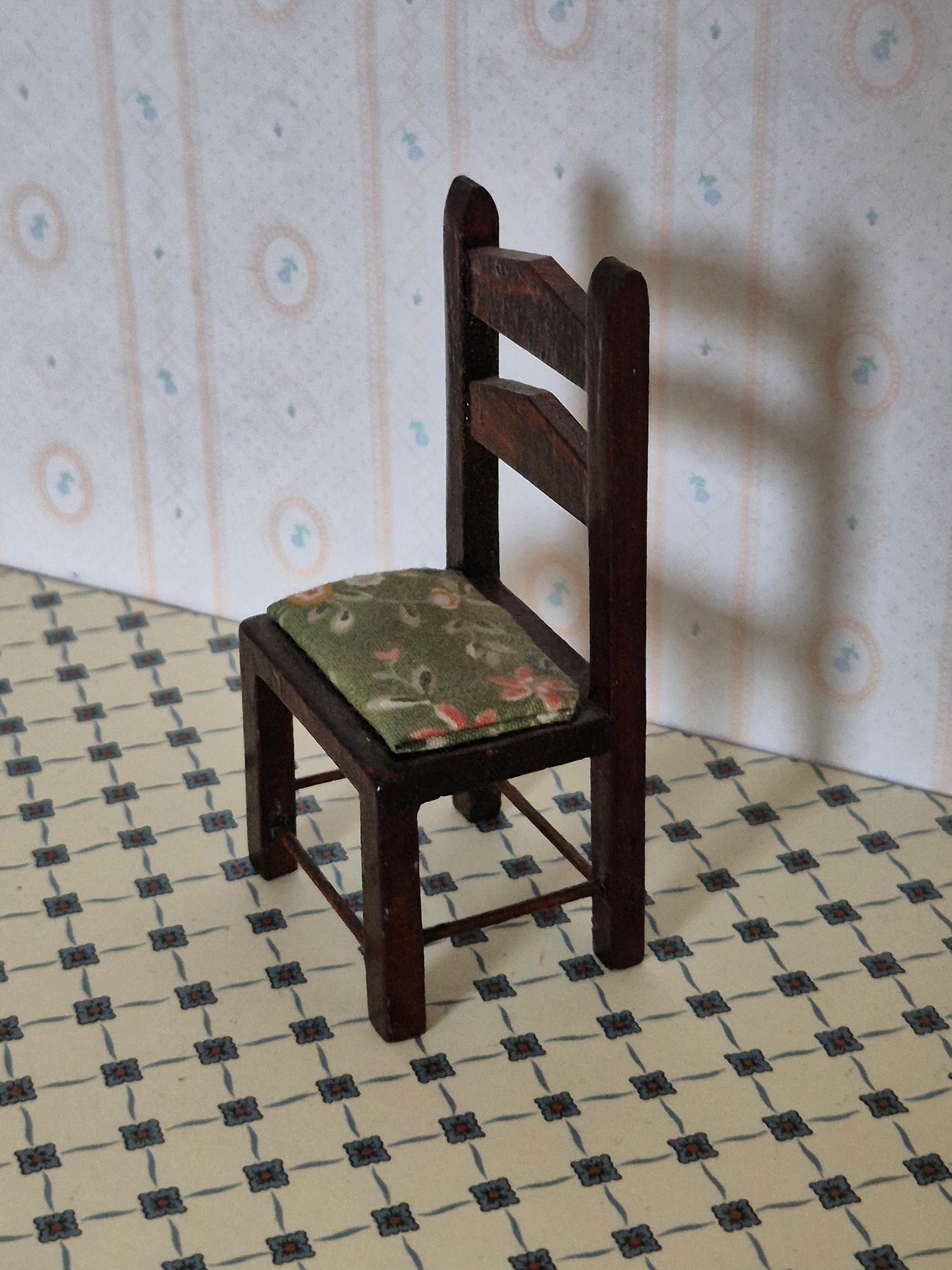 Vintage 1:12 stol. En anelse lav. Den har patina og brugsspor.