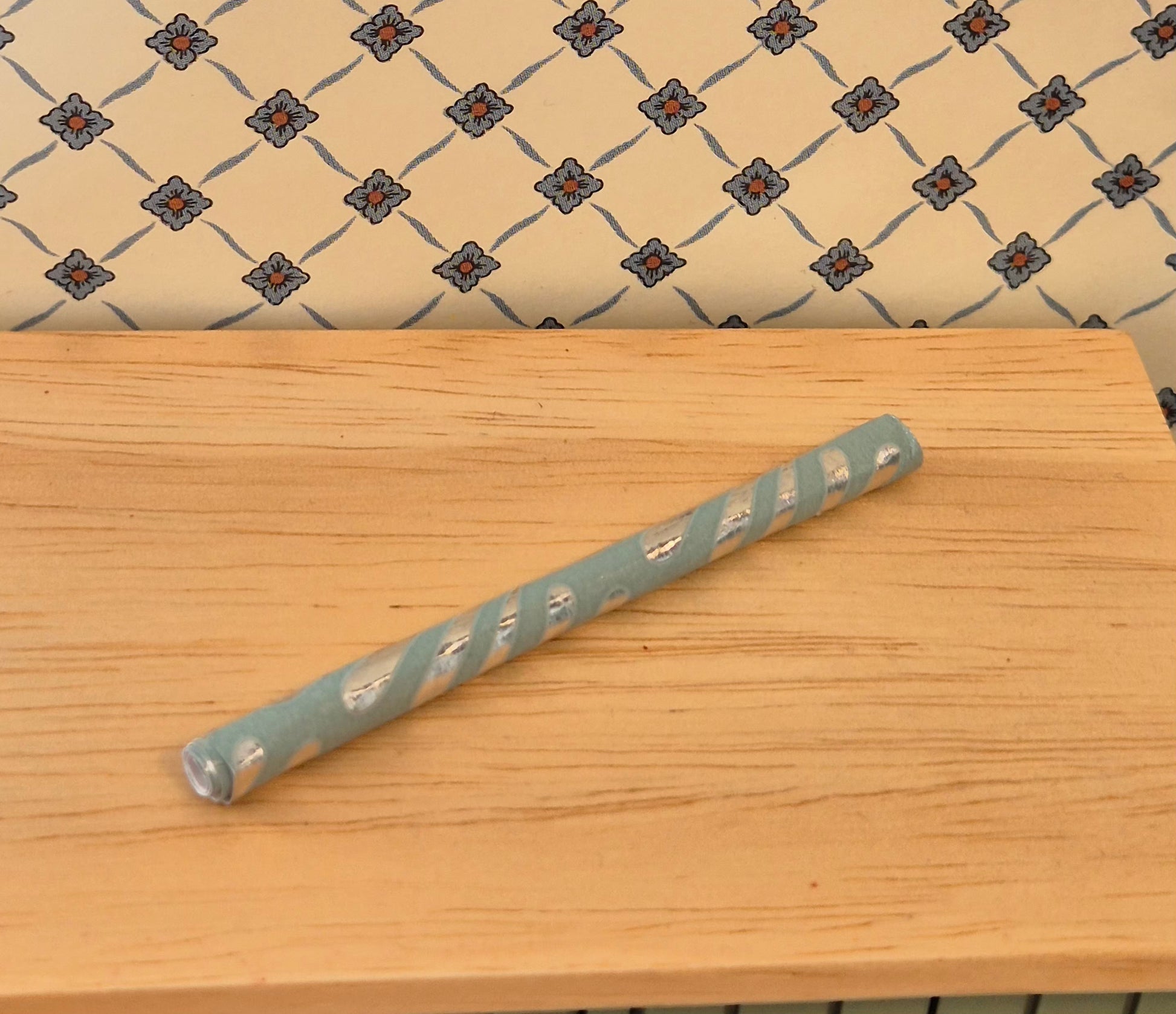 Pæn rulle gavepapir med skinnende mønster. Det er hjemmelavet. Den er ca 7 cm.