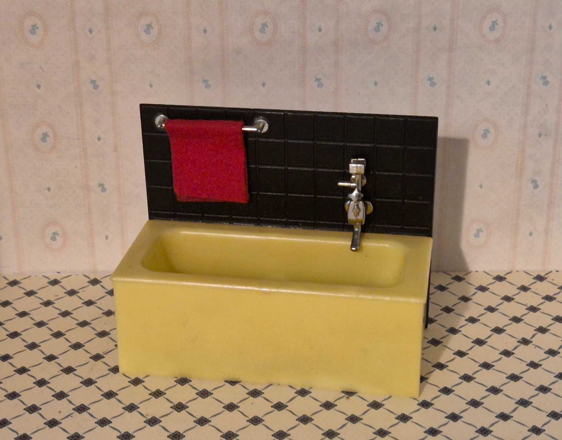 Pænt vintage badekar i gul og sort med rødt håndklæde af det danske mærke Hanse af Skandinavien. Det er plast med patina og brugsspor.
