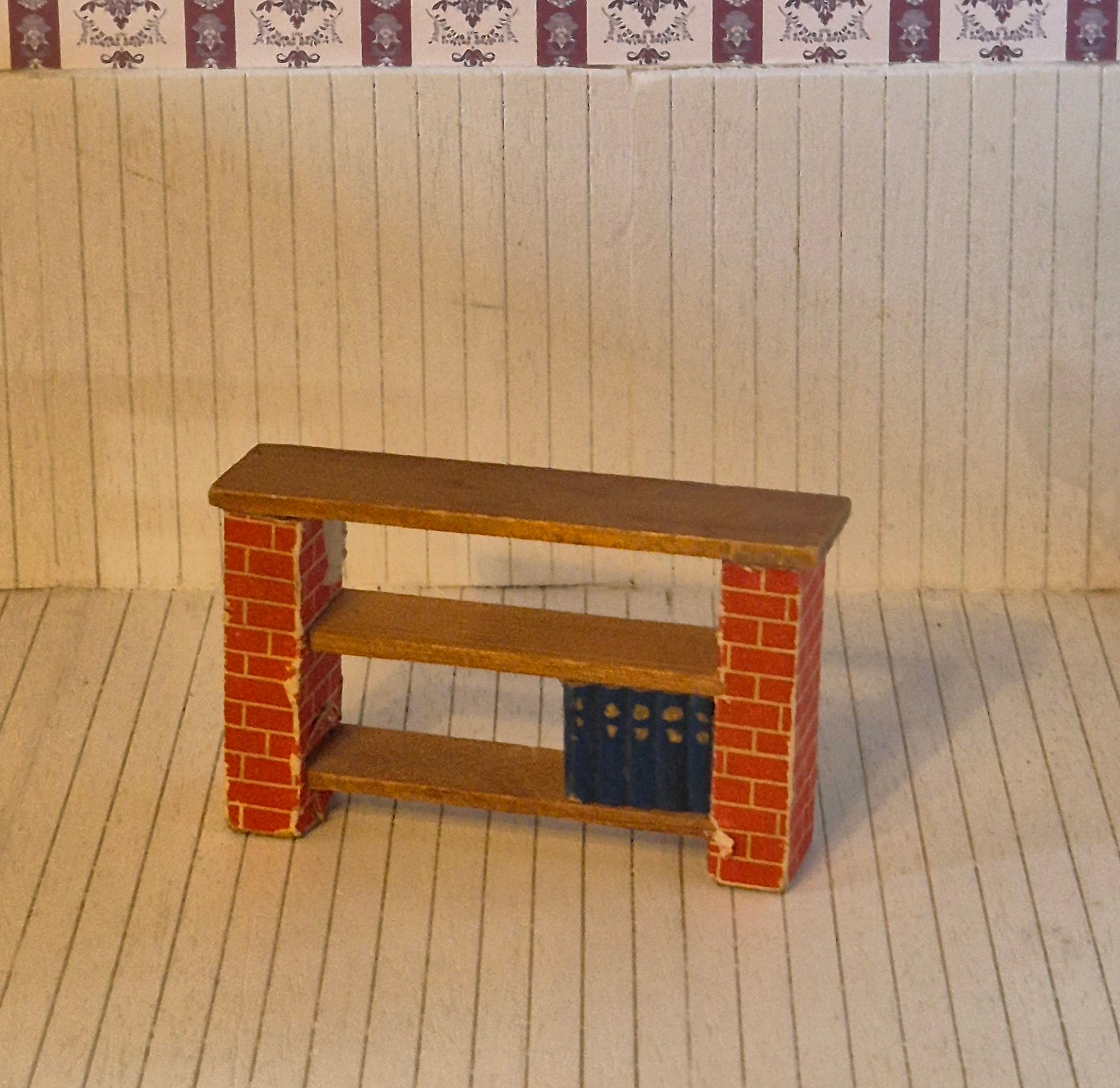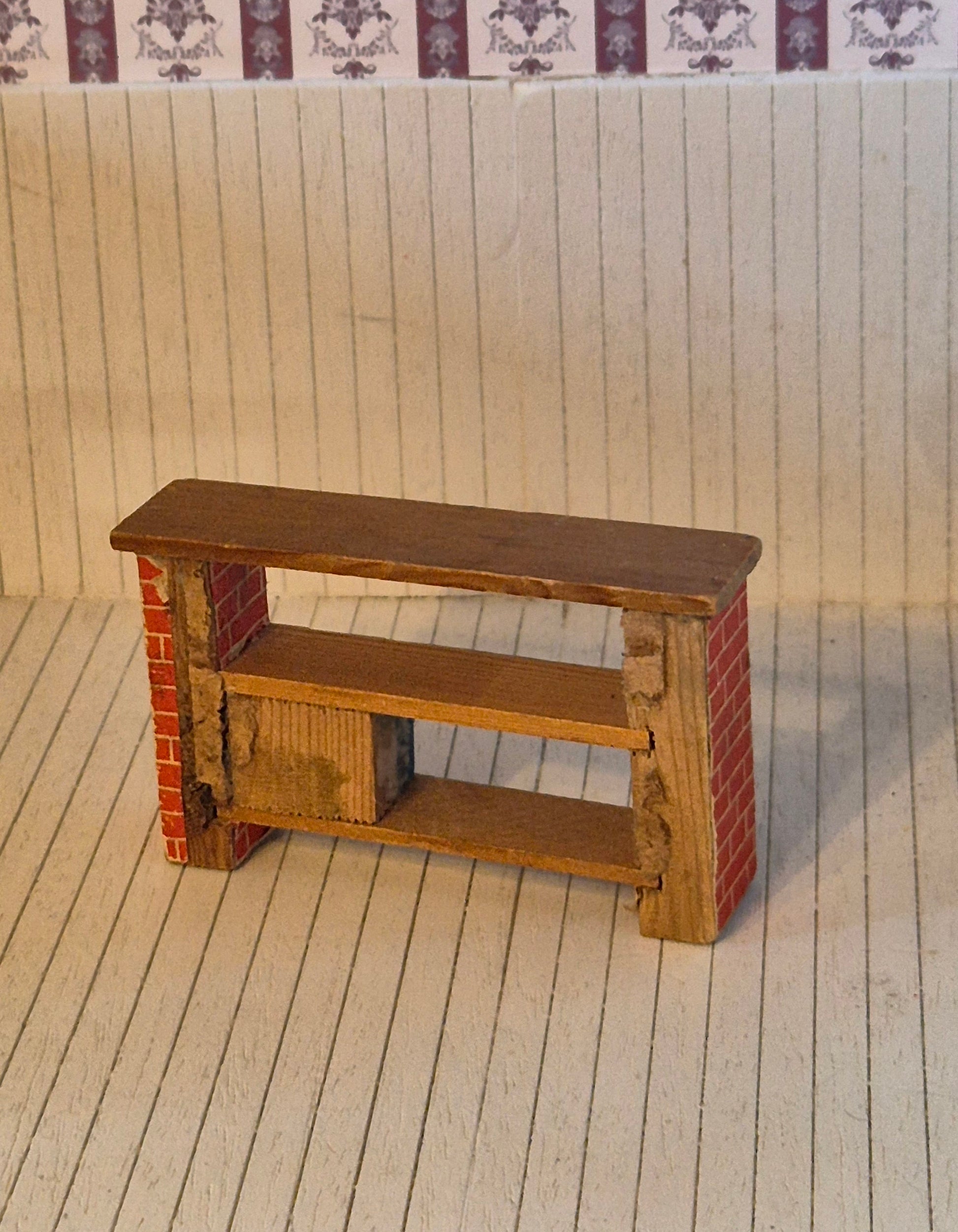 Ældre retro reol af træ med murstentapet, træ top og bøger. Den mangler bagbeklædningen. Der er patina og mærker da den er brugt og ikke ny.