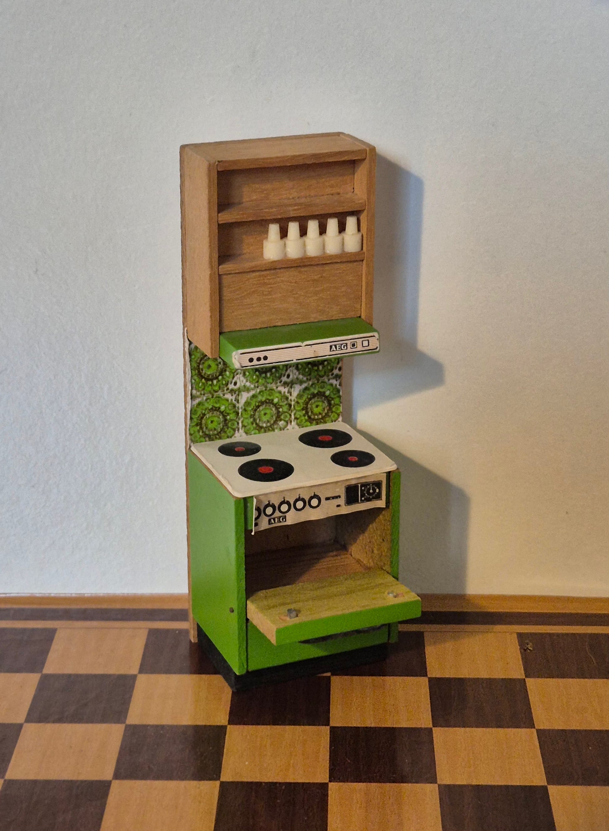 Pænt 1:16 komfur af mærket Lisa af Danmark - deb ældre model fra starten af 1970erne. Udmærket stand, intakt med tegn på patina