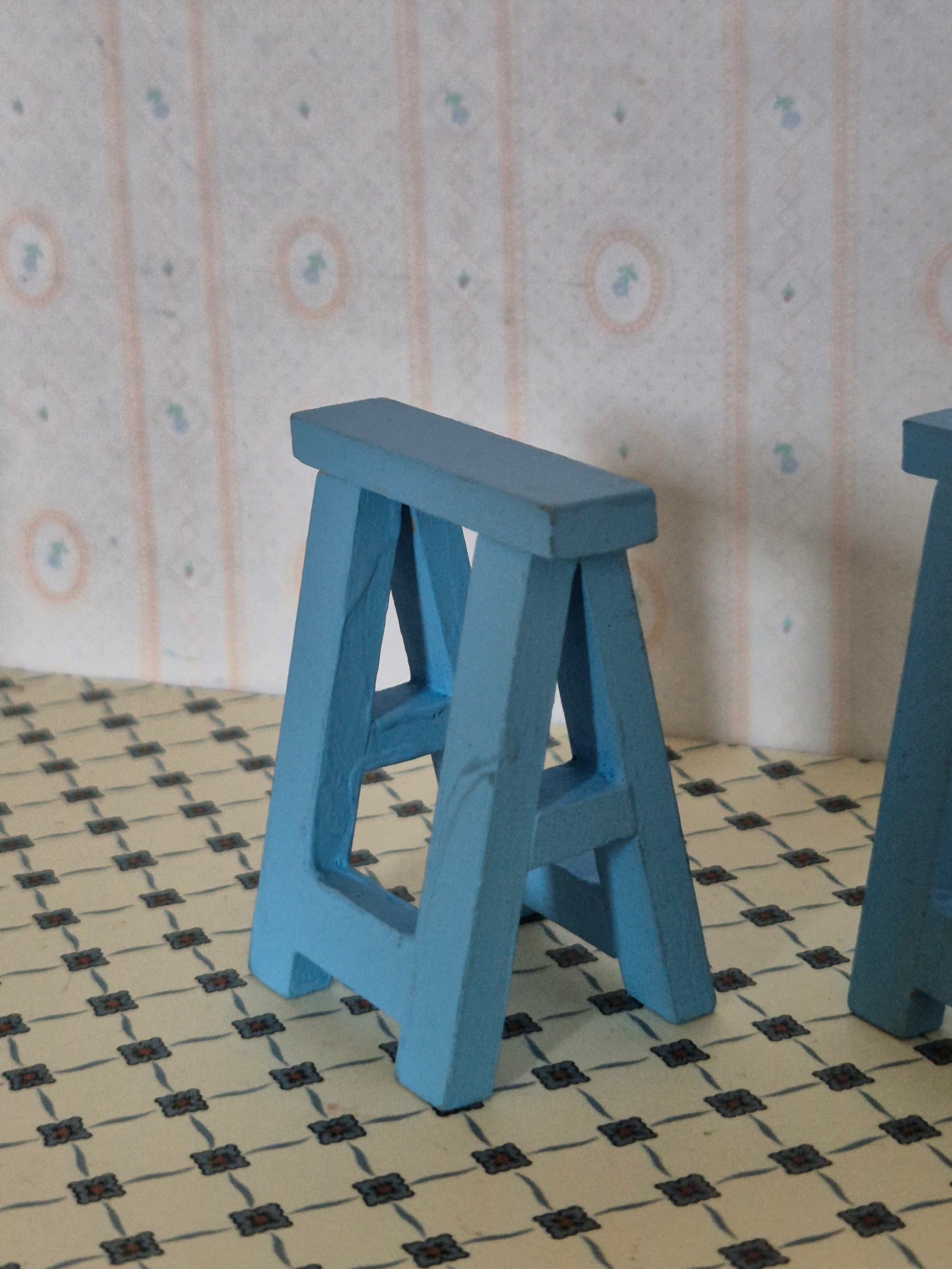 To Lundby bordben (bukkeben) af træ, der er malet lyseblå. Pæn stand.