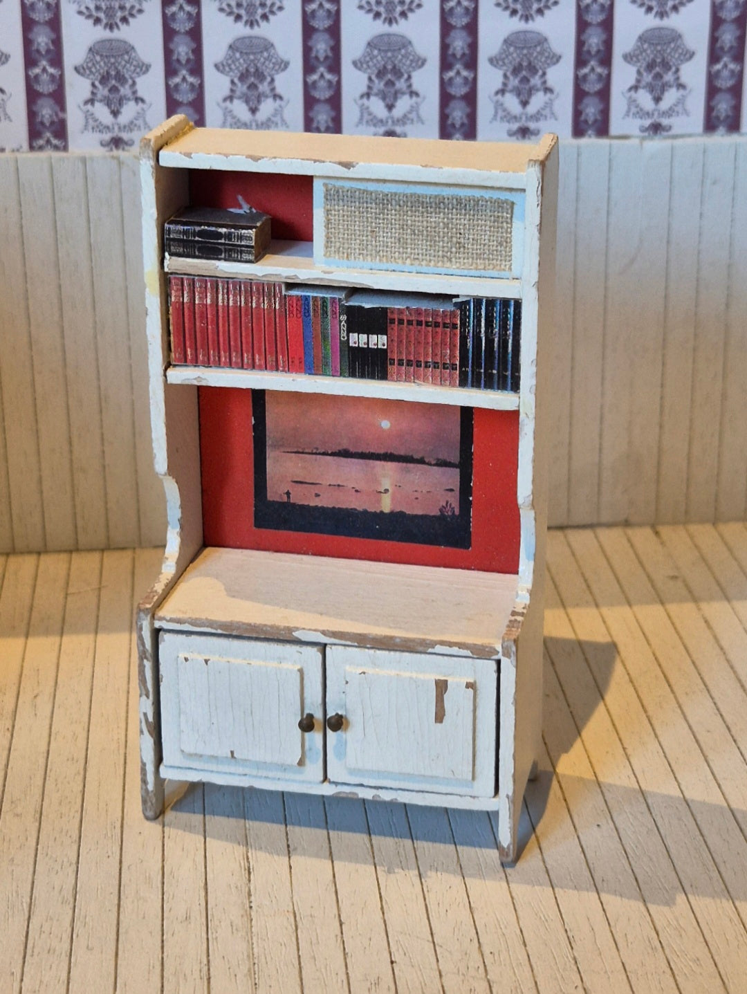 Ældre Lundby reol med en del slidmærker, brugsspor og patina.