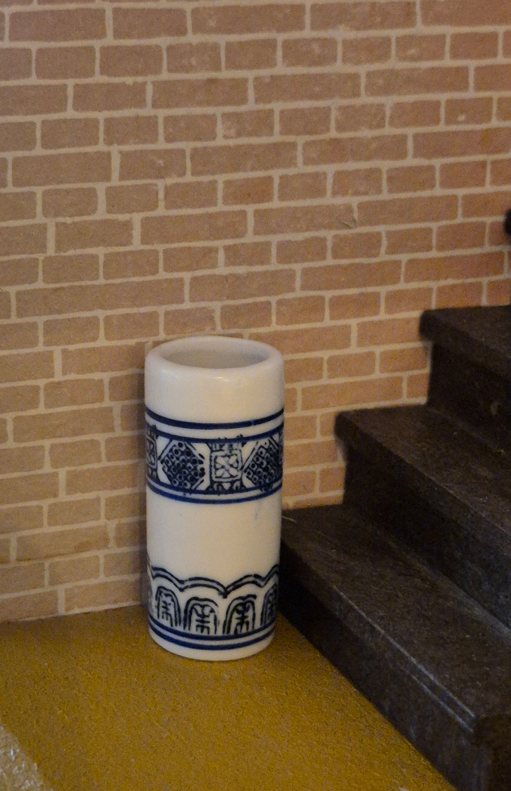 Paraply holder af porcelæn med blåt mønster-motiv. Den er brugt men pæn.
