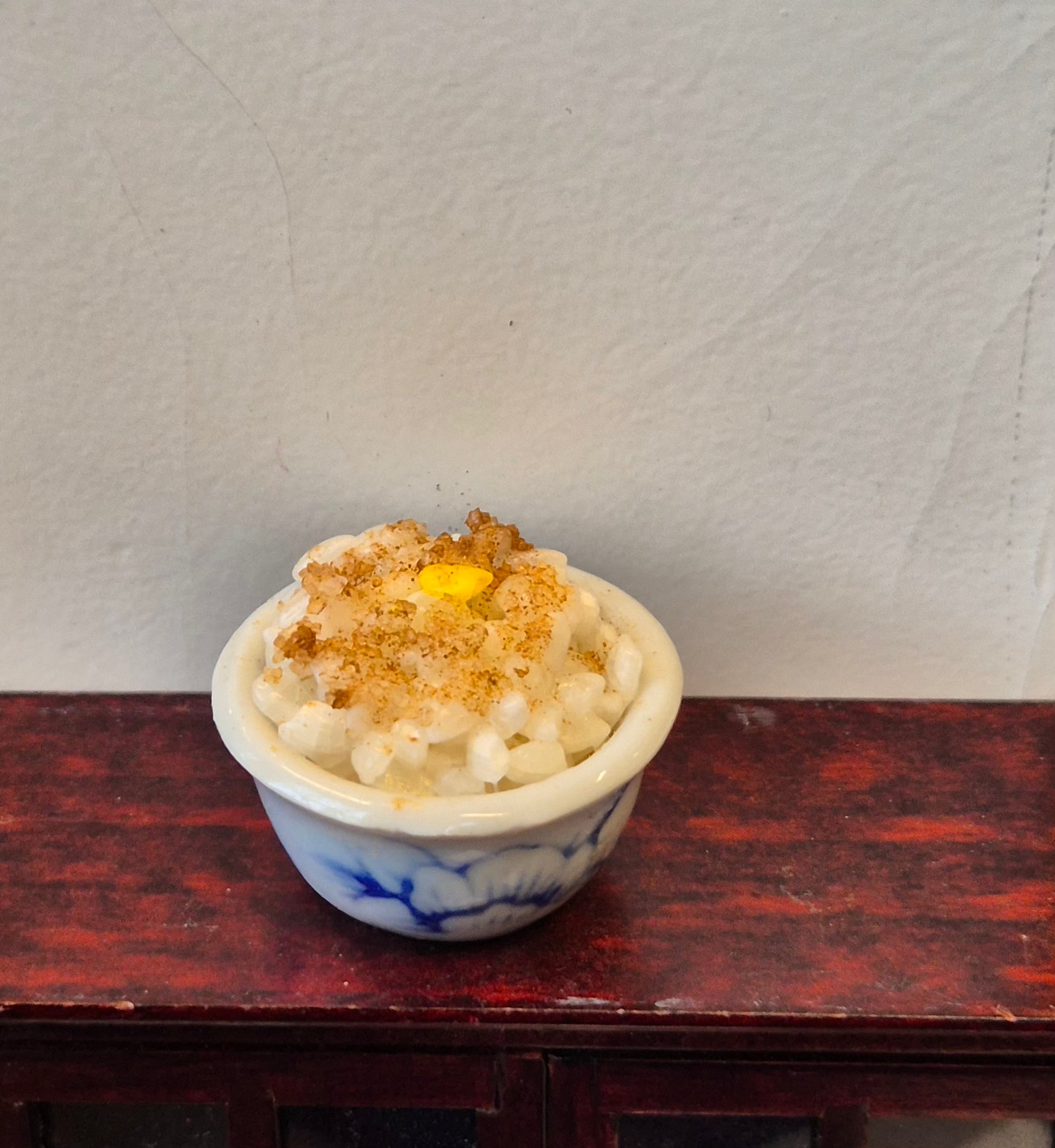 God porcelæns skål med risengrød (hjemmelavet). Den passer bedst til 1:12.