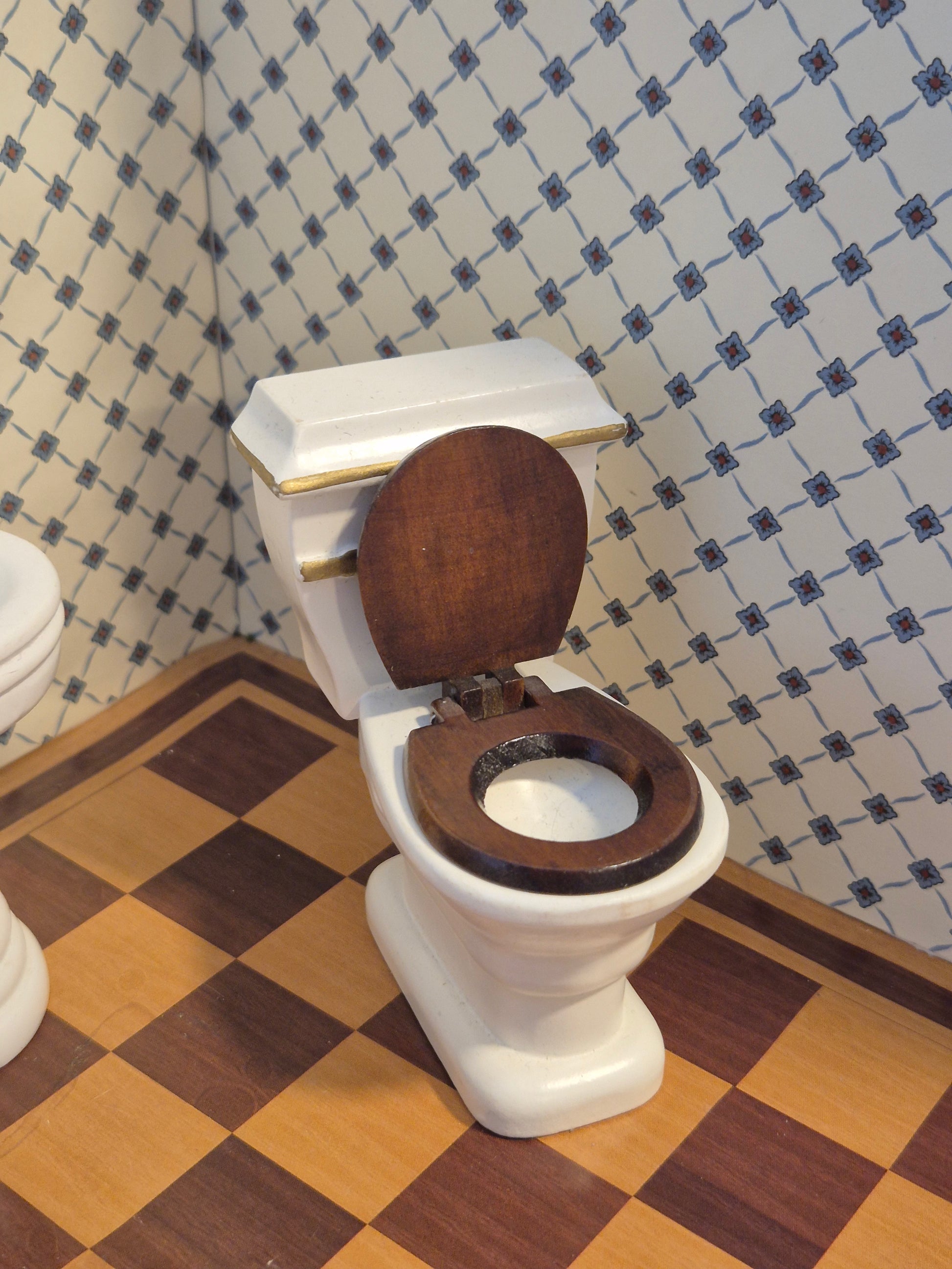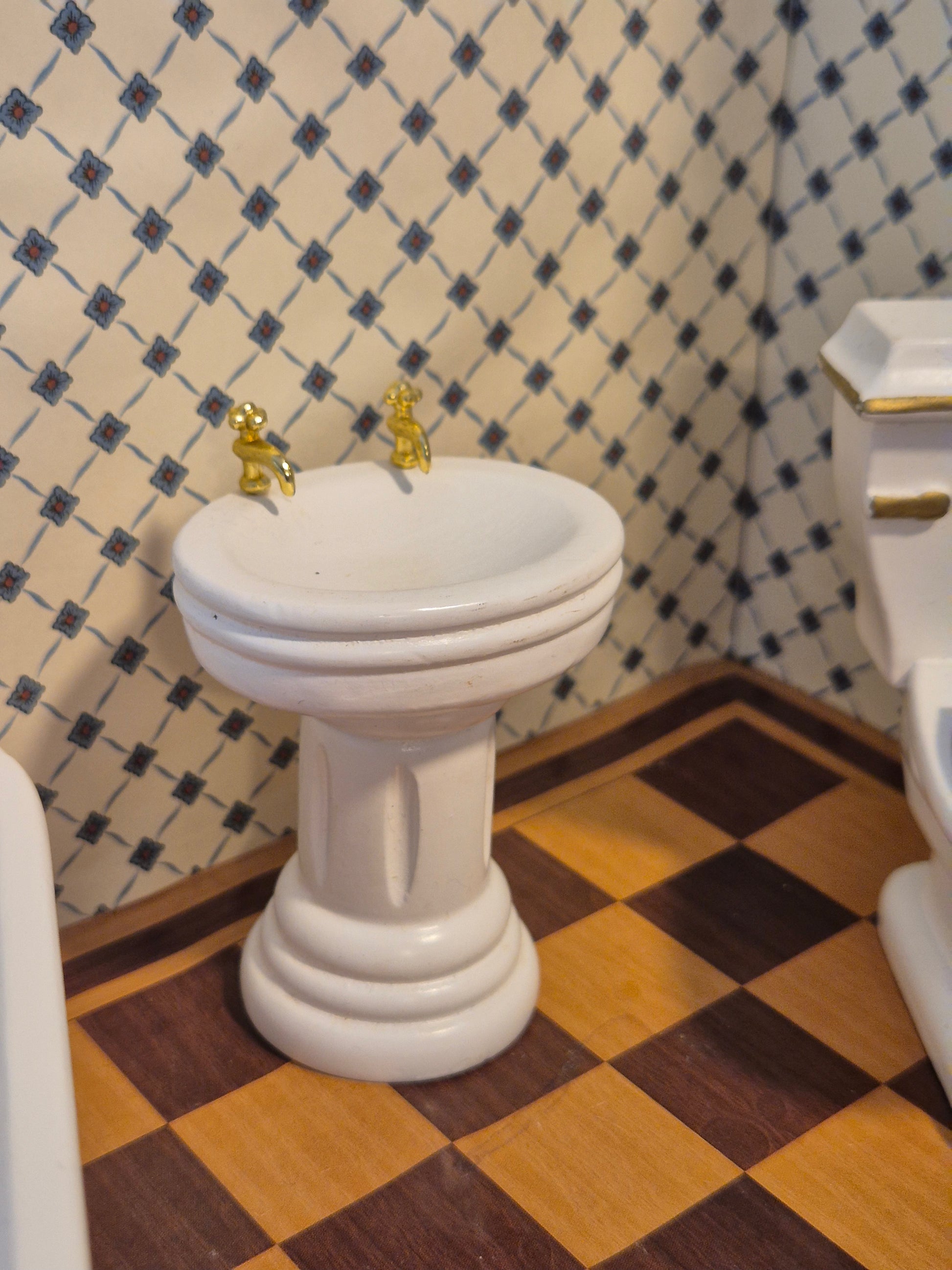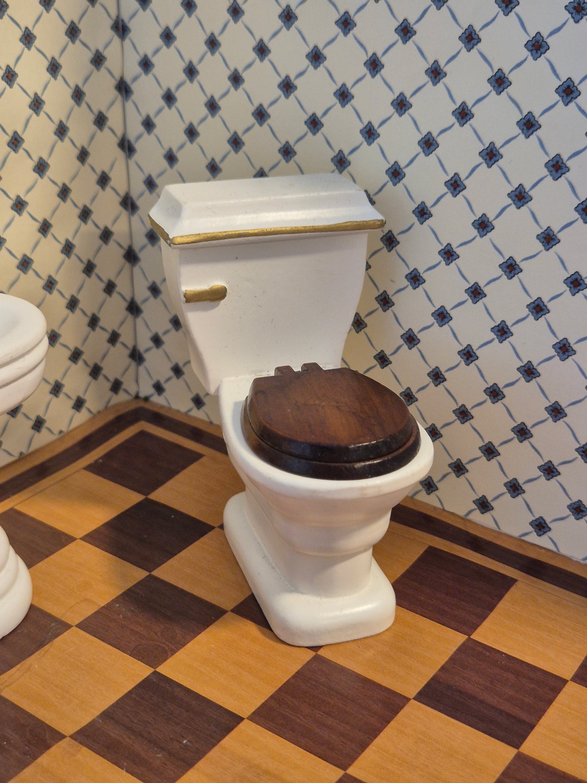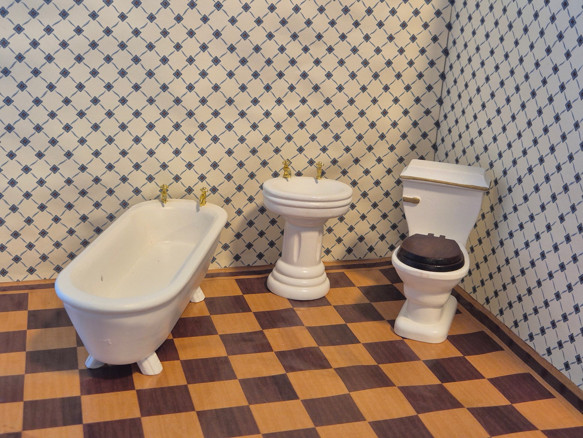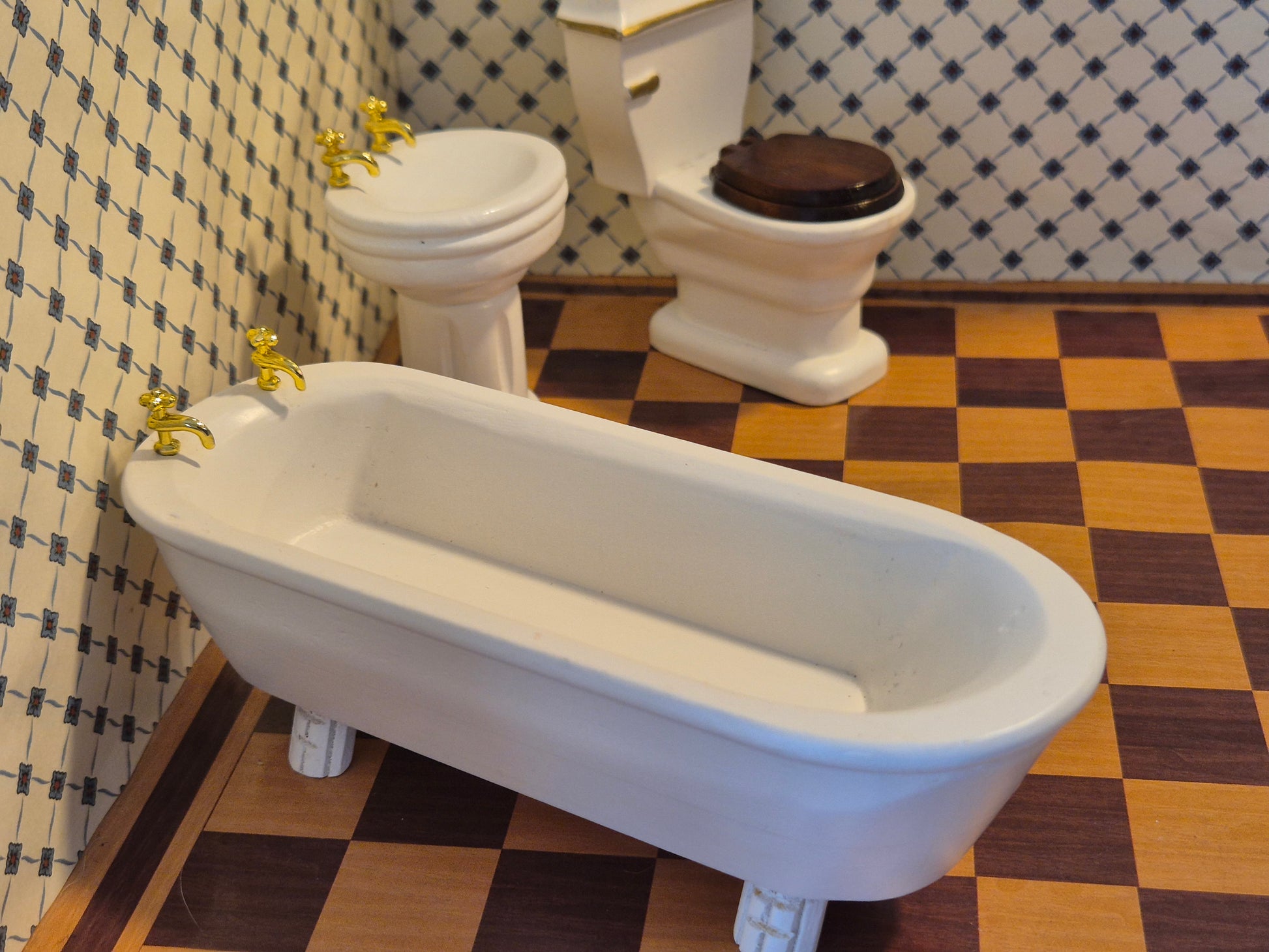 Godt 1:12 badeværelse af hvidt træ med toilet, håndvask og badekar.