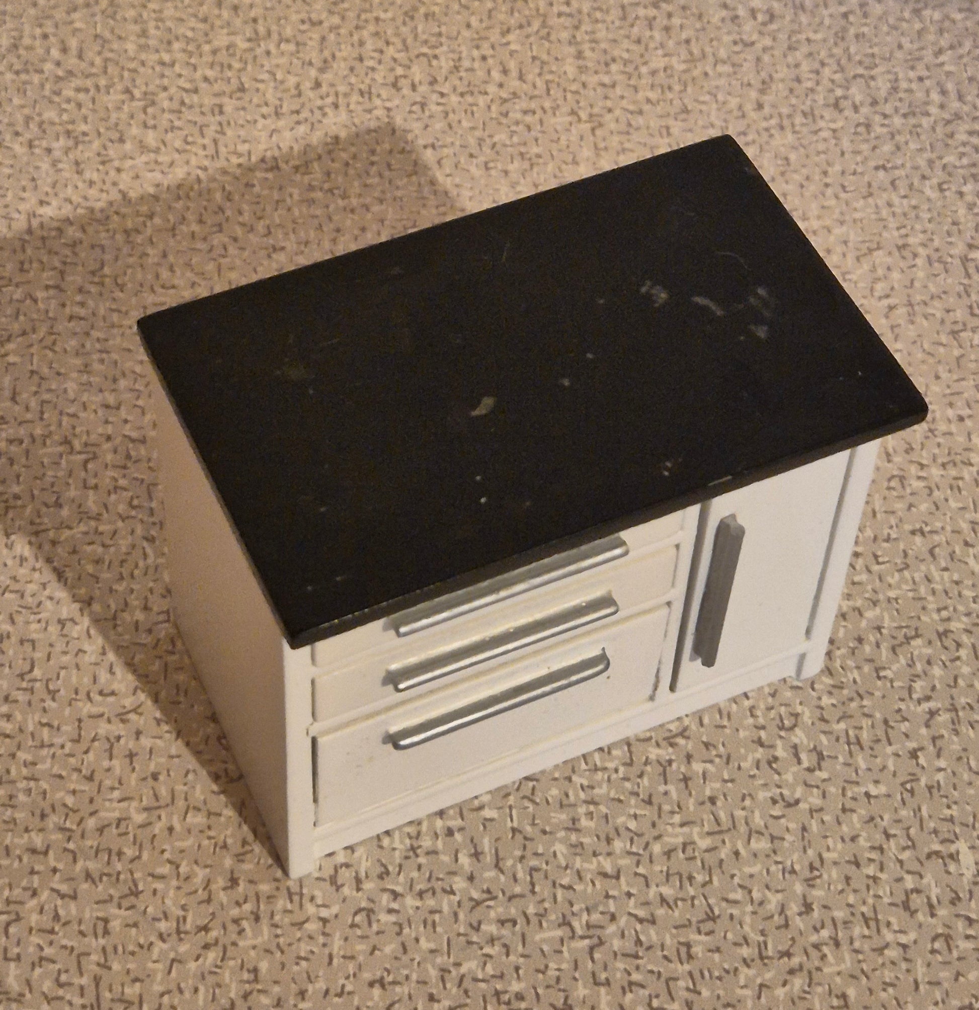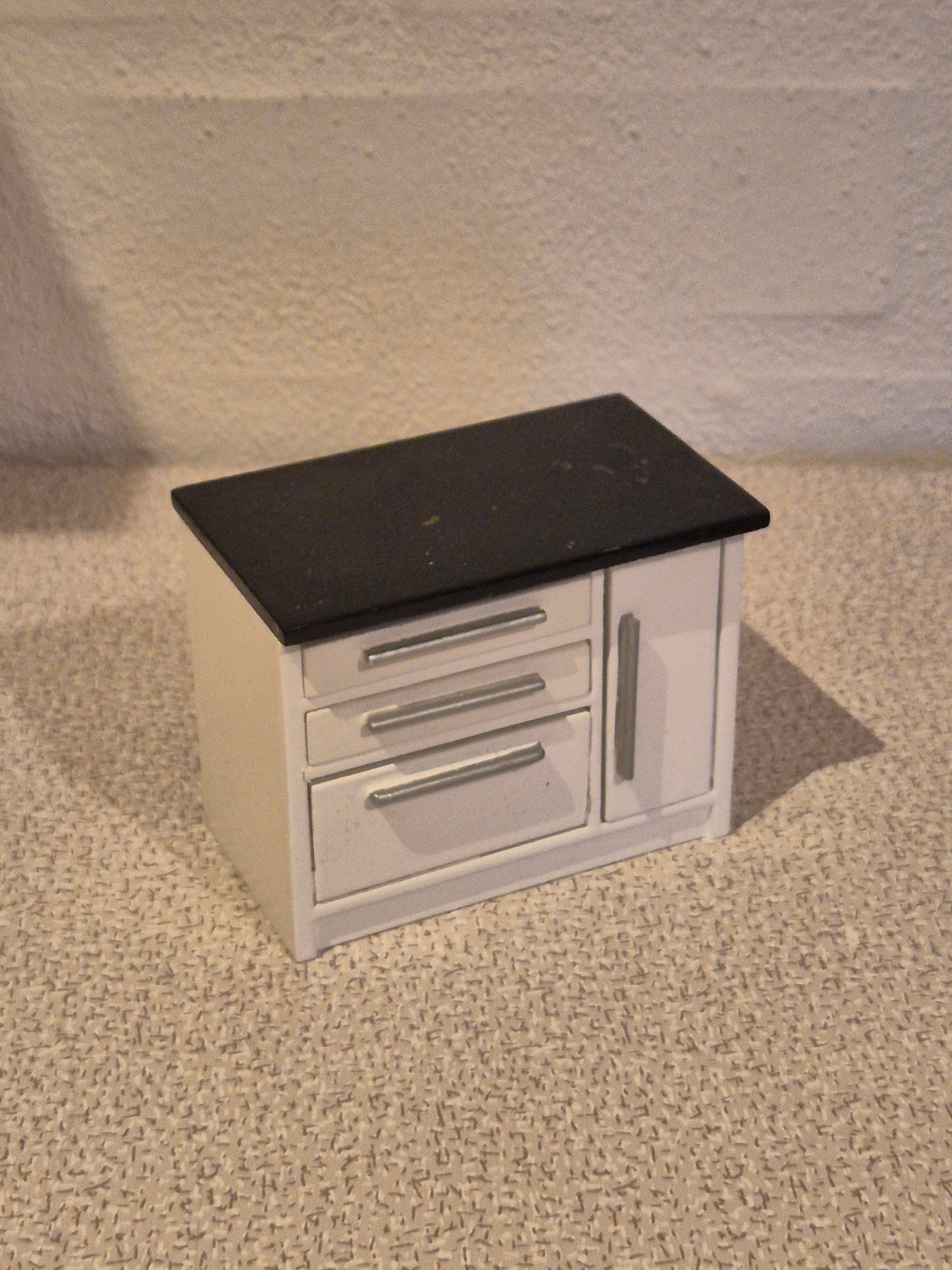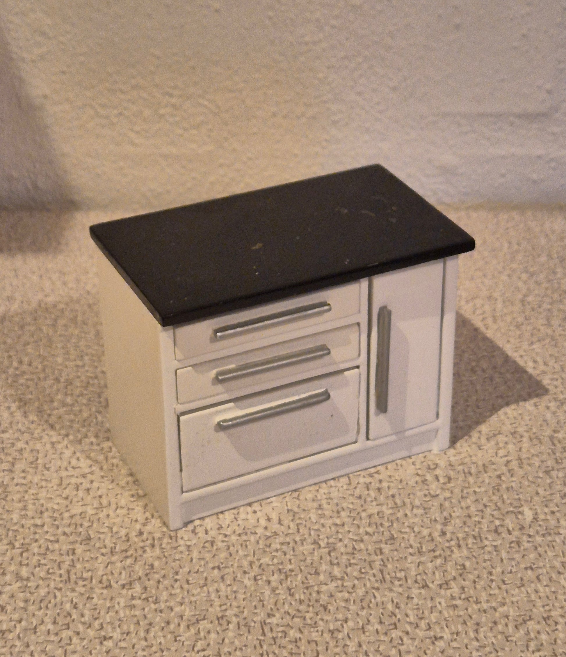 1:12 køkken element, bordplade enhed med skabe og skuffer i hvid træ og med sort bordplade.