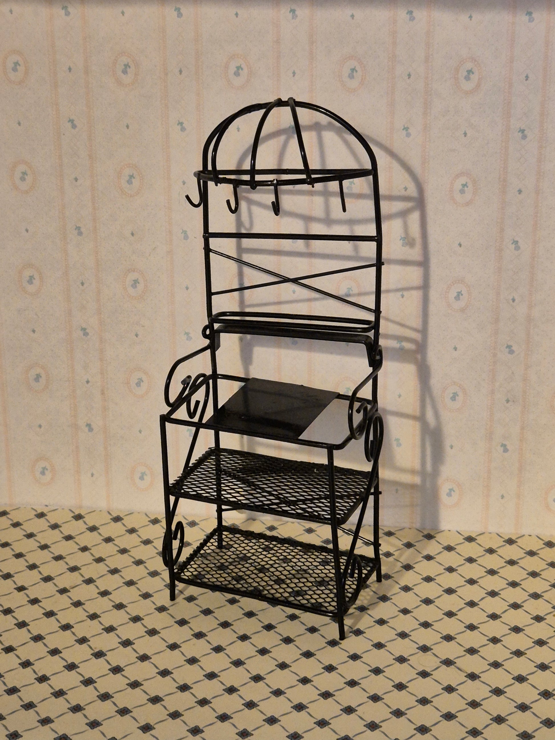 Sort metal køkkenreol med hylder og kroge. Den er skæv og bøjet, primært øverste del. Der mangler en bordplade.