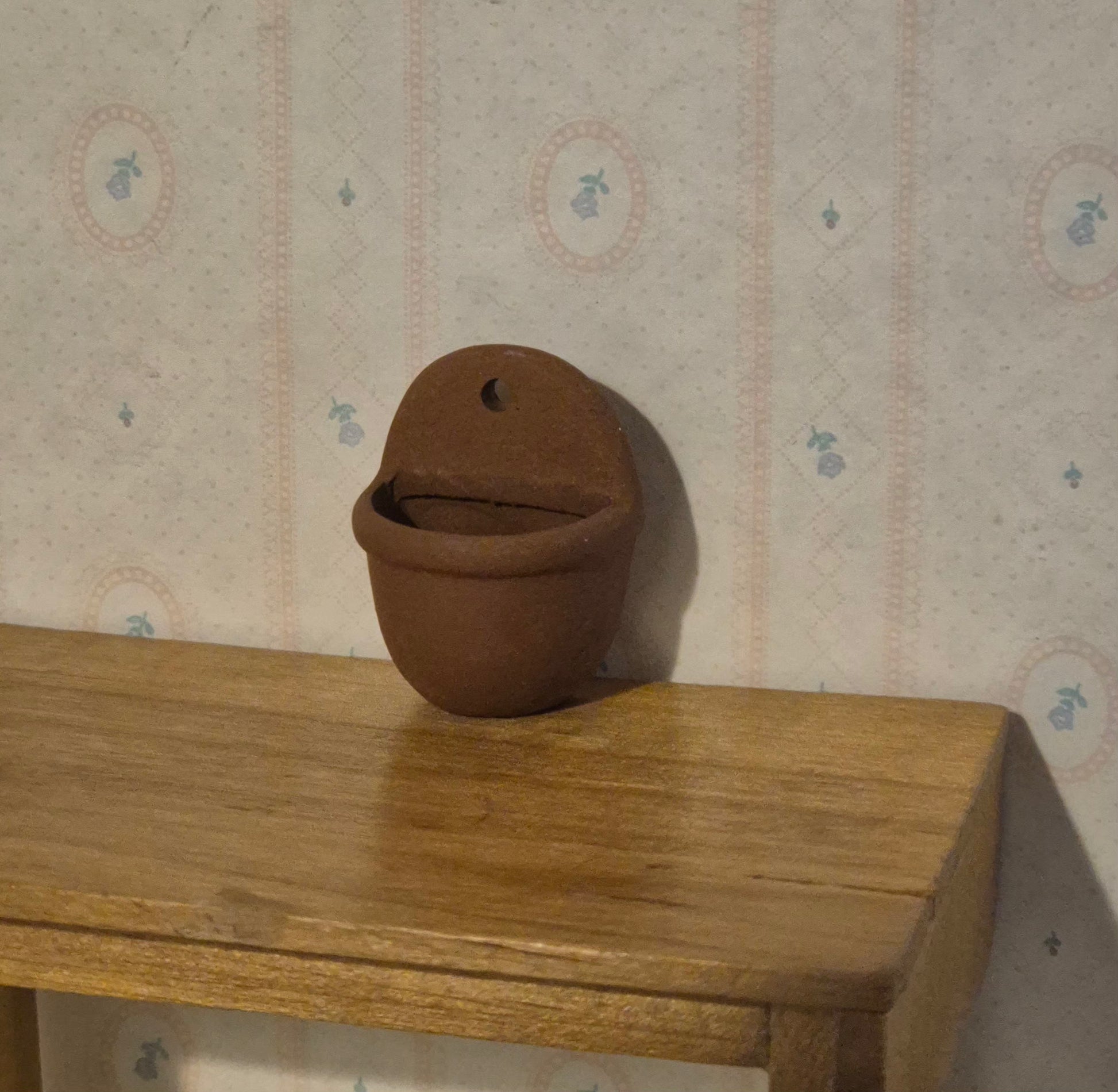 1:12 - 1:10 mørkebrunt rustikt terrakotta saltkar til vægophæng. Udmærket stand.